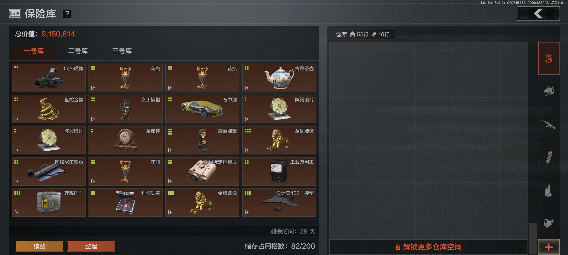 仓库价值25.4M 柯恩币102456K 金枪4 空腔战术 热能补牢 苍穹利