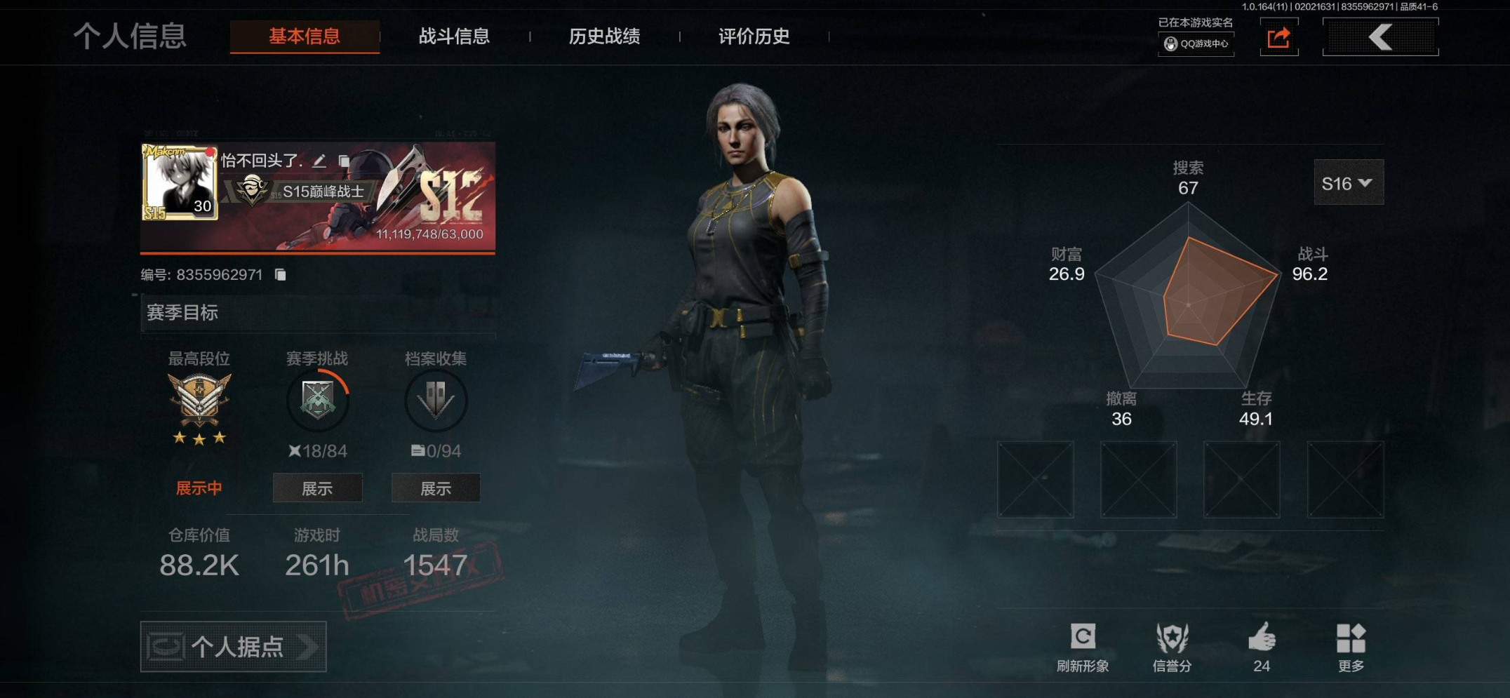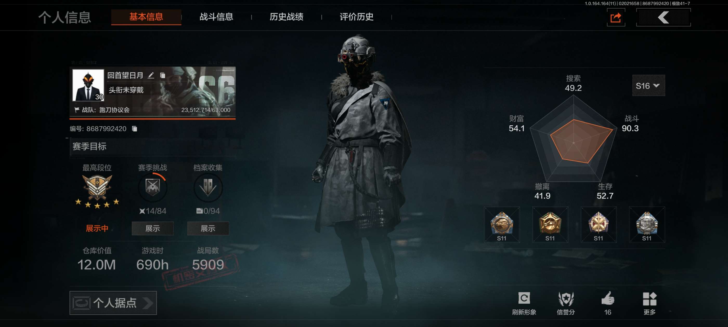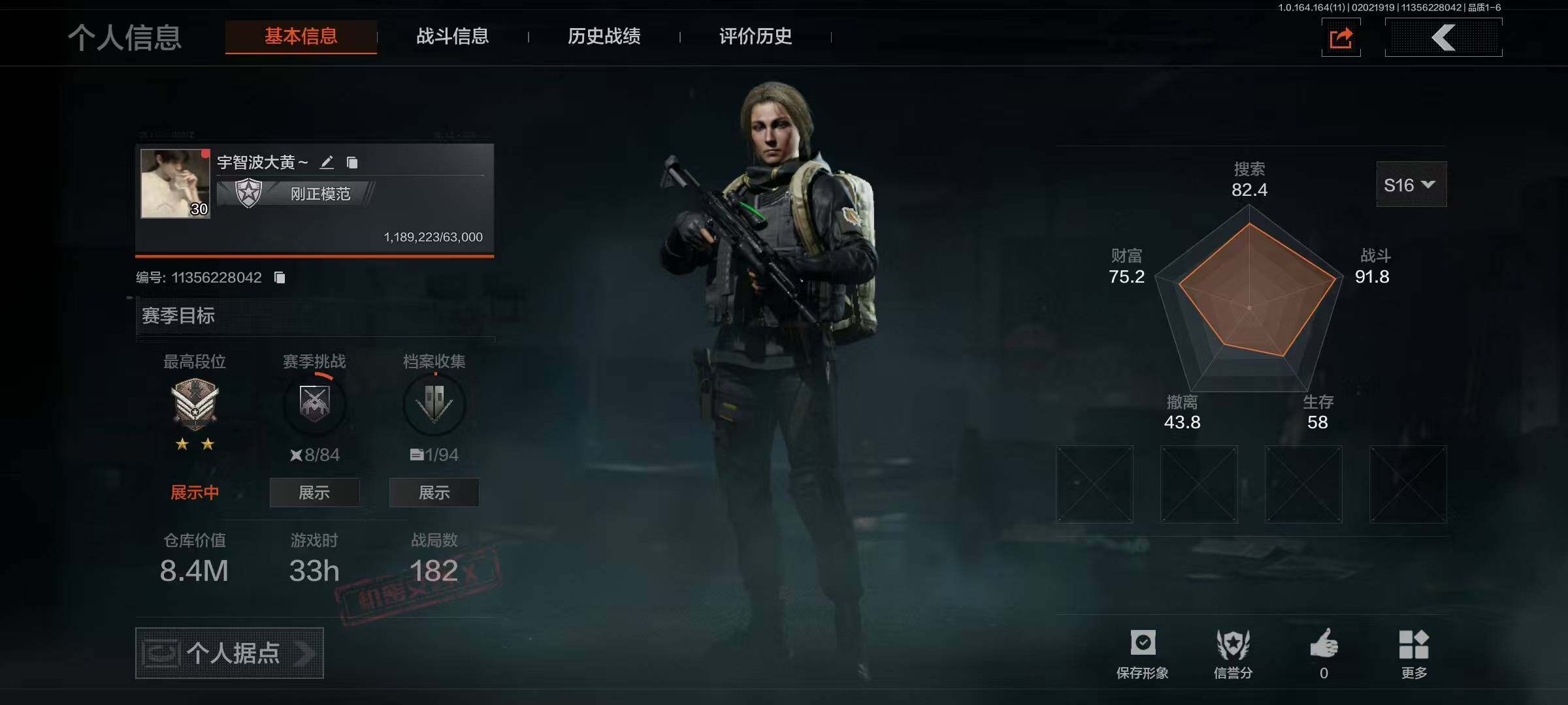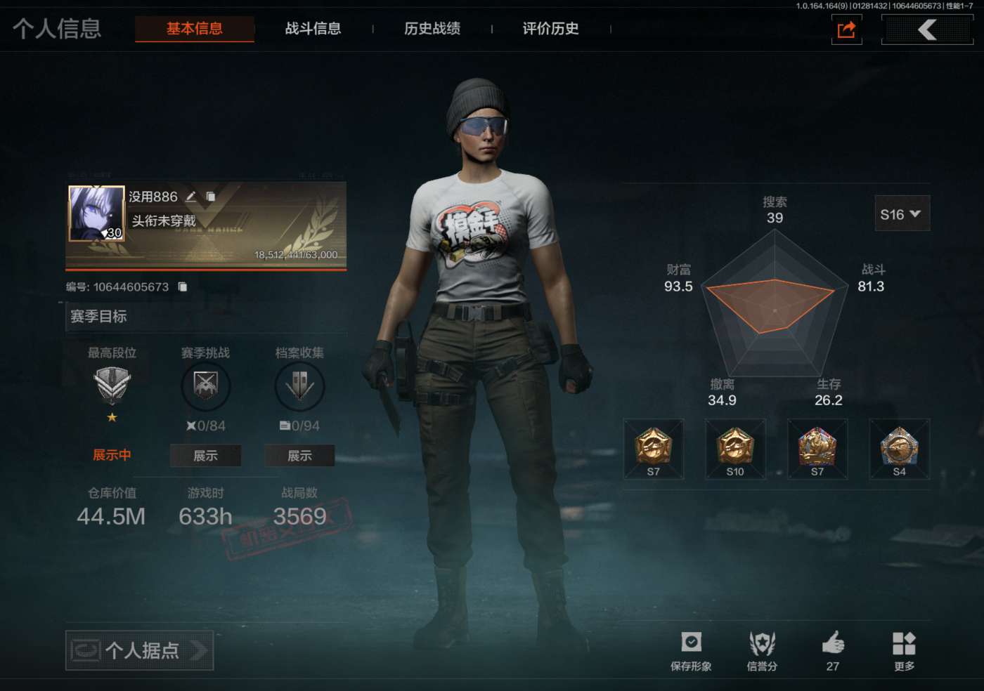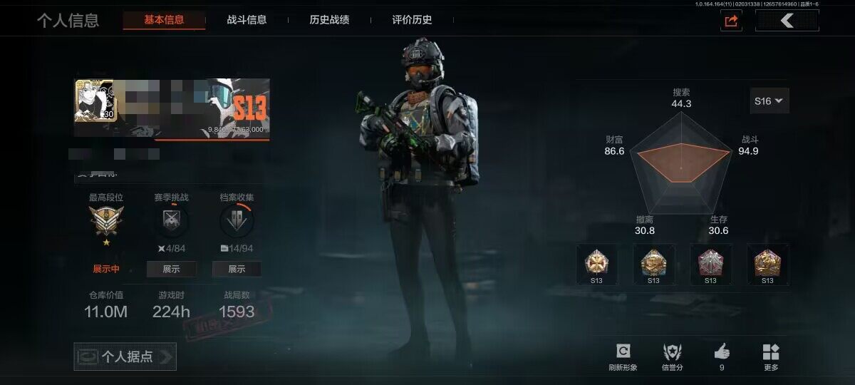 等级:30/段位:王牌/仓库价值(百万):11/柯恩币:2868/