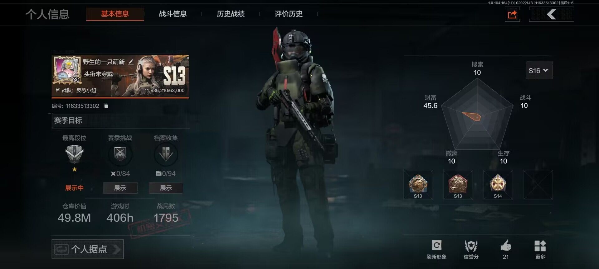 等级:30/段位:新锐/仓库价值(百万):49.8/柯恩币:12200000/