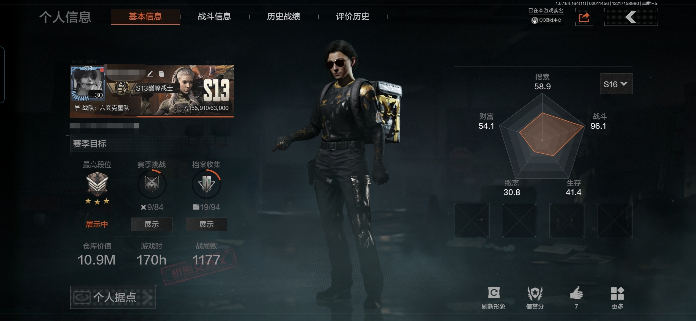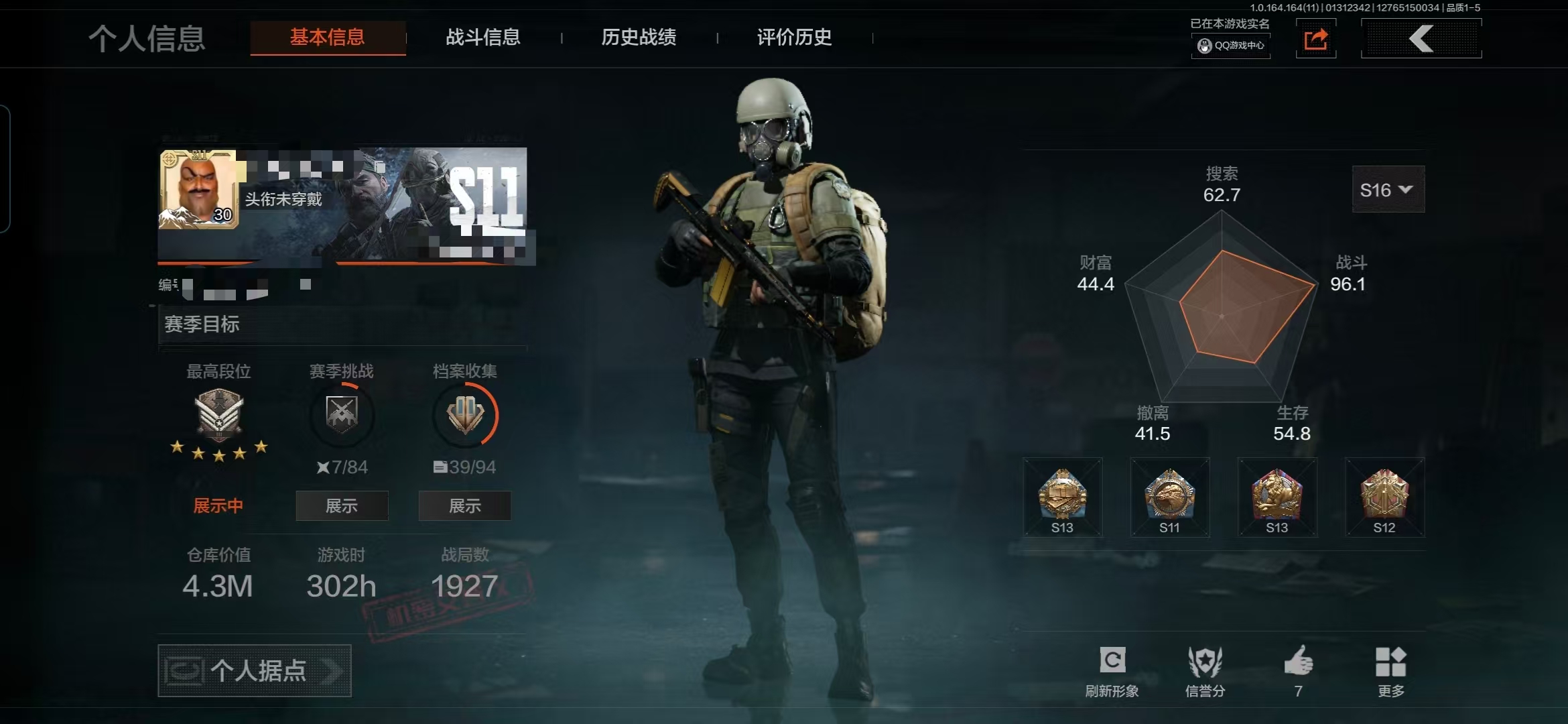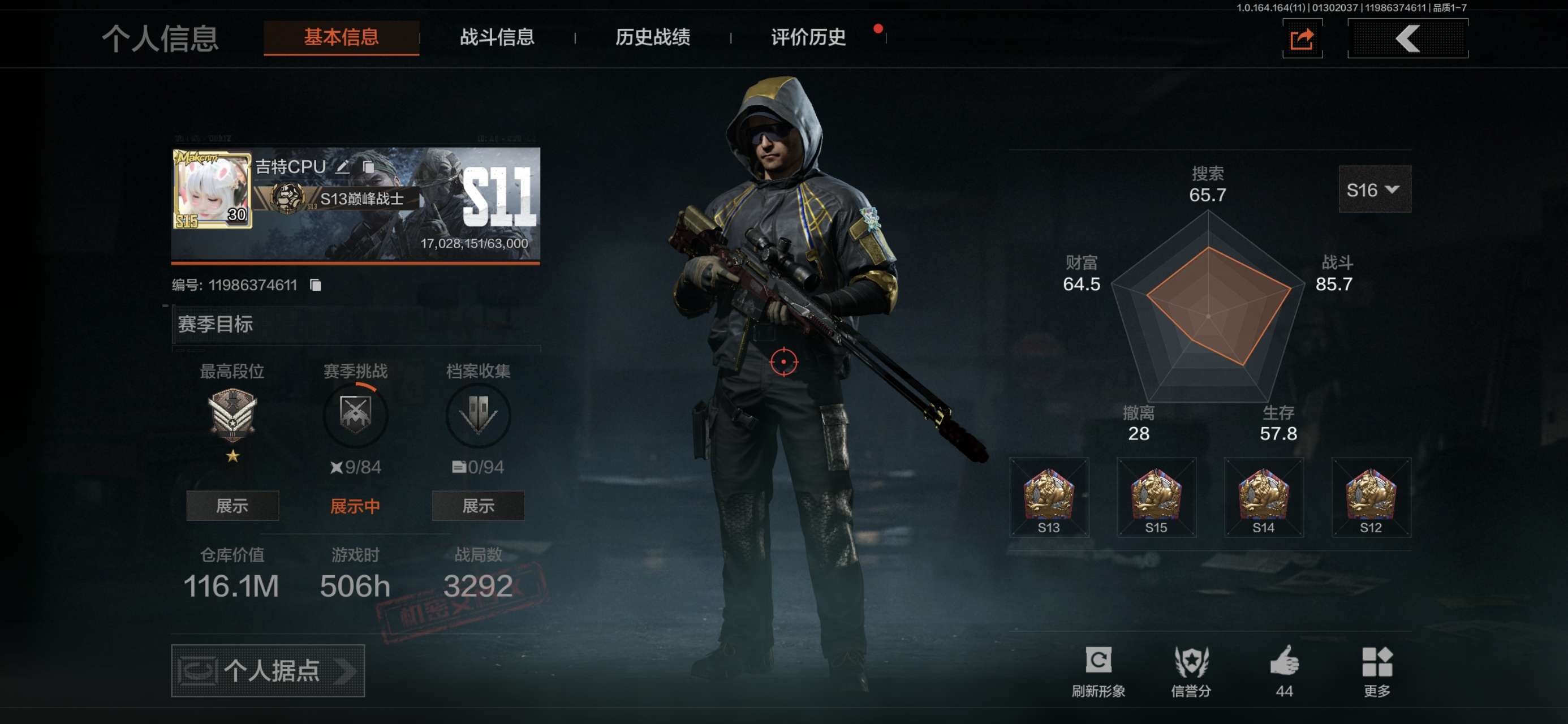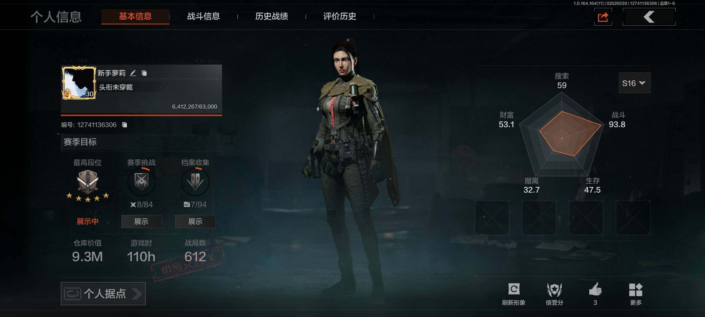 等级:30/段位:暗区传说/仓库价值(百万):9.3/柯恩币:315329/