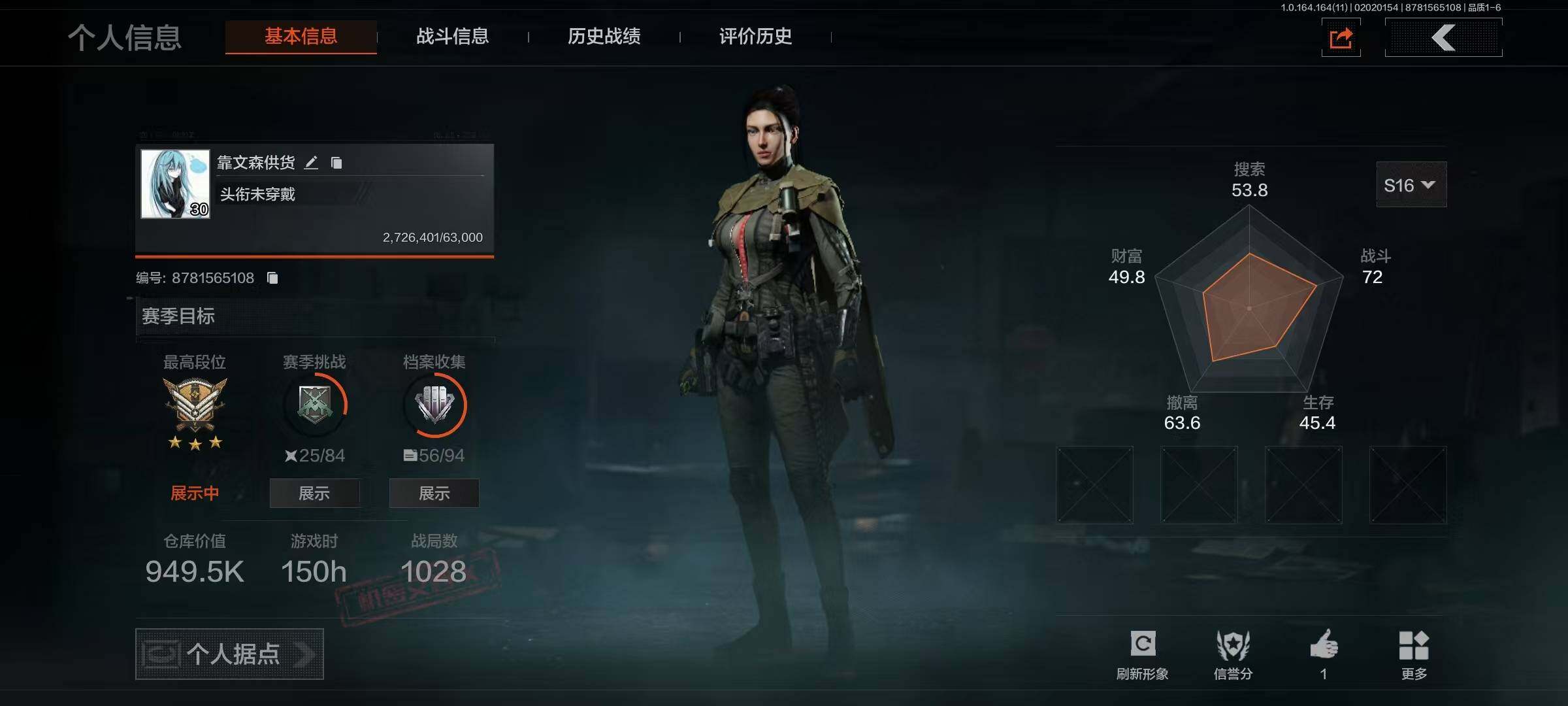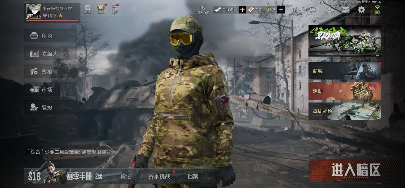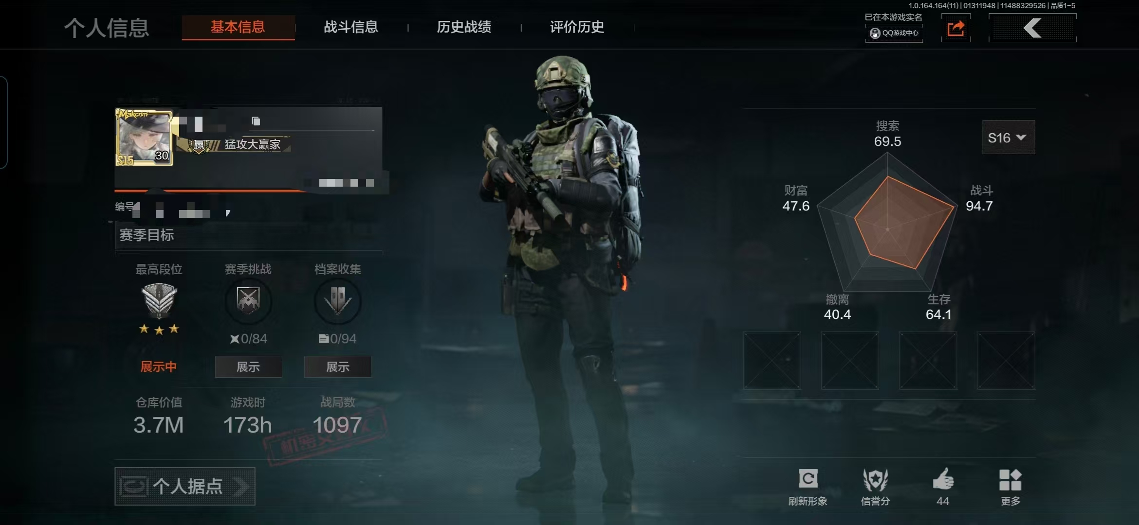 等级:30/段位:暗区传说/仓库价值(百万):1.5/柯恩币:188773/