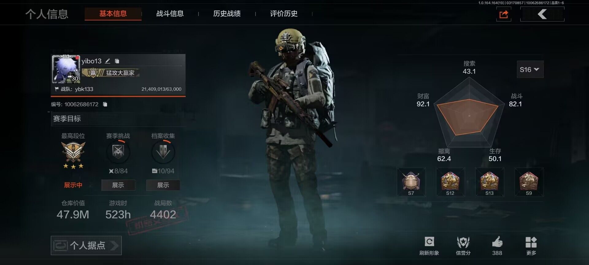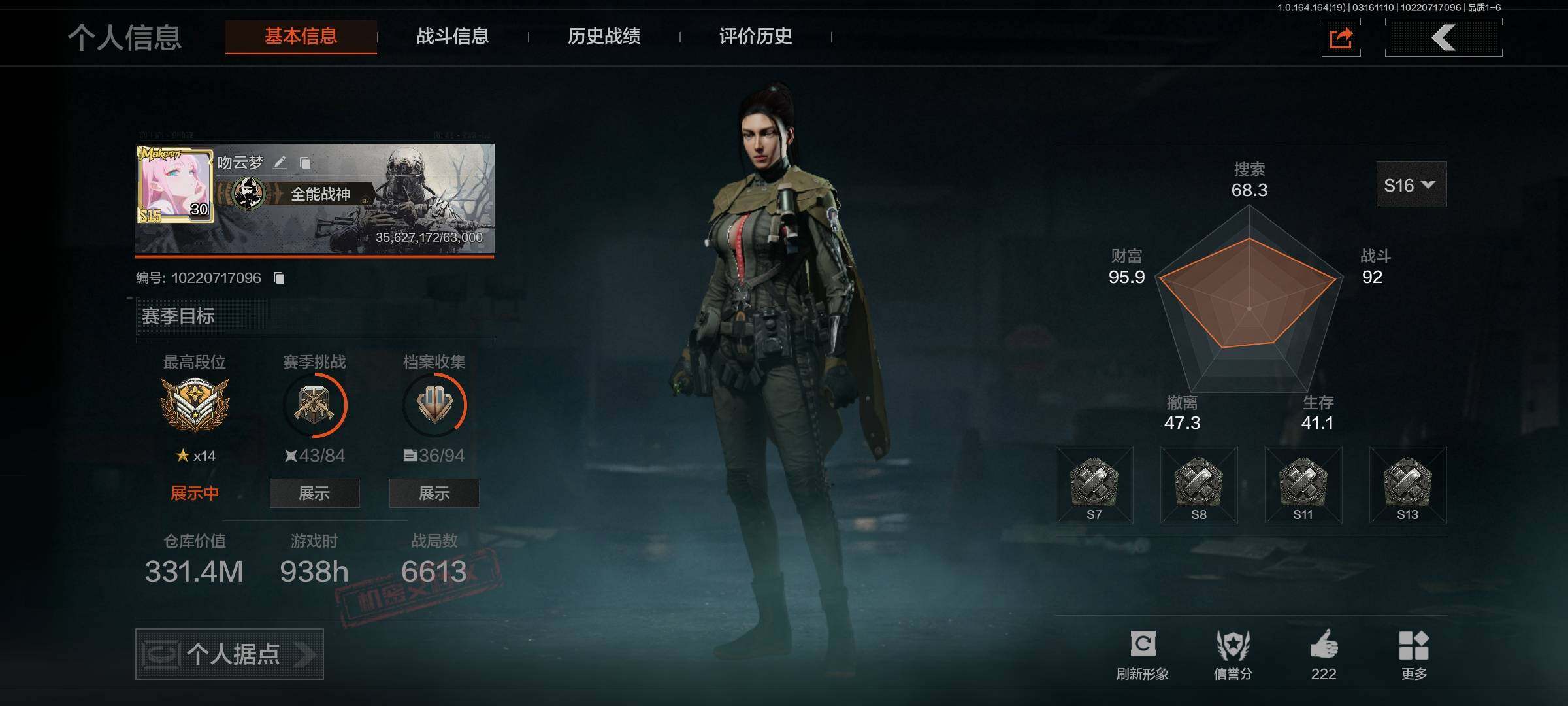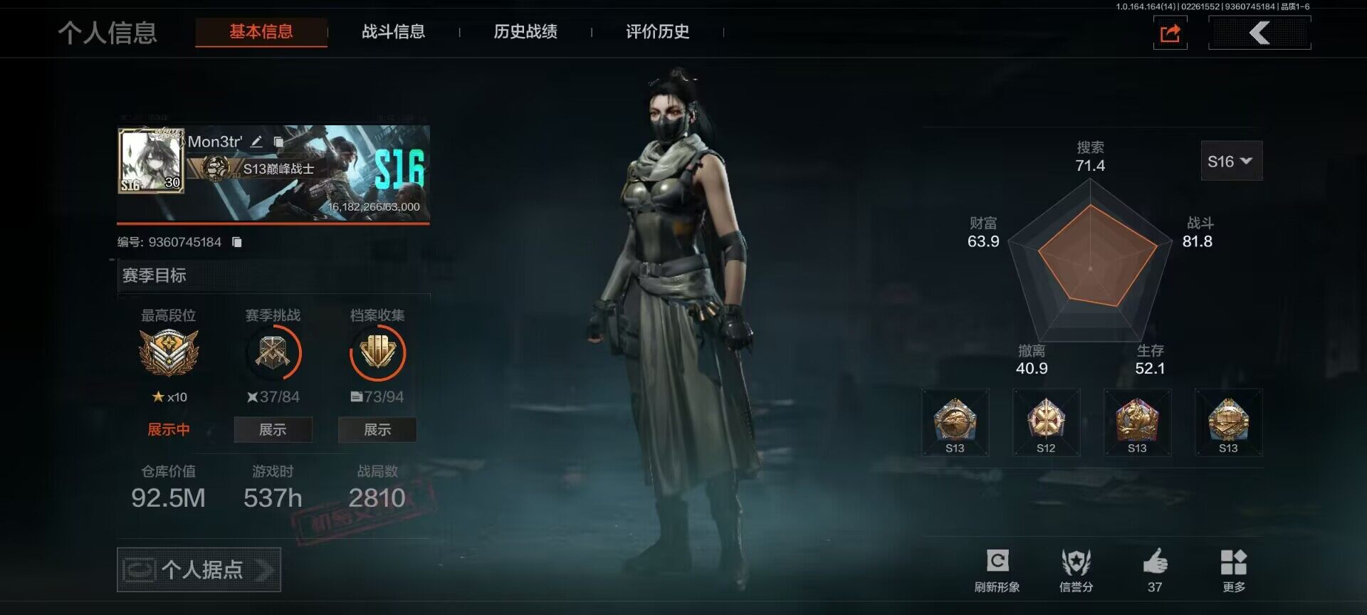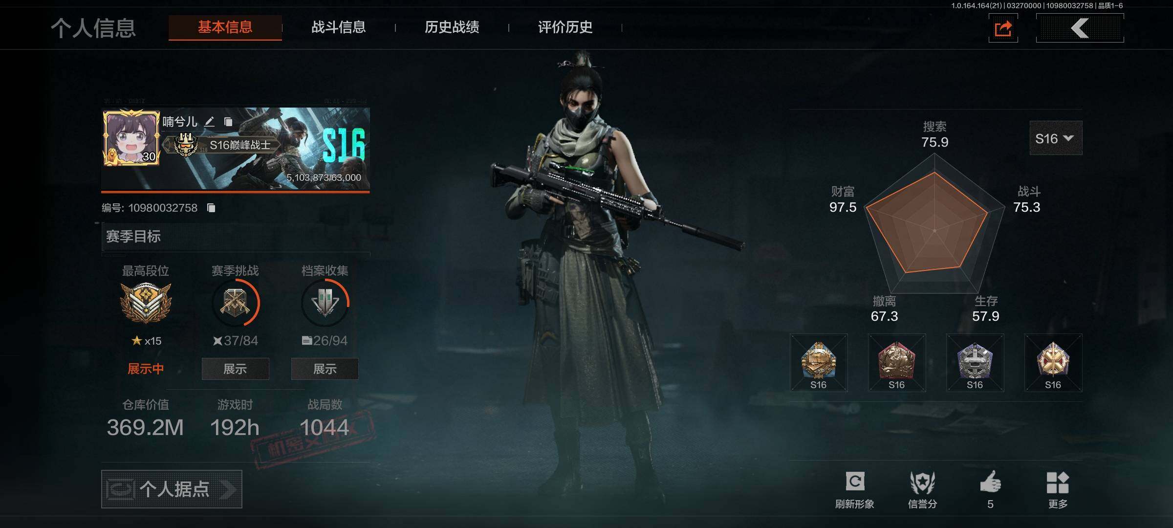 等级:30/段位:暗区传说/仓库价值(百万):92.5/