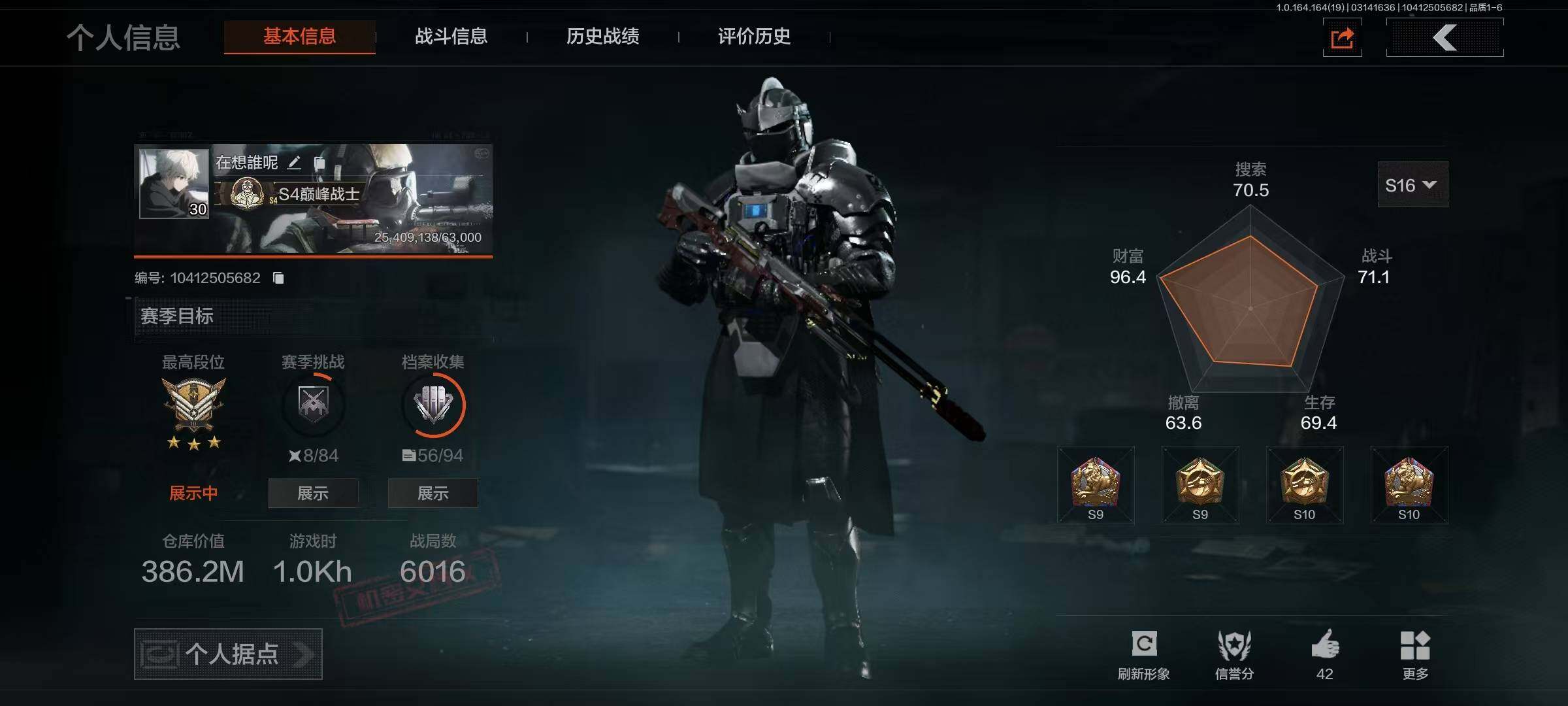等级:30/段位:王牌/仓库价值(百万):386.2/柯恩币