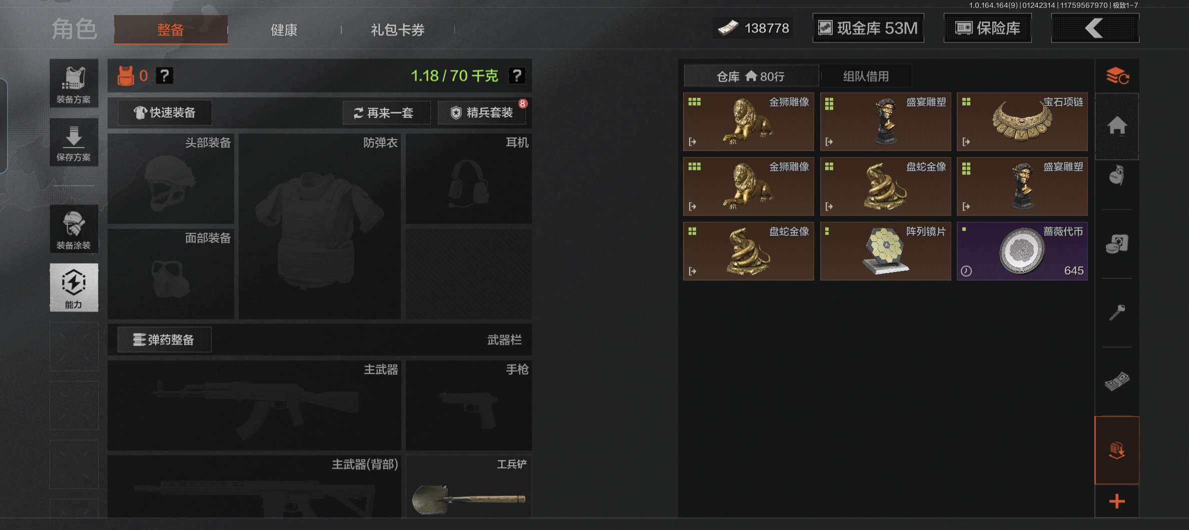 仓库价值(百万):1.7/柯恩币:854938/裁决手杖剑/钢铁壁垒作战服/旗帜AEK/旧王圣谕VSS