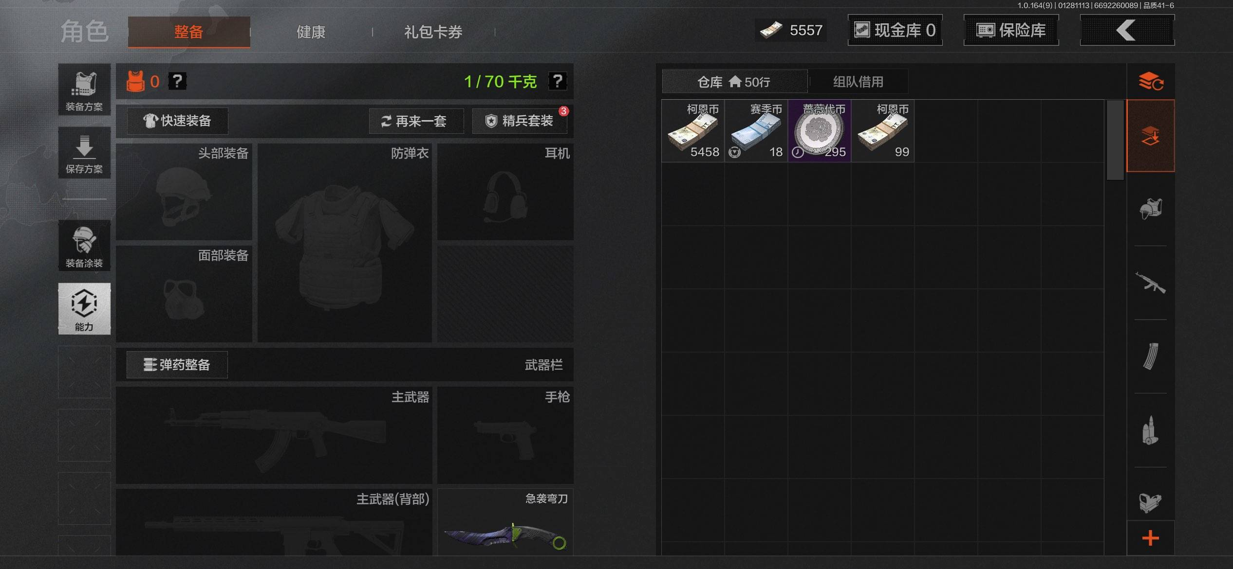 等级:30/段位:王牌/仓库价值(百万):1/柯恩币:1/急袭弯刀/百炼恒常/深潜行者II/冥河