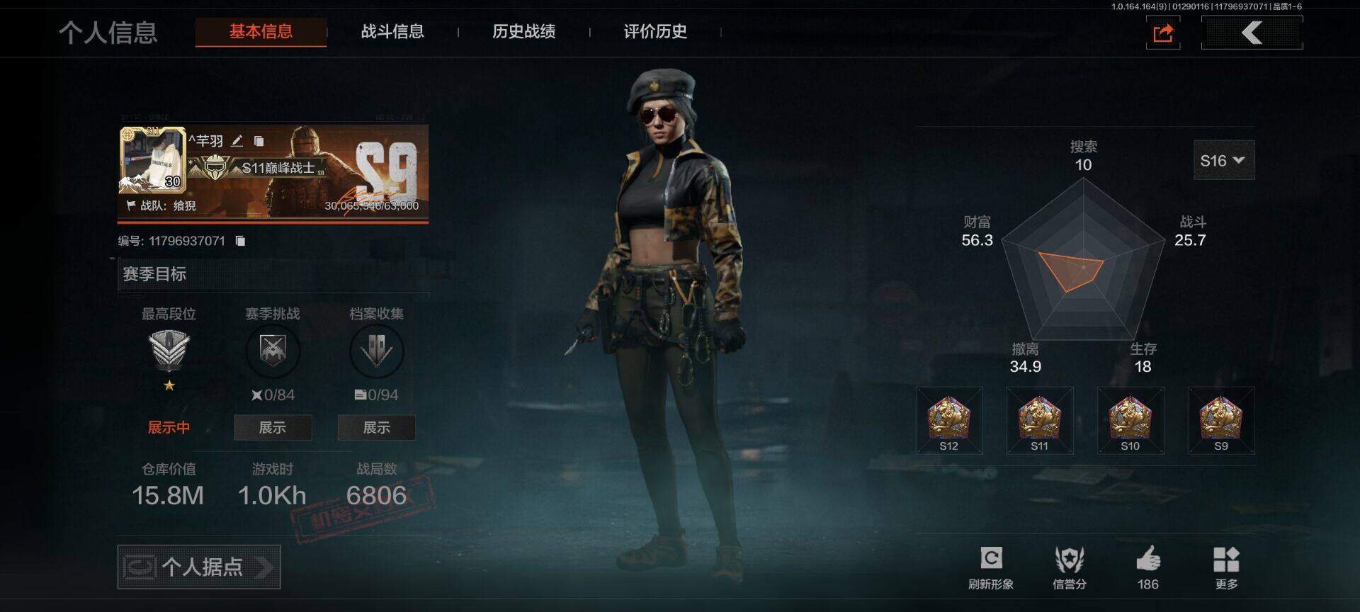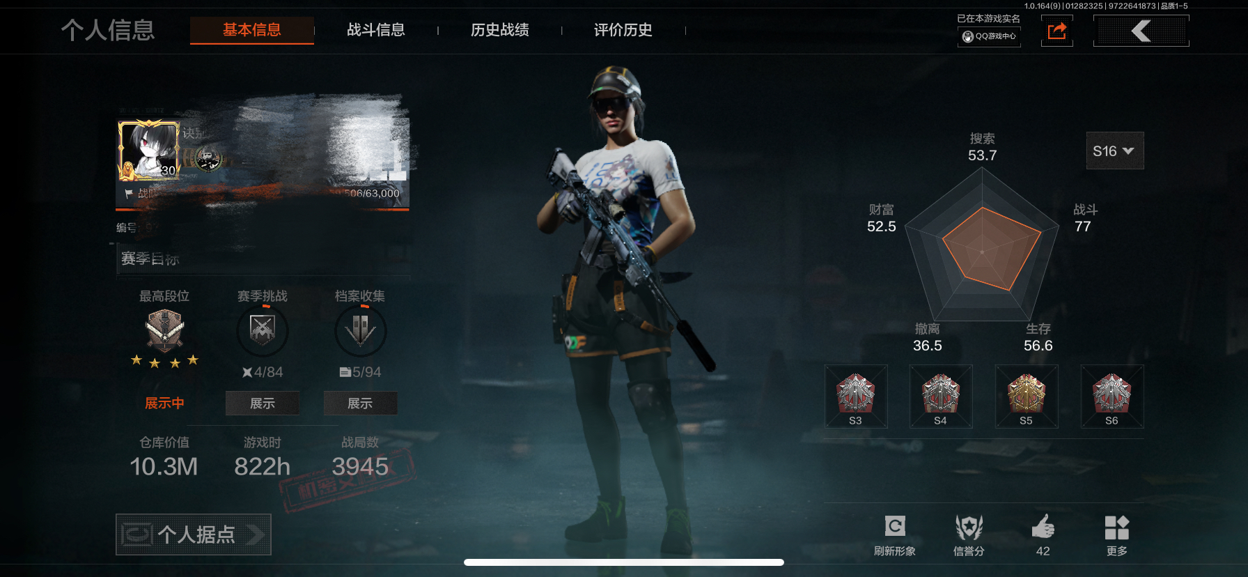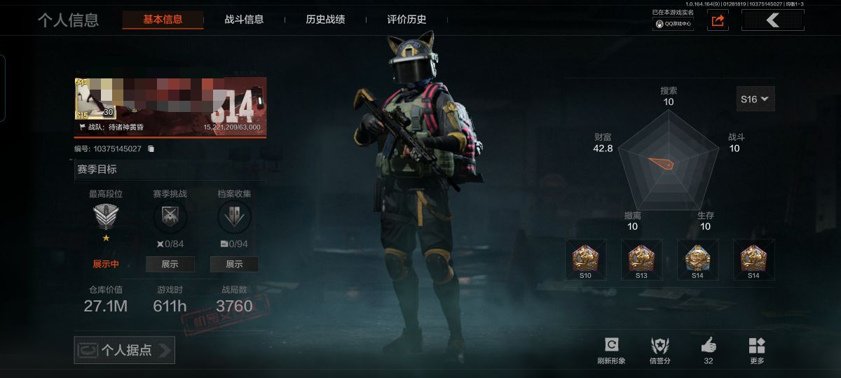 等级:30/段位:暗区传说/仓库价值(百万):3.7/柯恩币:877565/