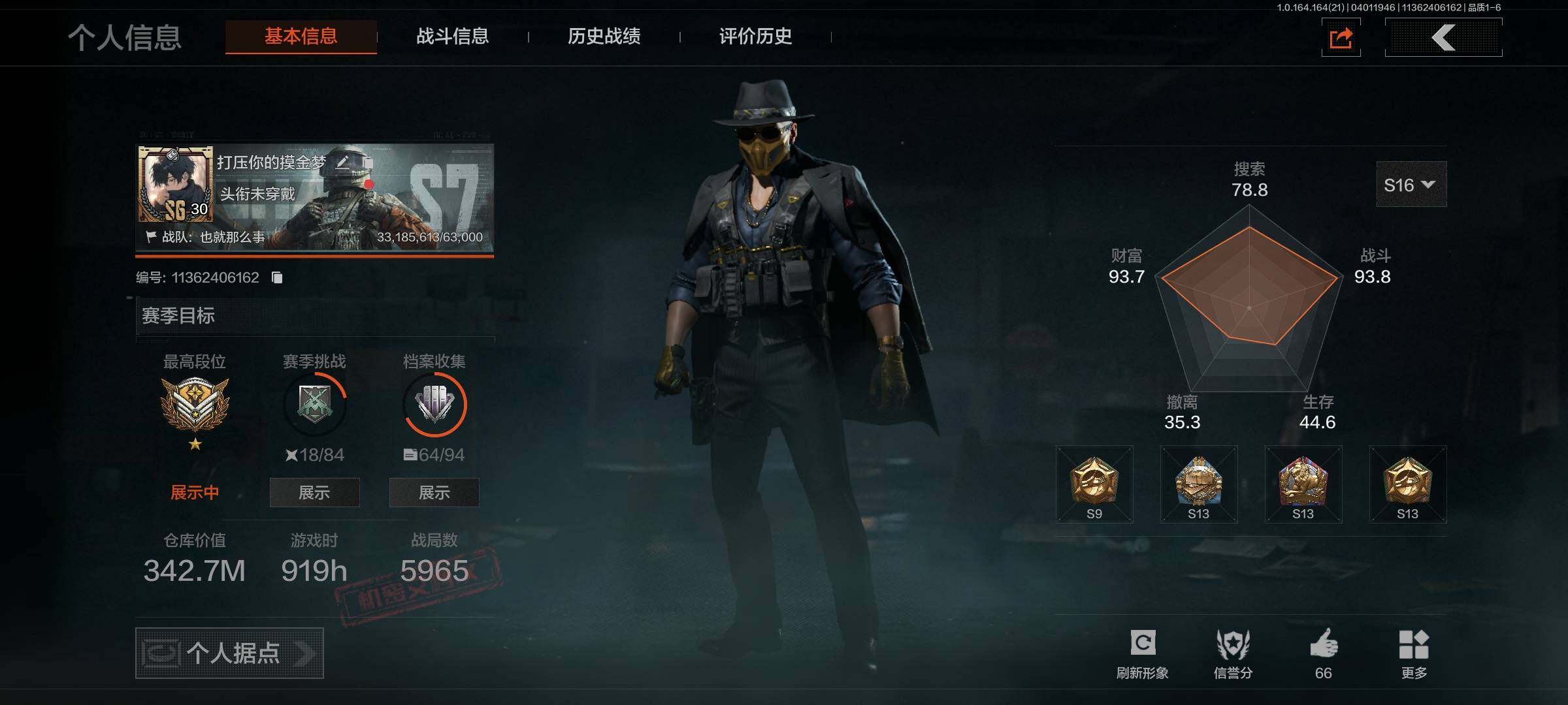 段位:暗区传说/仓库价值(百万):342.7/工兵铲/
