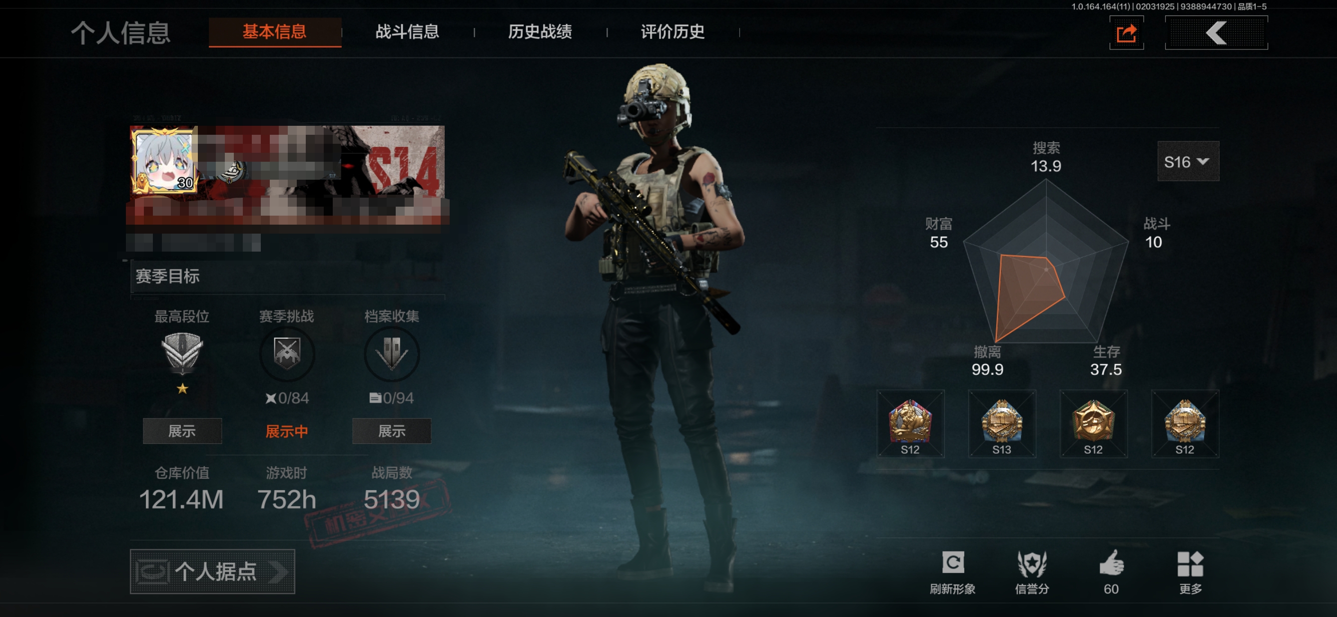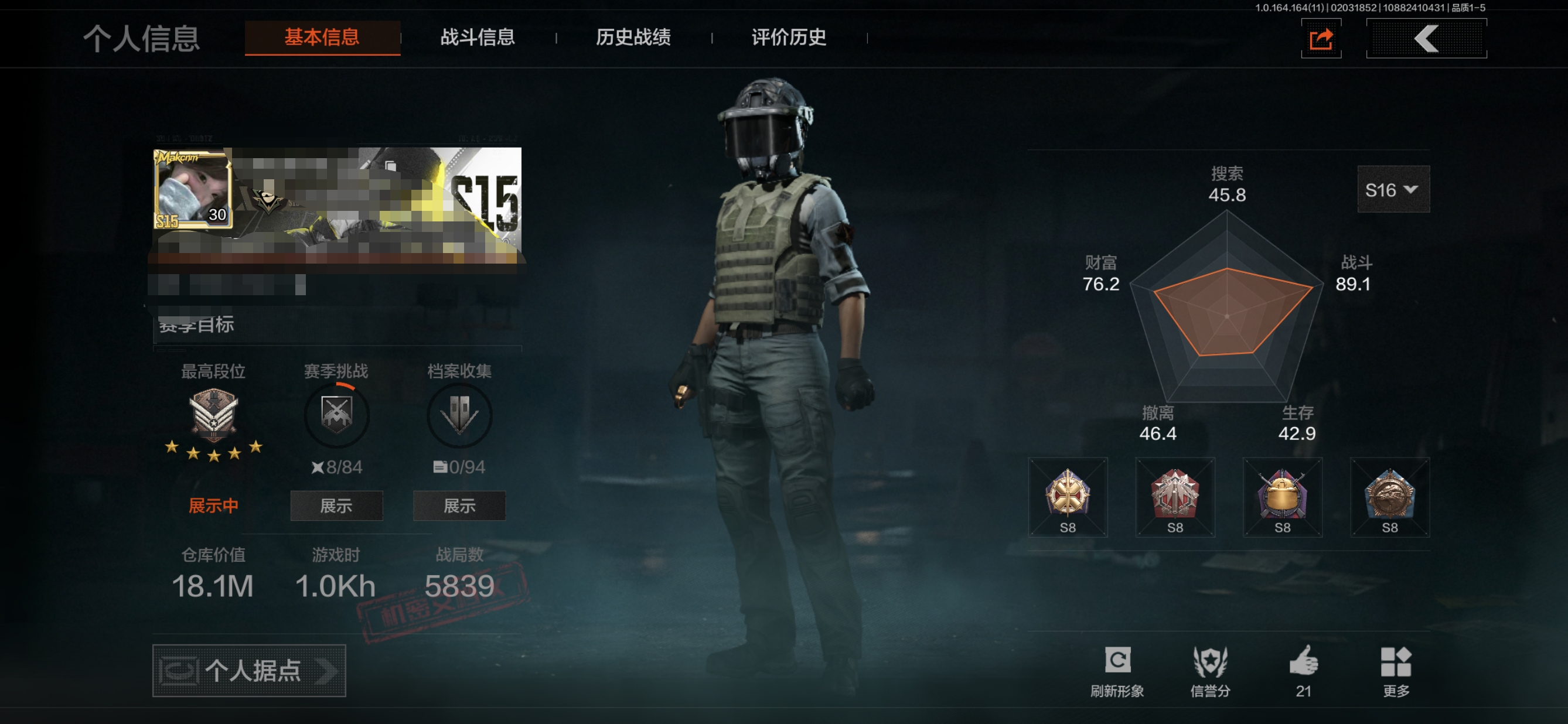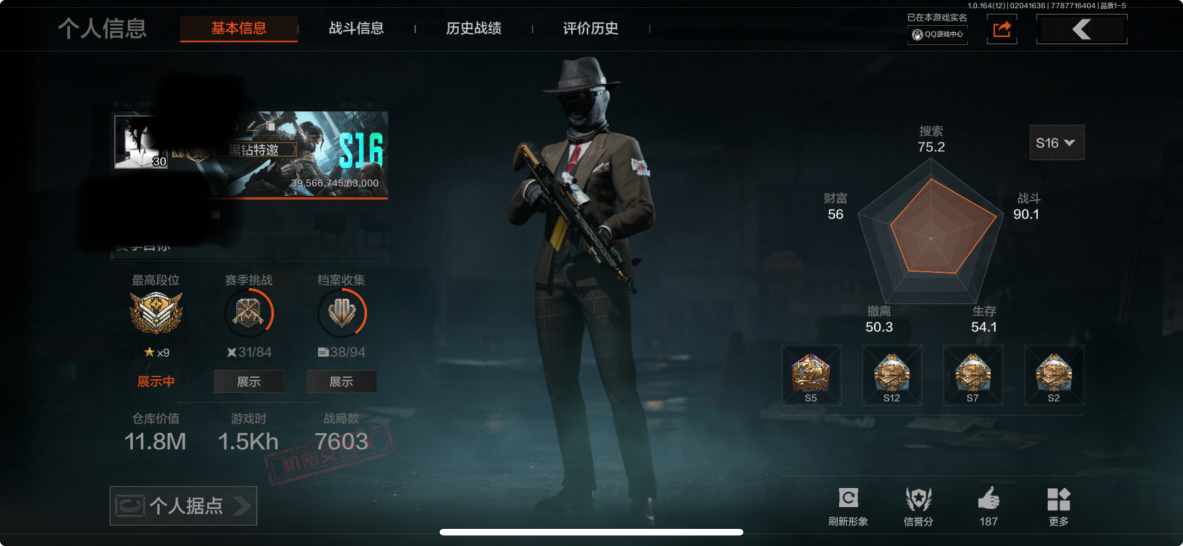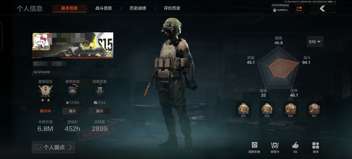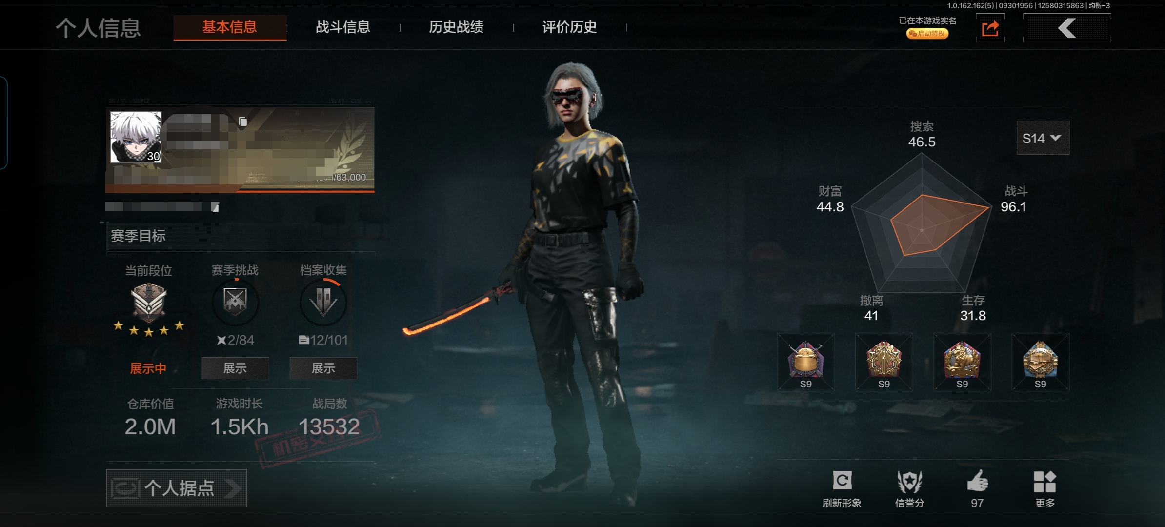 段位:王牌/仓库价值(百万):53/柯恩币:19166542/战术甲胄防护手套/瑞兔折刀/明刀绣春/下弦月/工兵铲/深潜行者II/冥河/伦琴幻影FAL/旧王圣谕VSS