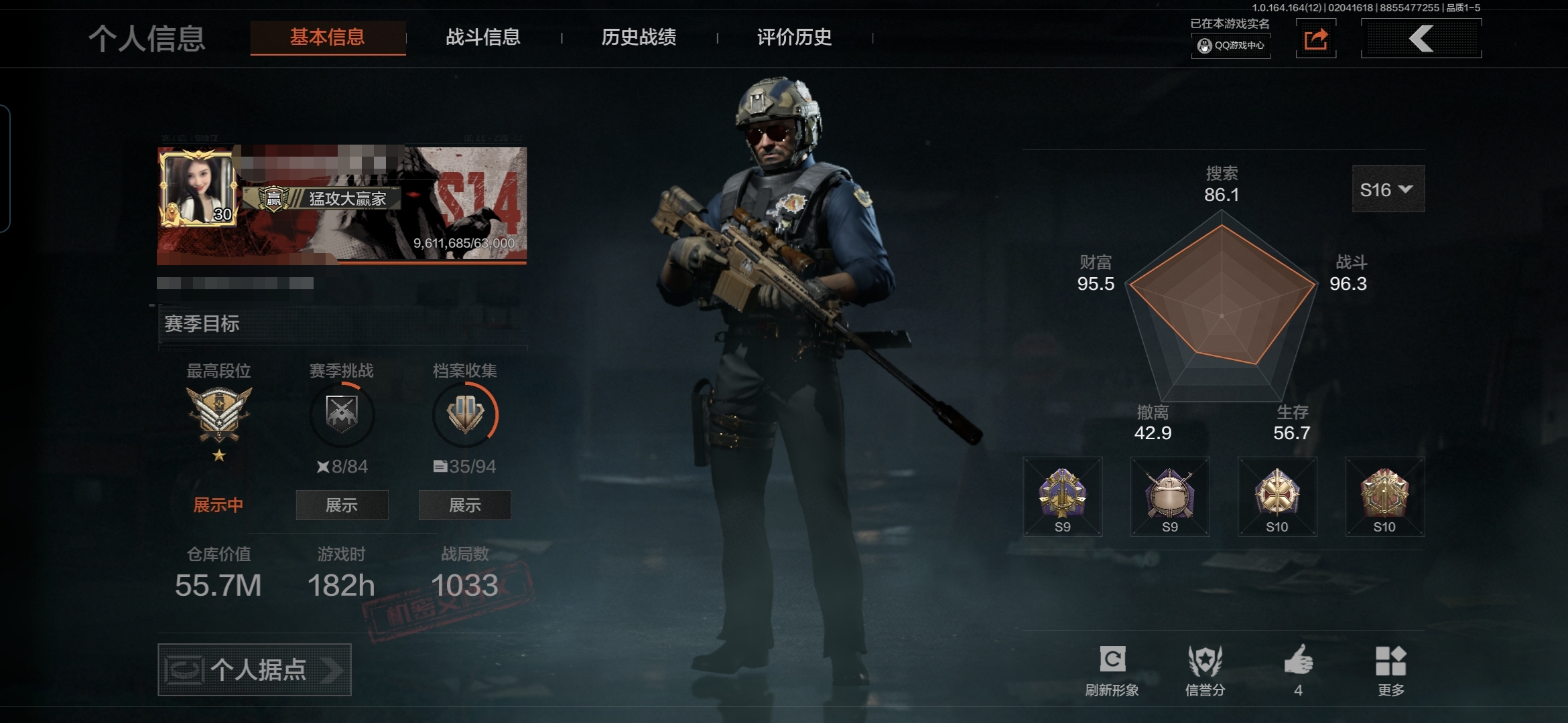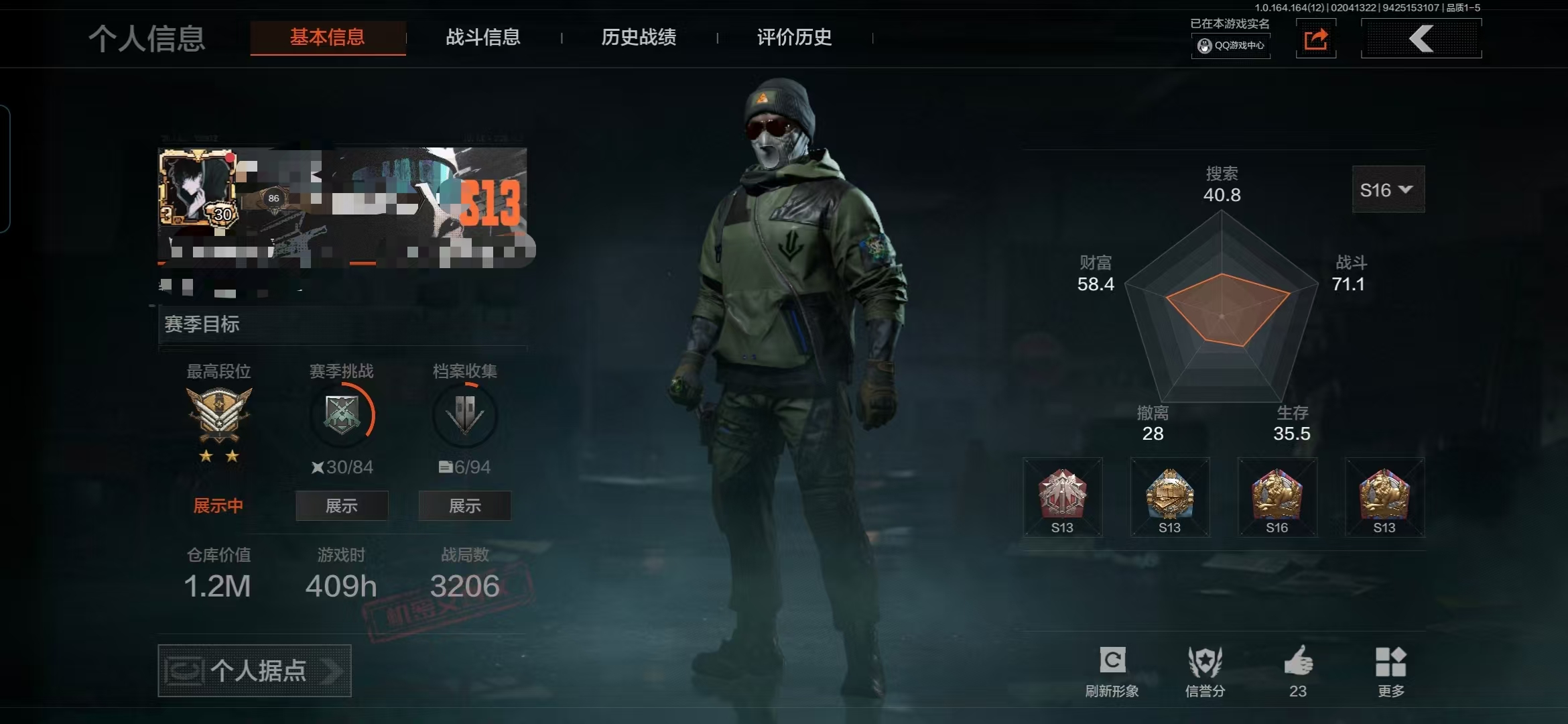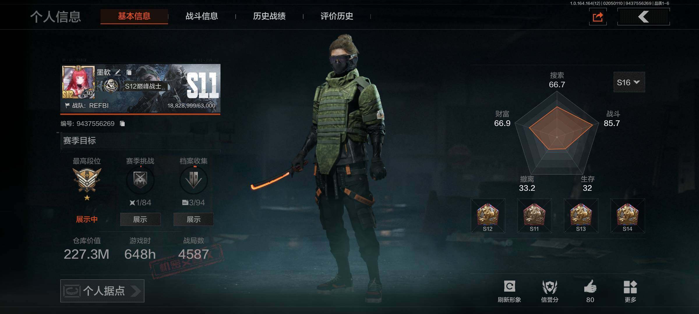 等级:30/段位:暗区传说/仓库价值(百万):227.3/柯恩币:165626553/热能武器补牢/旗帜AEK/