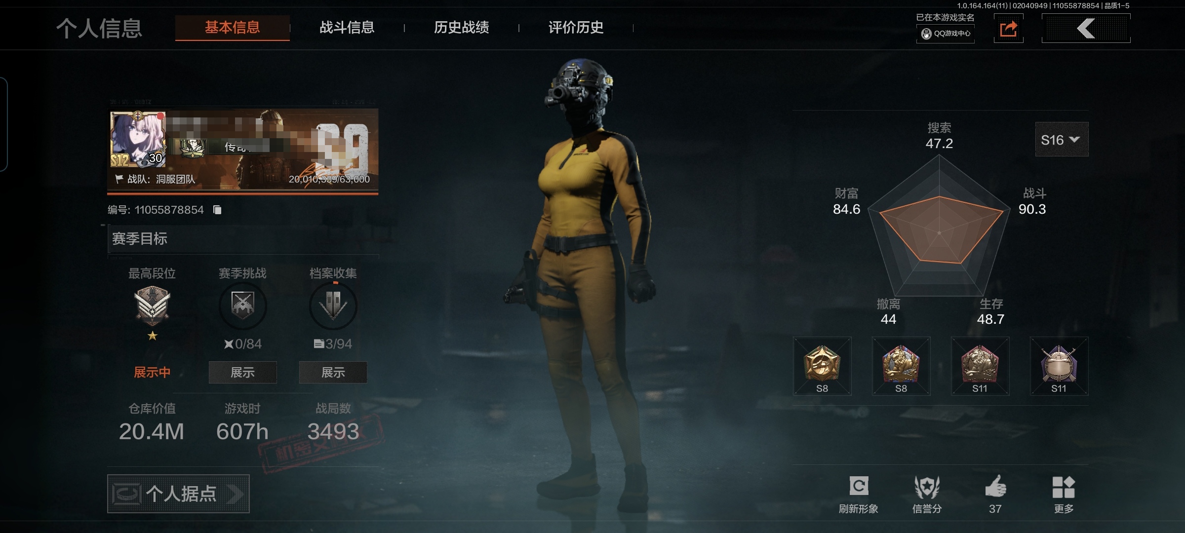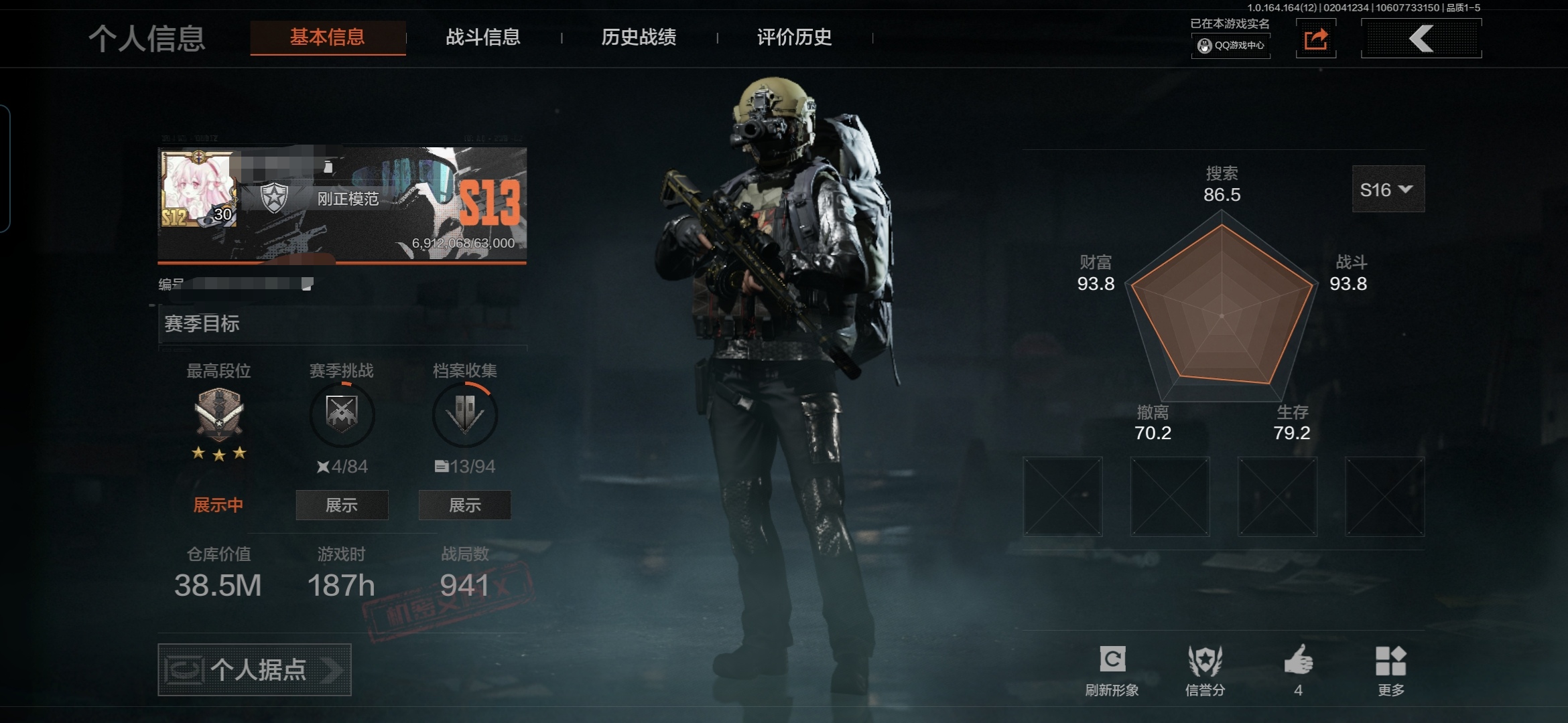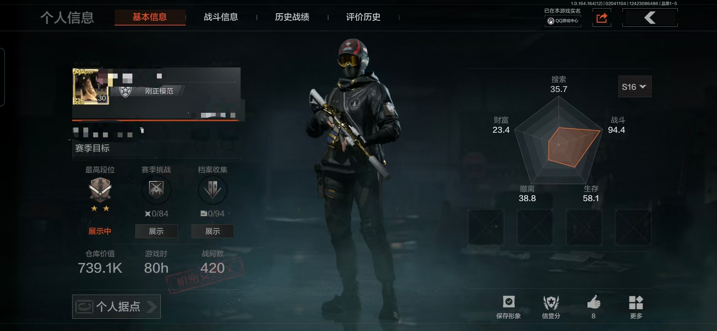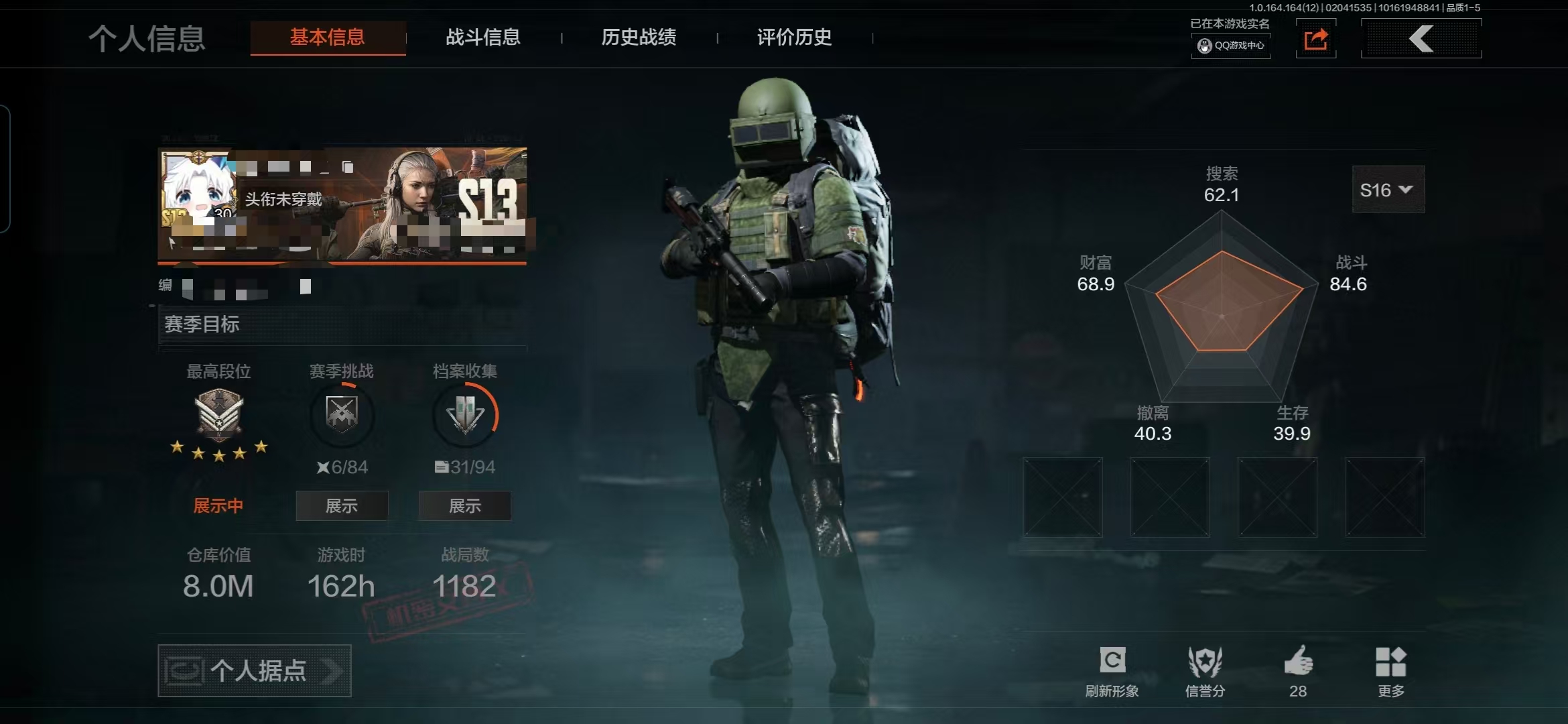 等级:30/段位:暗区传说/仓库价值(百万):227.3/柯恩币:165626553/热能武器补牢/旗帜AEK/
