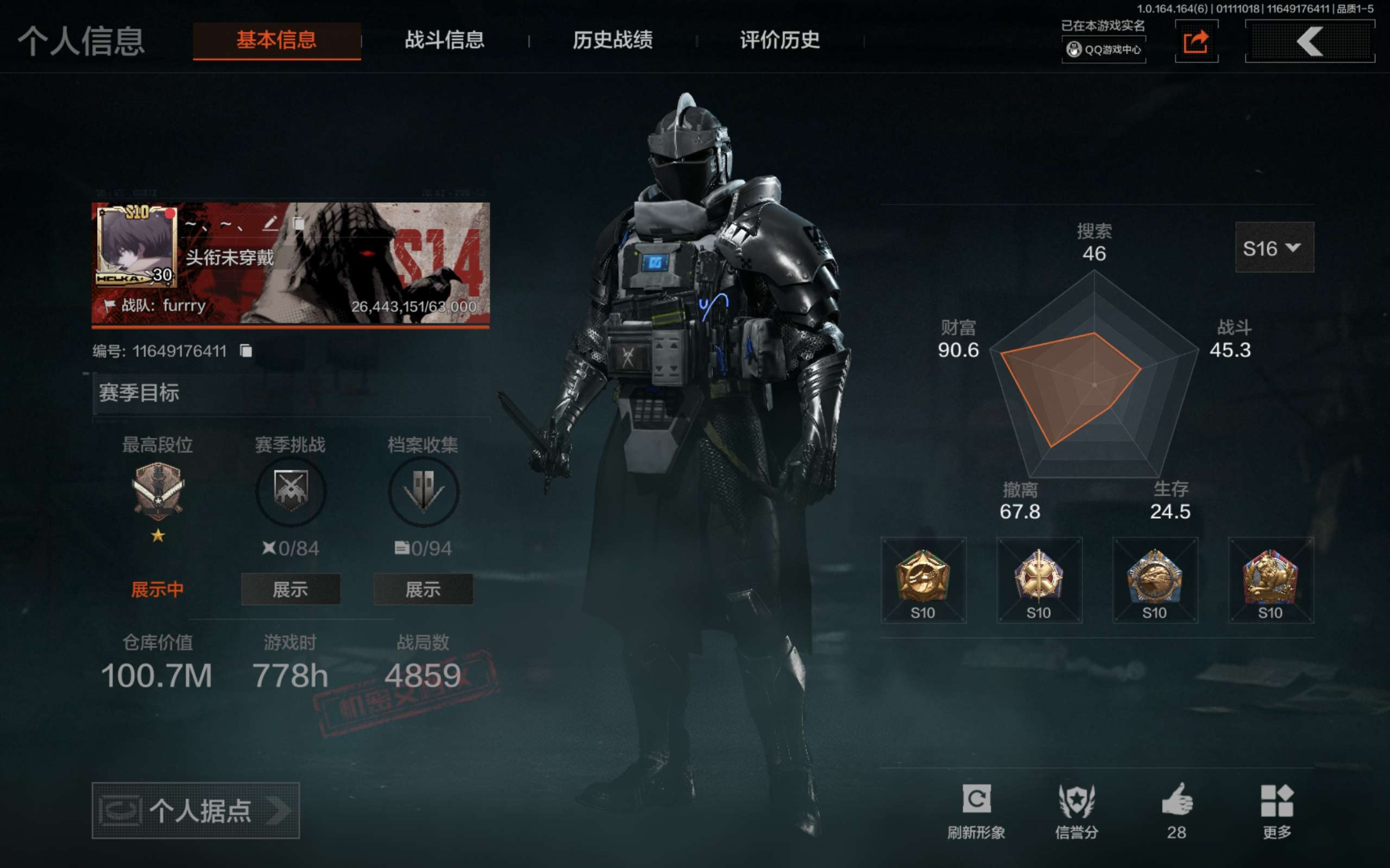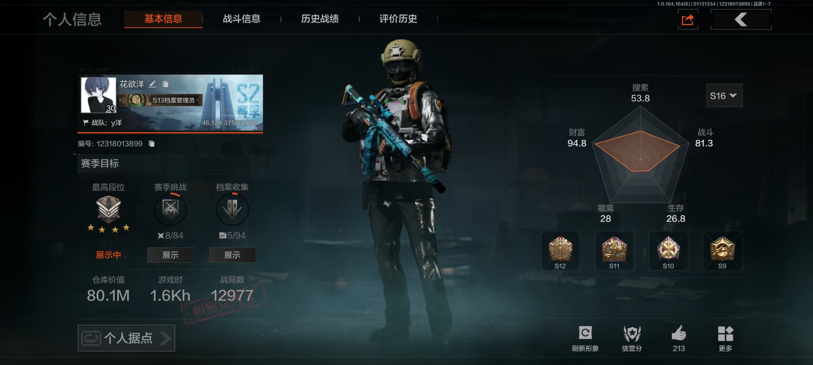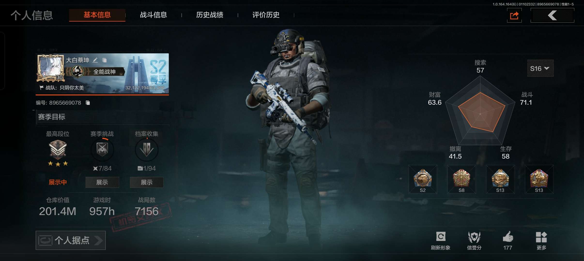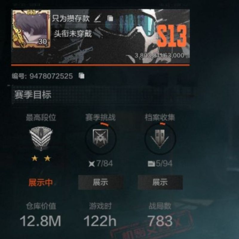 安卓qq 可二次/仓库价值22.7m/段位:暗区传说金枪: