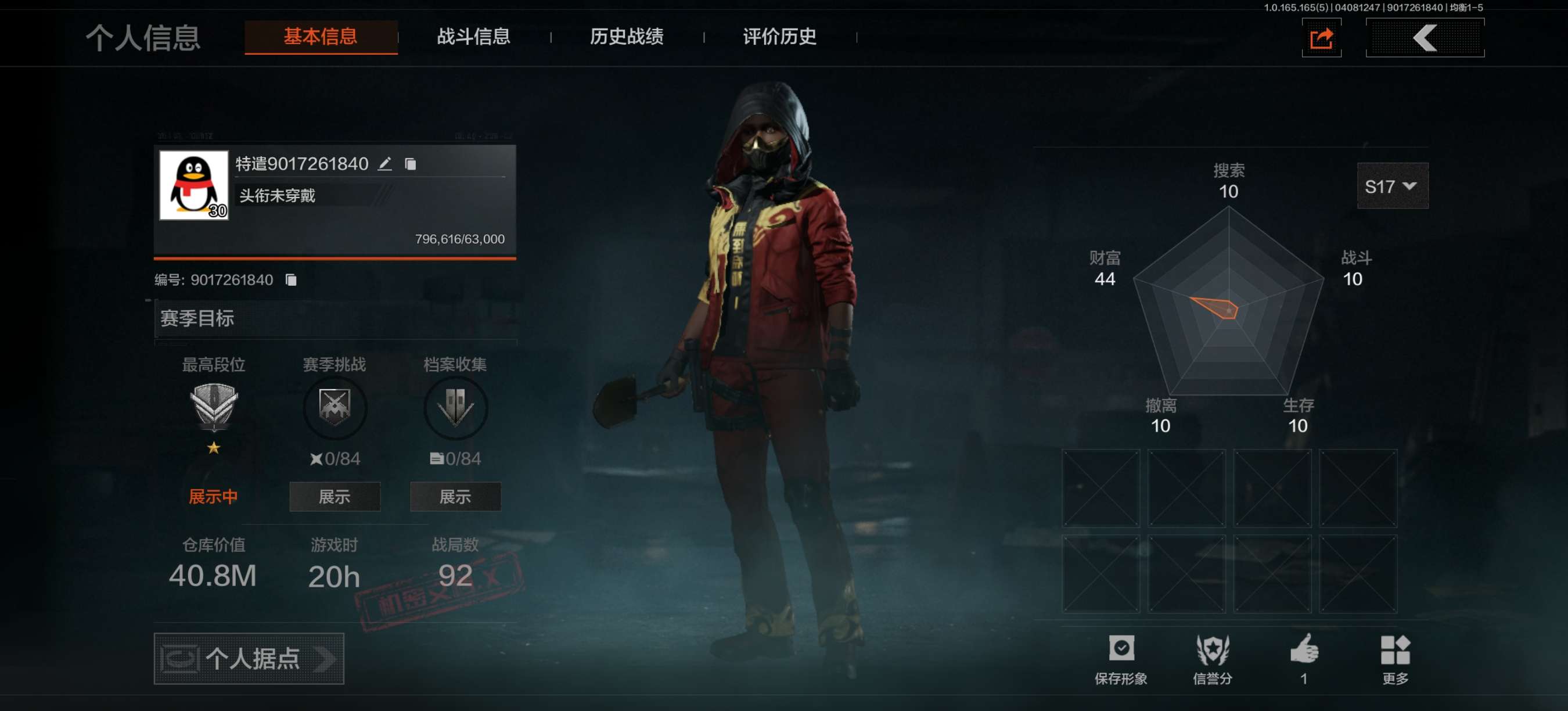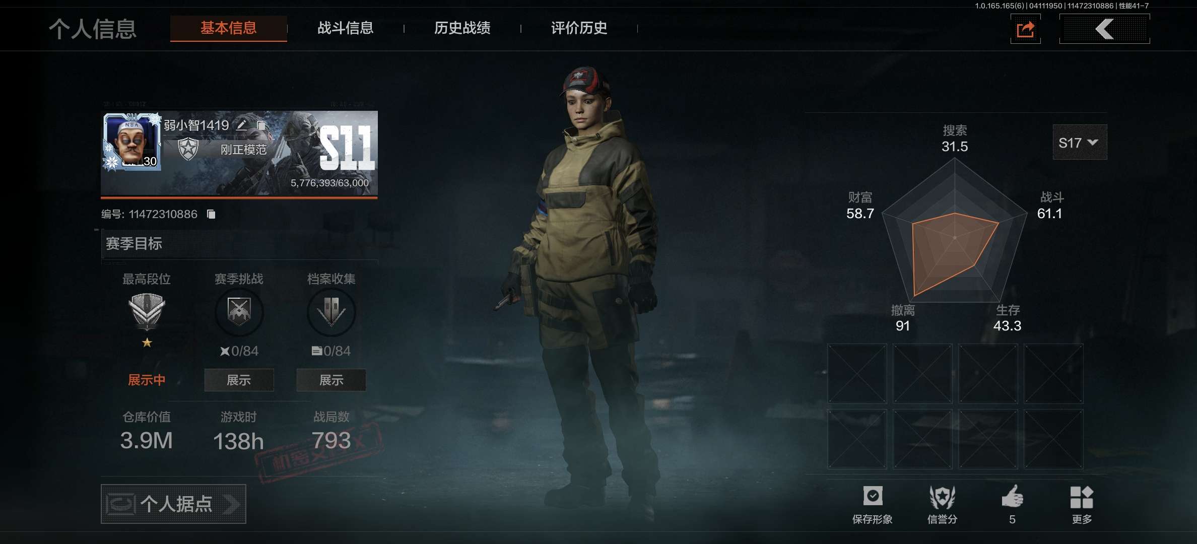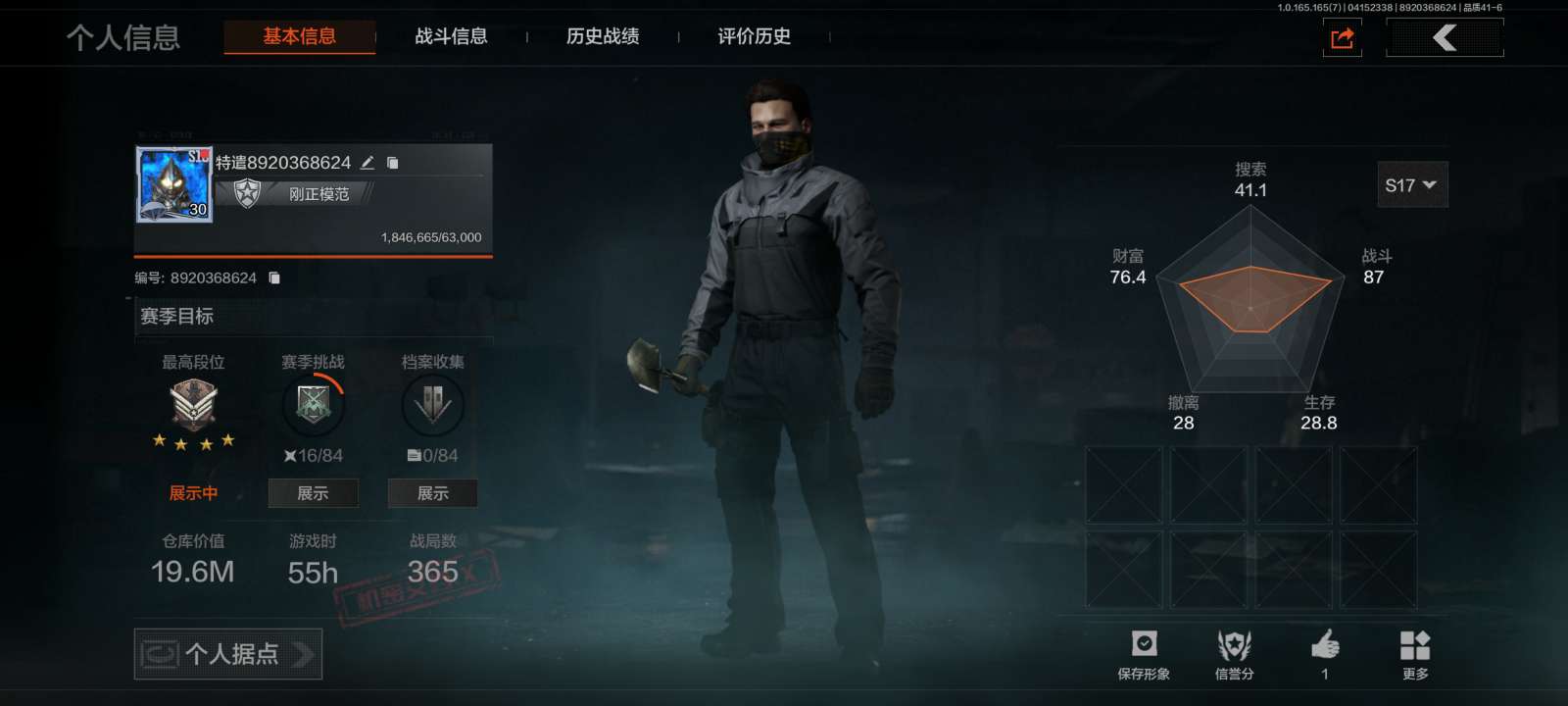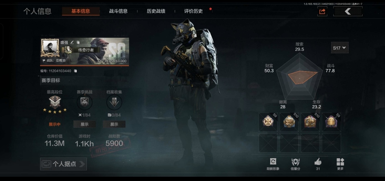 等级:30/段位:暗区传说/仓库价值(百万):45/苍穹利爪/涂