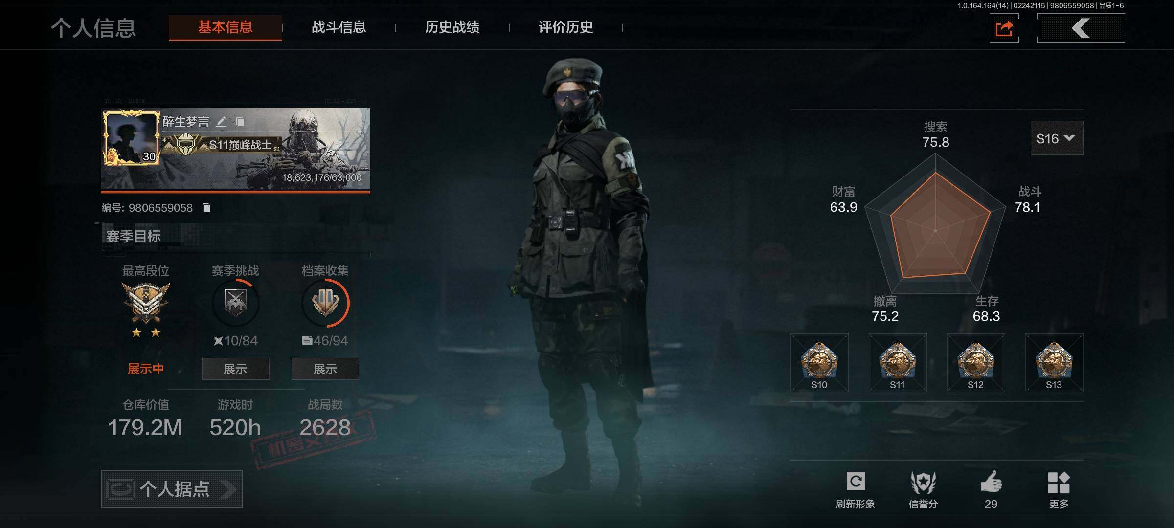 等级:30/段位:暗区传说/仓库价值(百万):179.2/柯恩币:112366125/