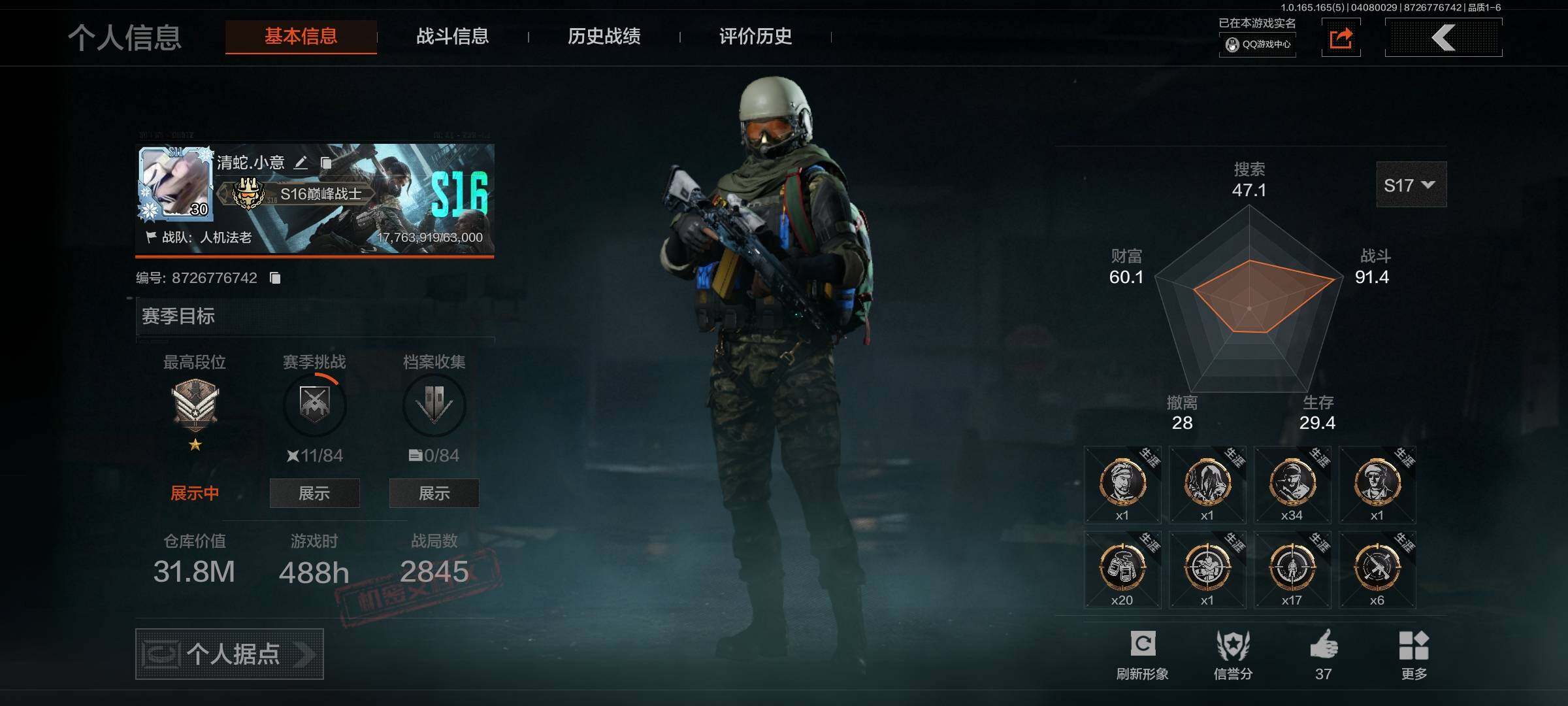 等级:30/段位:精英/仓库价值(百万):67.4/柯恩币:59