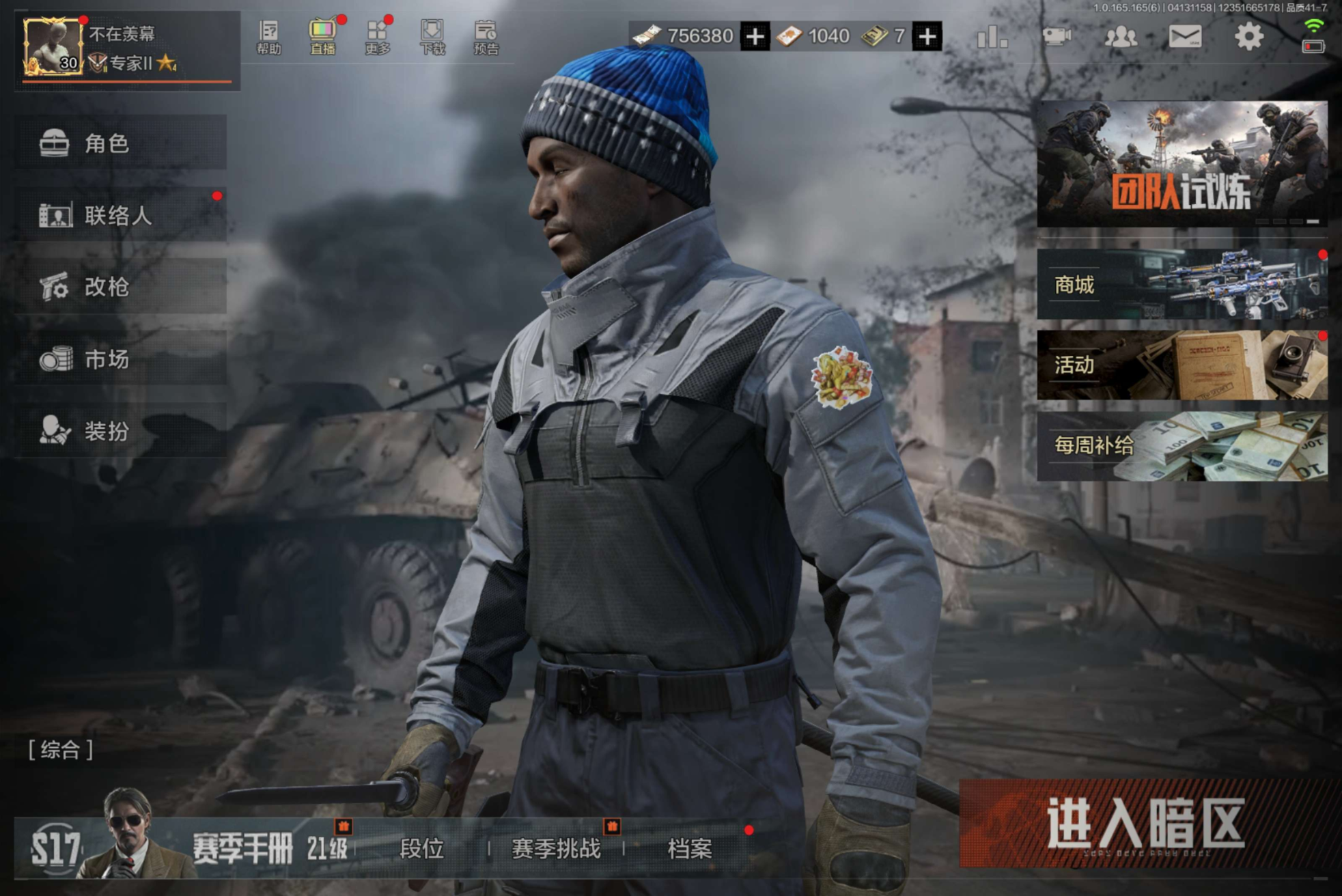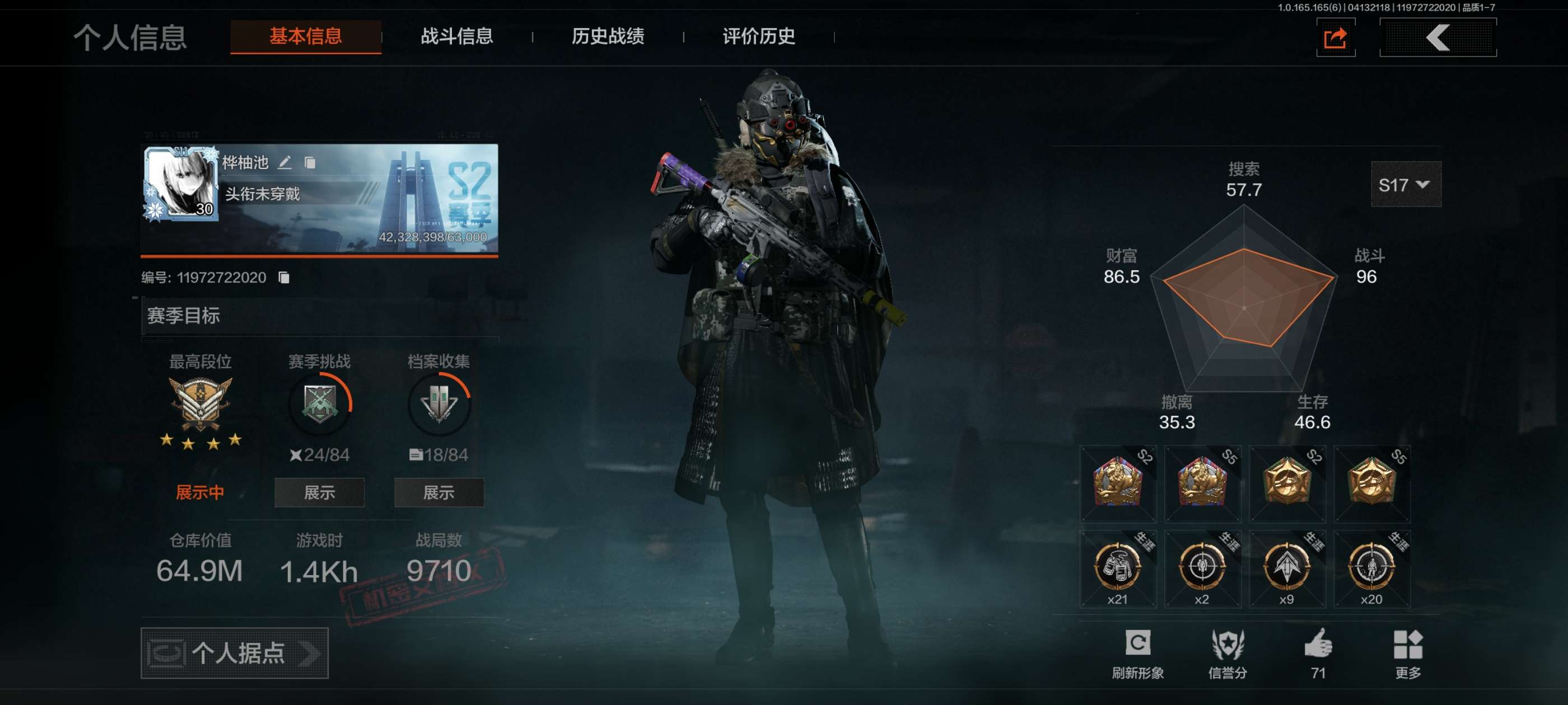 等级:30/段位:大师/仓库价值(百万):4/柯恩币:97673