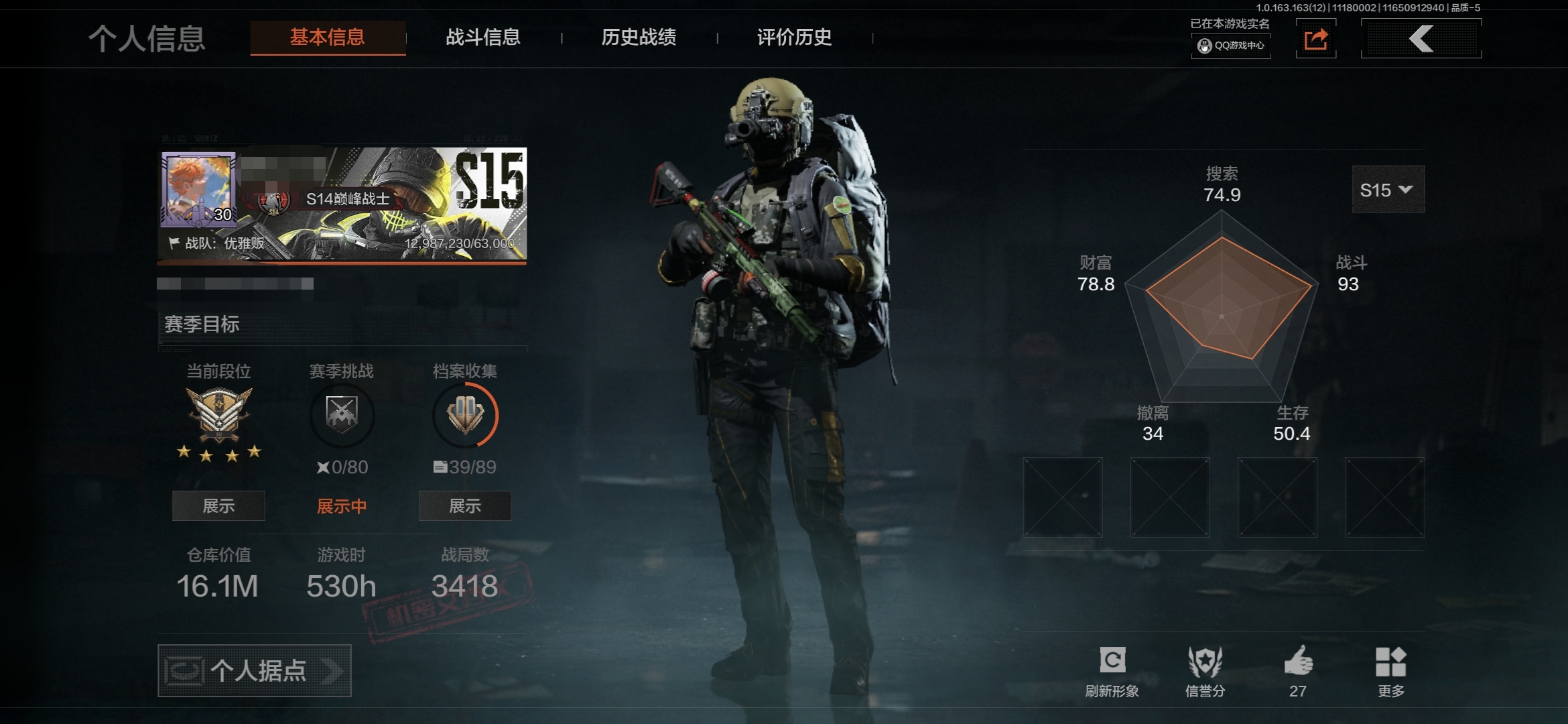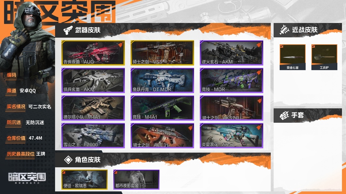 30级,刀皮4,金枪皮3,紫枪皮22,历史最高段位:暗区传