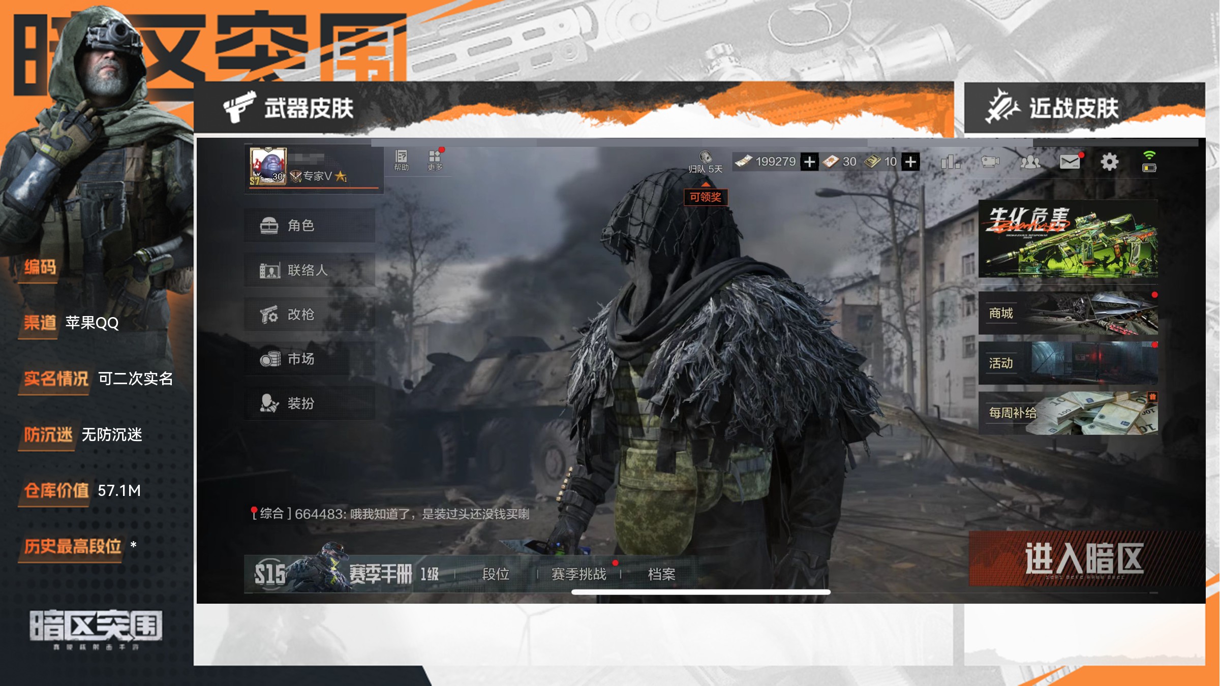30级,刀皮2,紫枪皮13,历史最高段位:暗区传说