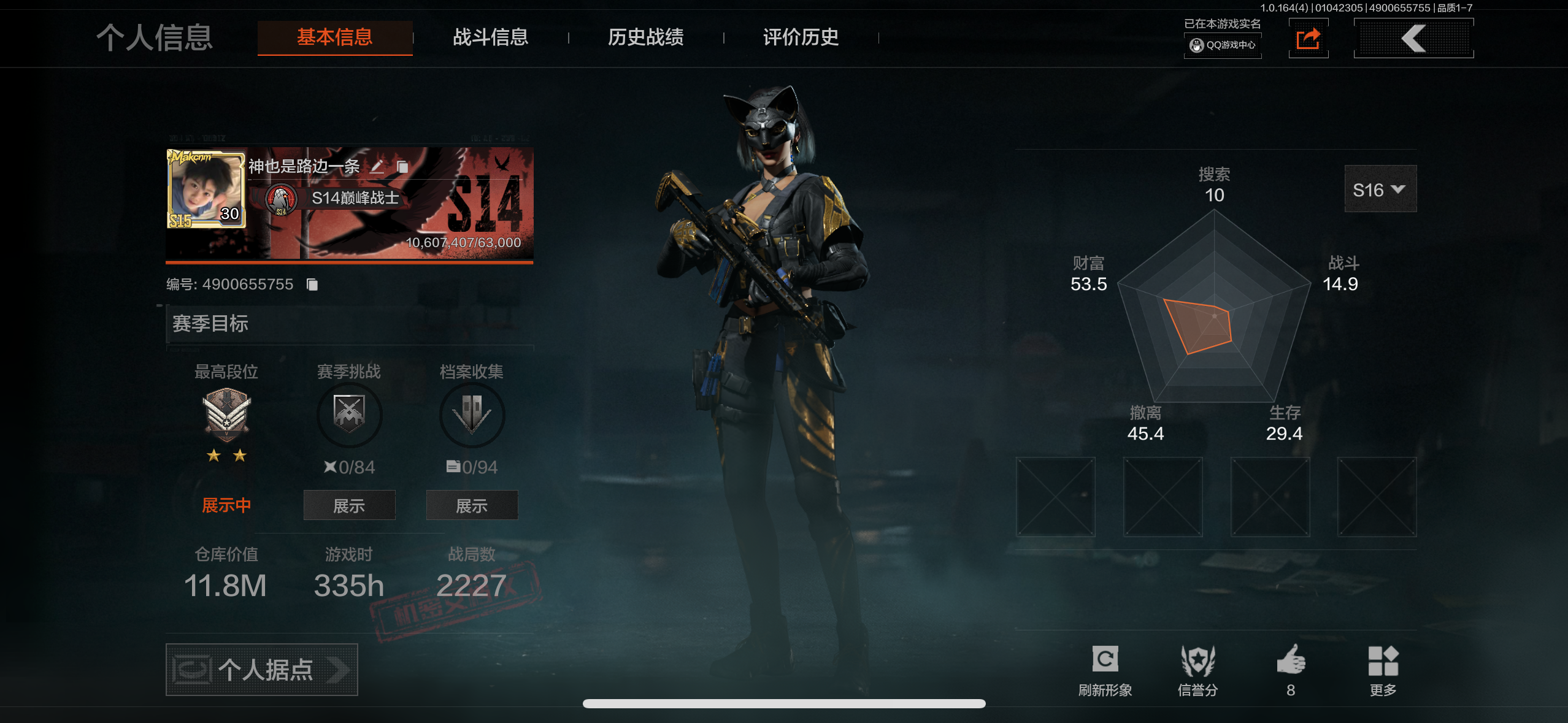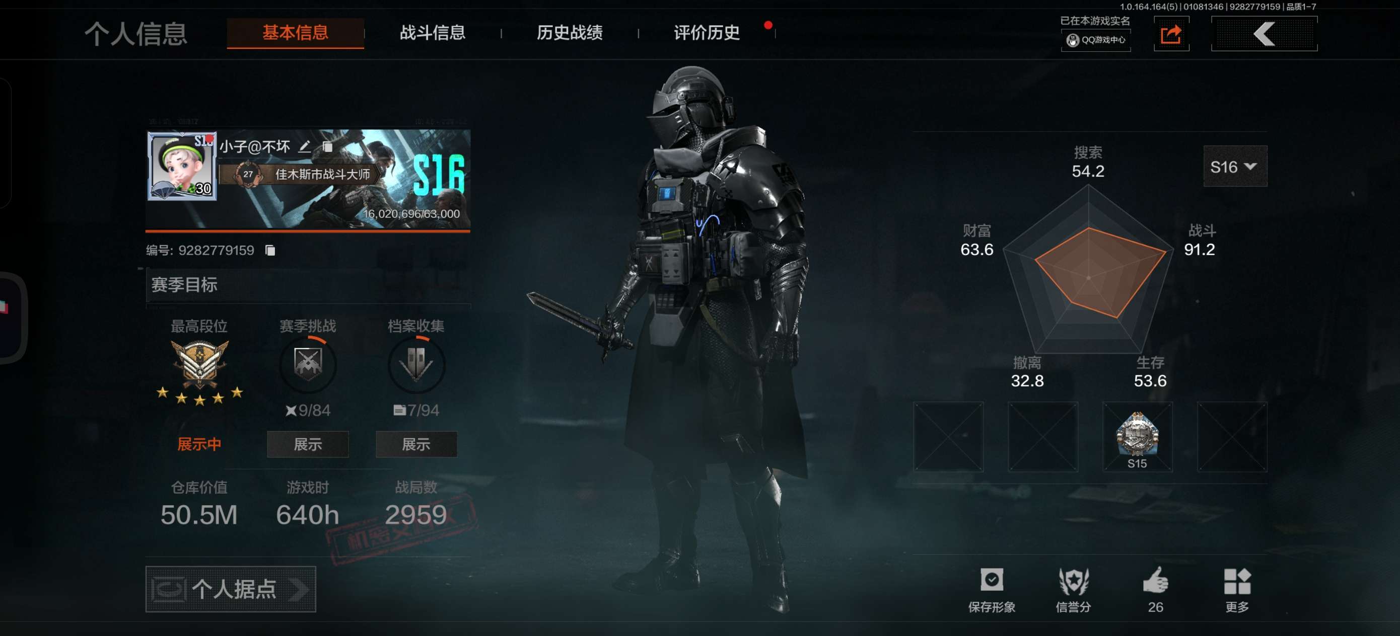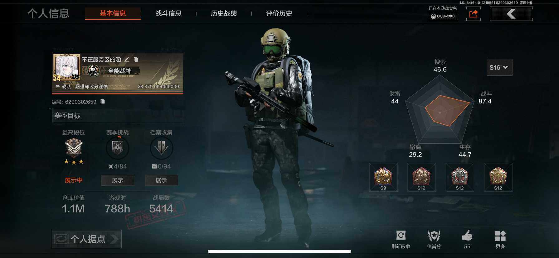等级:30/段位:专家/仓库价值(百万):15/工兵铲/来战开山刀/下弦月/蓝色咆哮H416