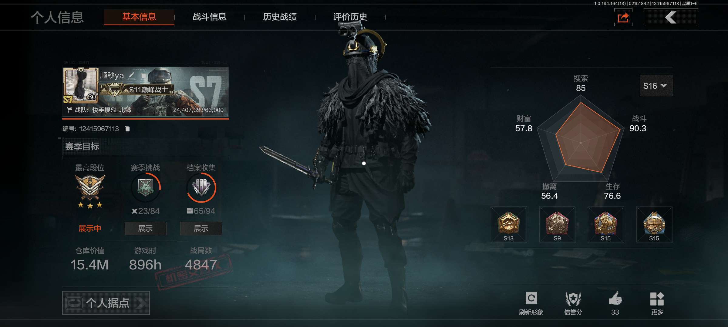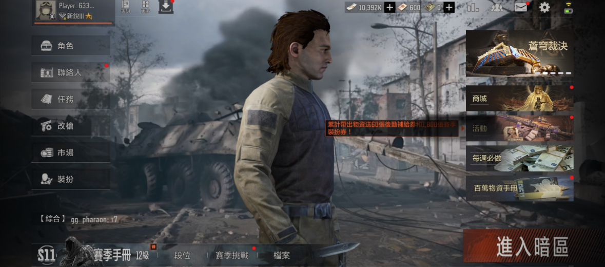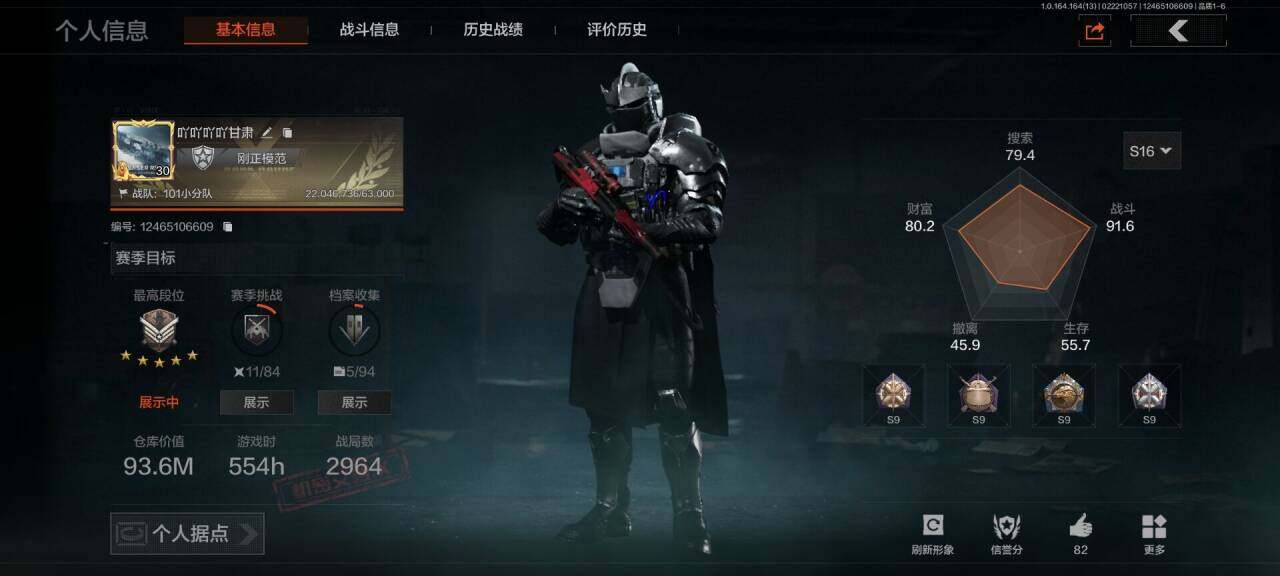 等级:30/段位:暗区传说/仓库价值(百万):184.6/柯恩币:141462000/