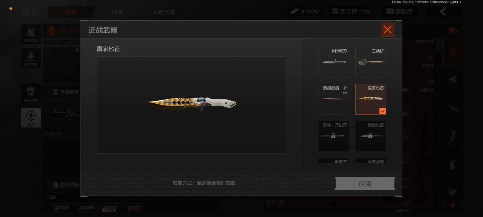 段位:王牌/仓库价值(百万):69/急袭弯刀/下弦月/百炼恒常/S-07折刀/野战折刀/工兵铲/来战开山刀/白蔷薇斯黛拉/
