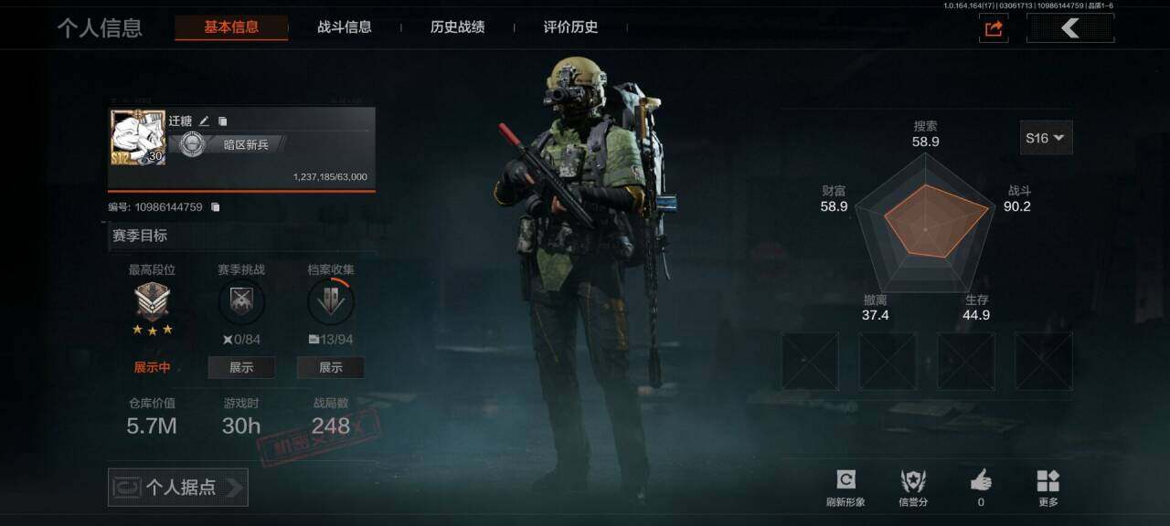等级:30/段位:暗区传说/仓库价值(百万):83/柯恩币:57227997/激流手套/