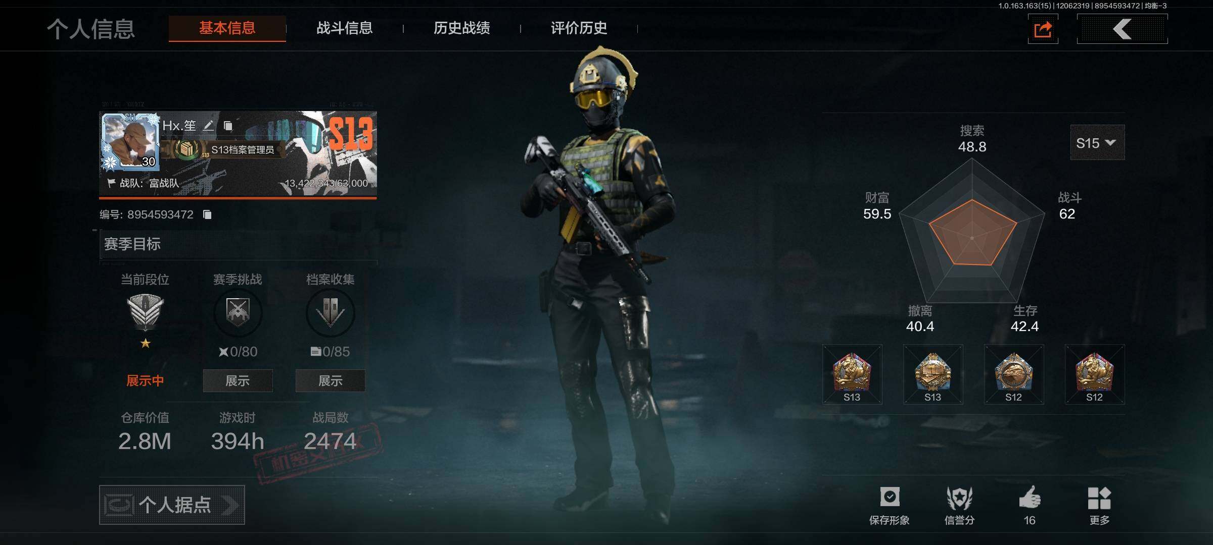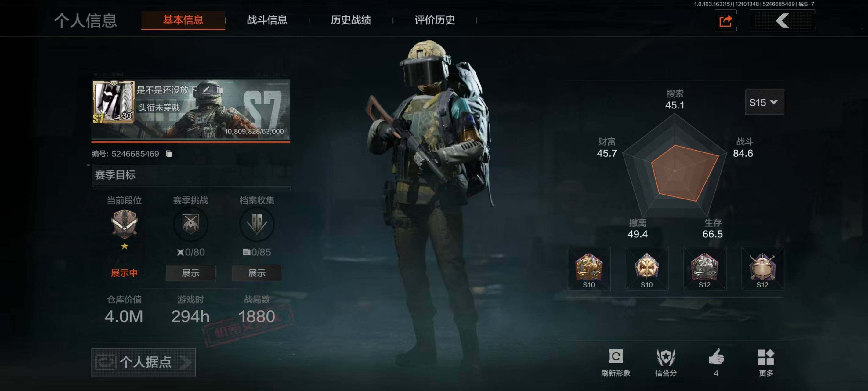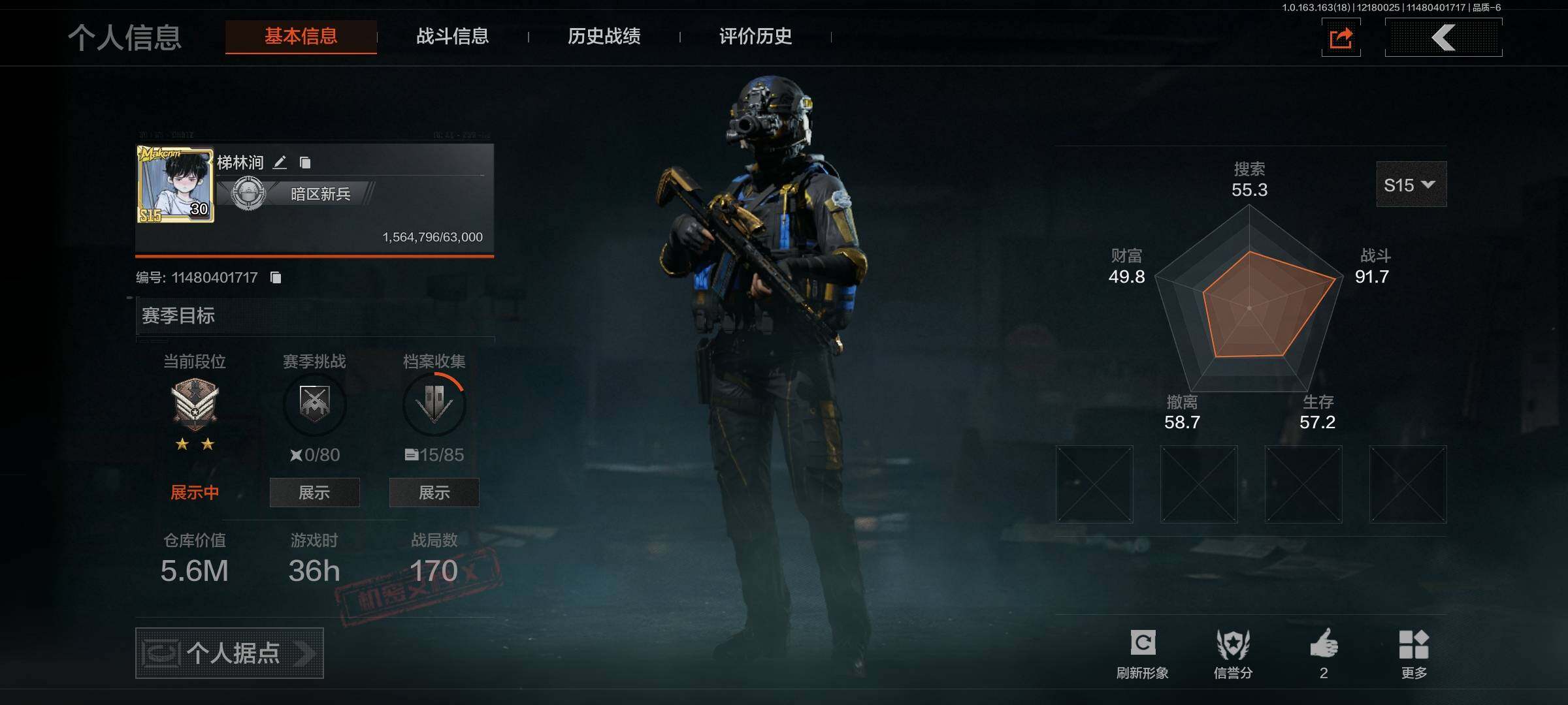 等级:30/段位:暗区传说/仓库价值(百万):5.6/柯恩币:2980000