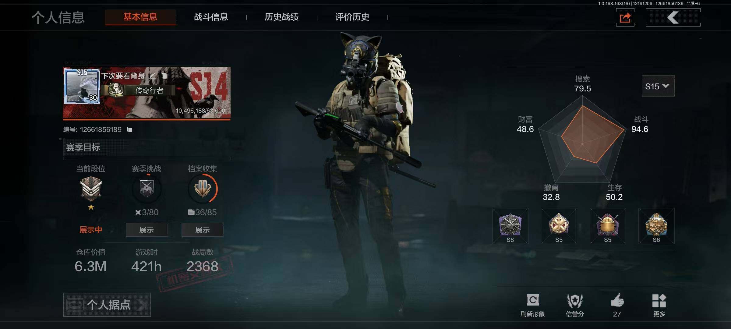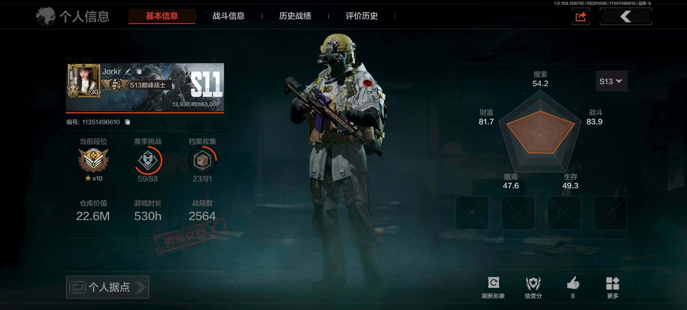 等级:30/段位:暗区传说/仓库价值(百万):7.4/