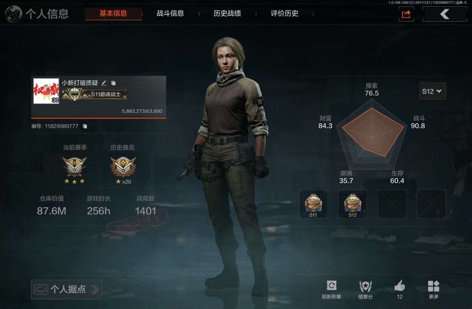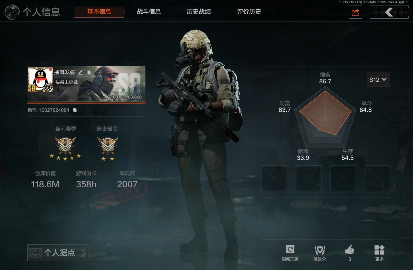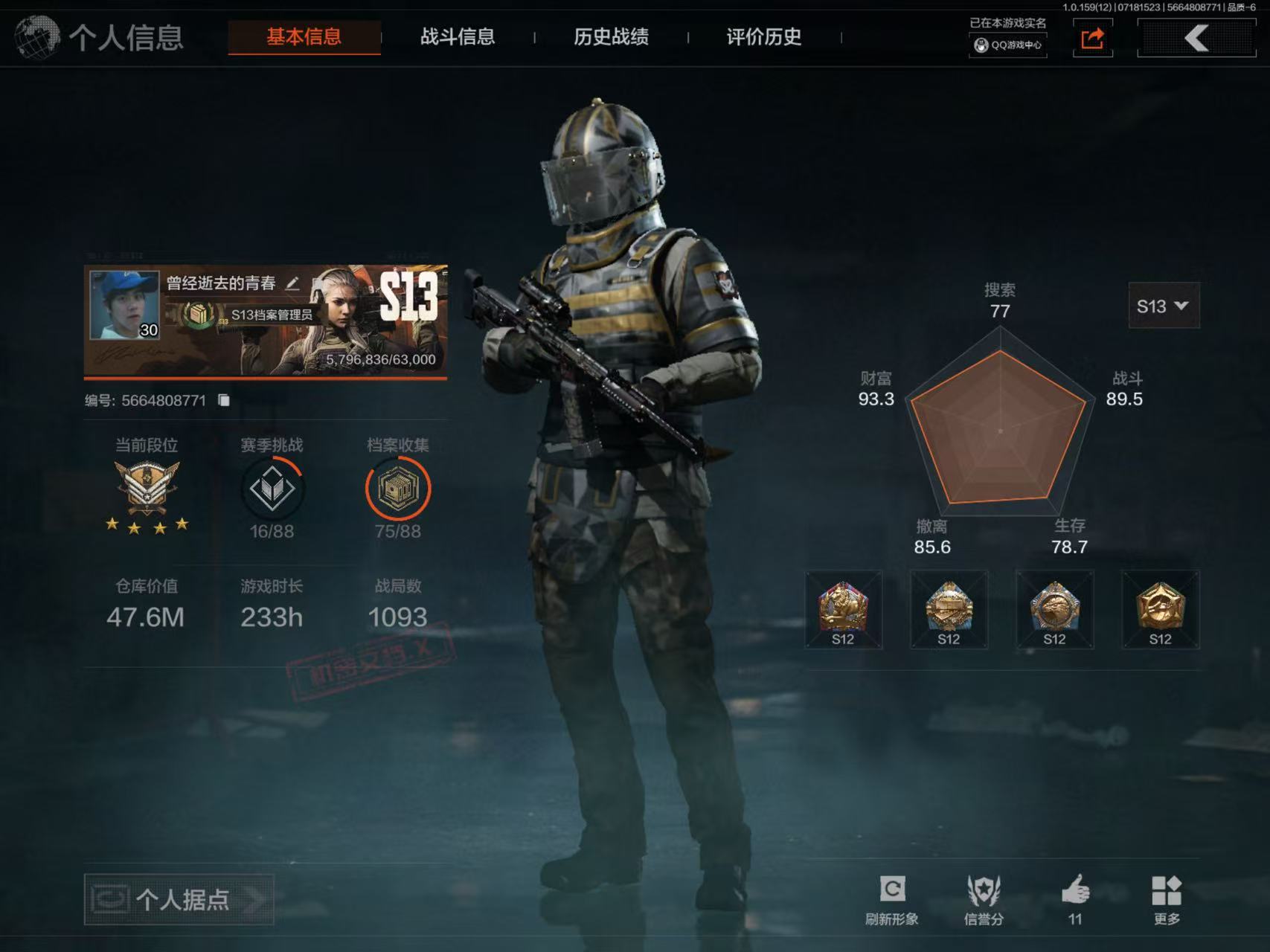 等级:30/段位:暗区传说/仓库价值(百万):92.5