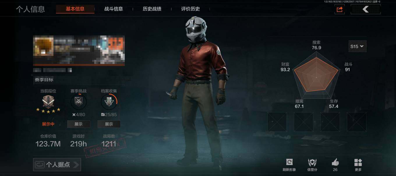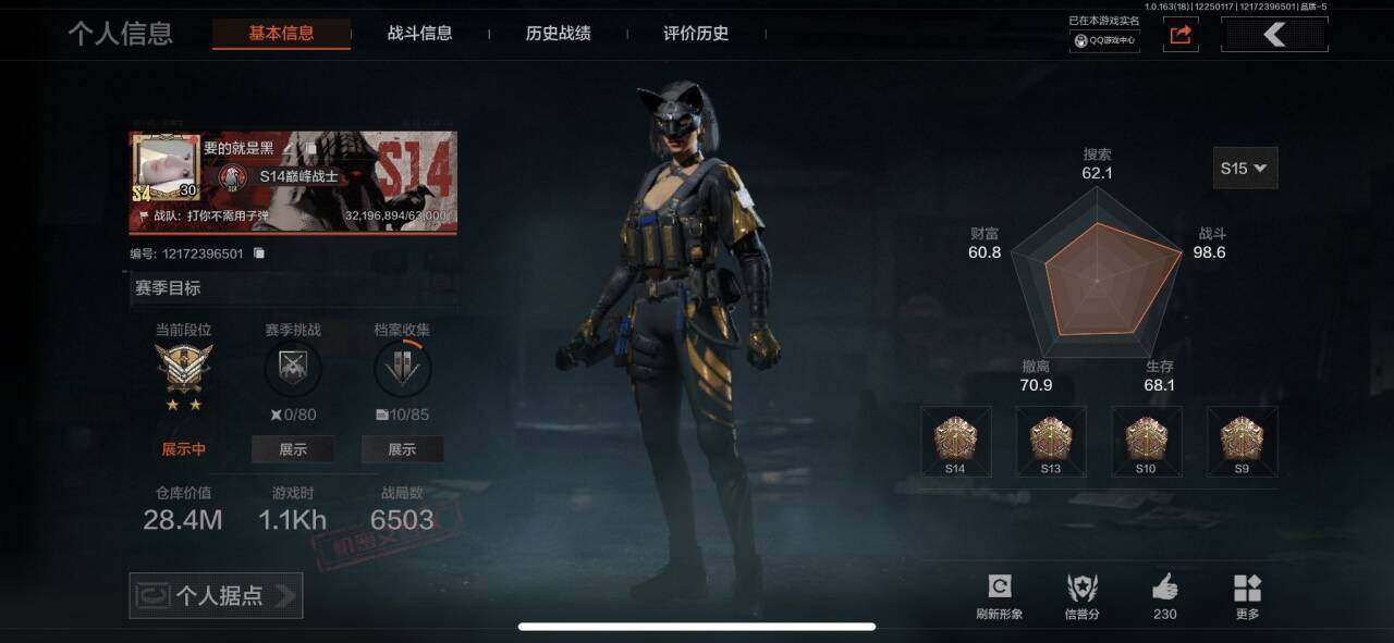 等级:30/段位:暗区传说/仓库价值(百万):15.6/柯恩币:126832/