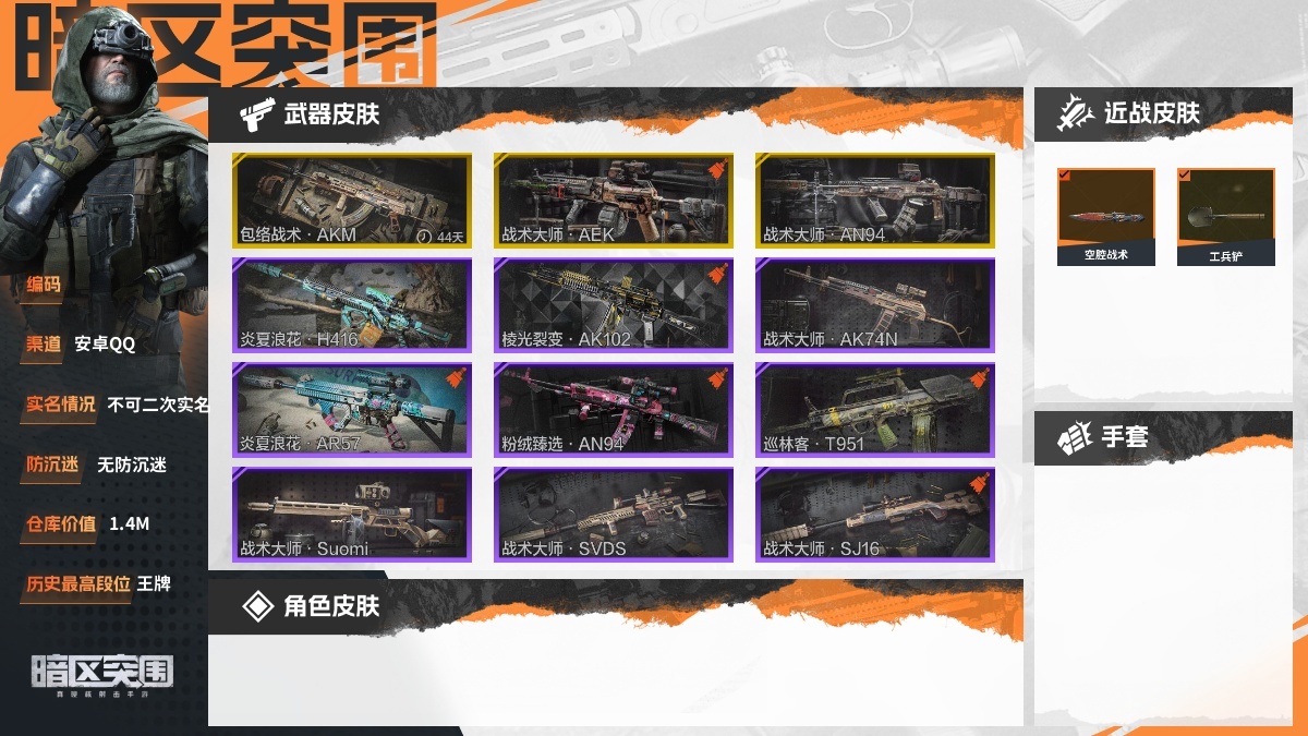 30级,刀皮2,紫枪皮12,历史最高段位:暗区传说,仓库价