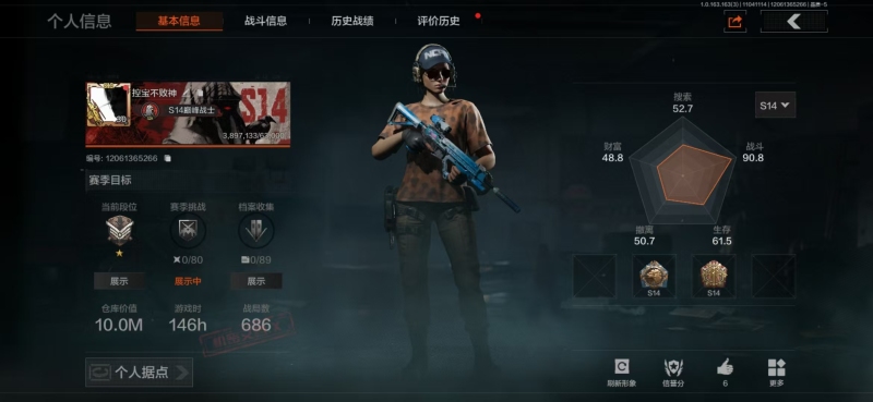30级,刀皮3,金枪皮2,紫枪皮21,历史最高段位:暗区传