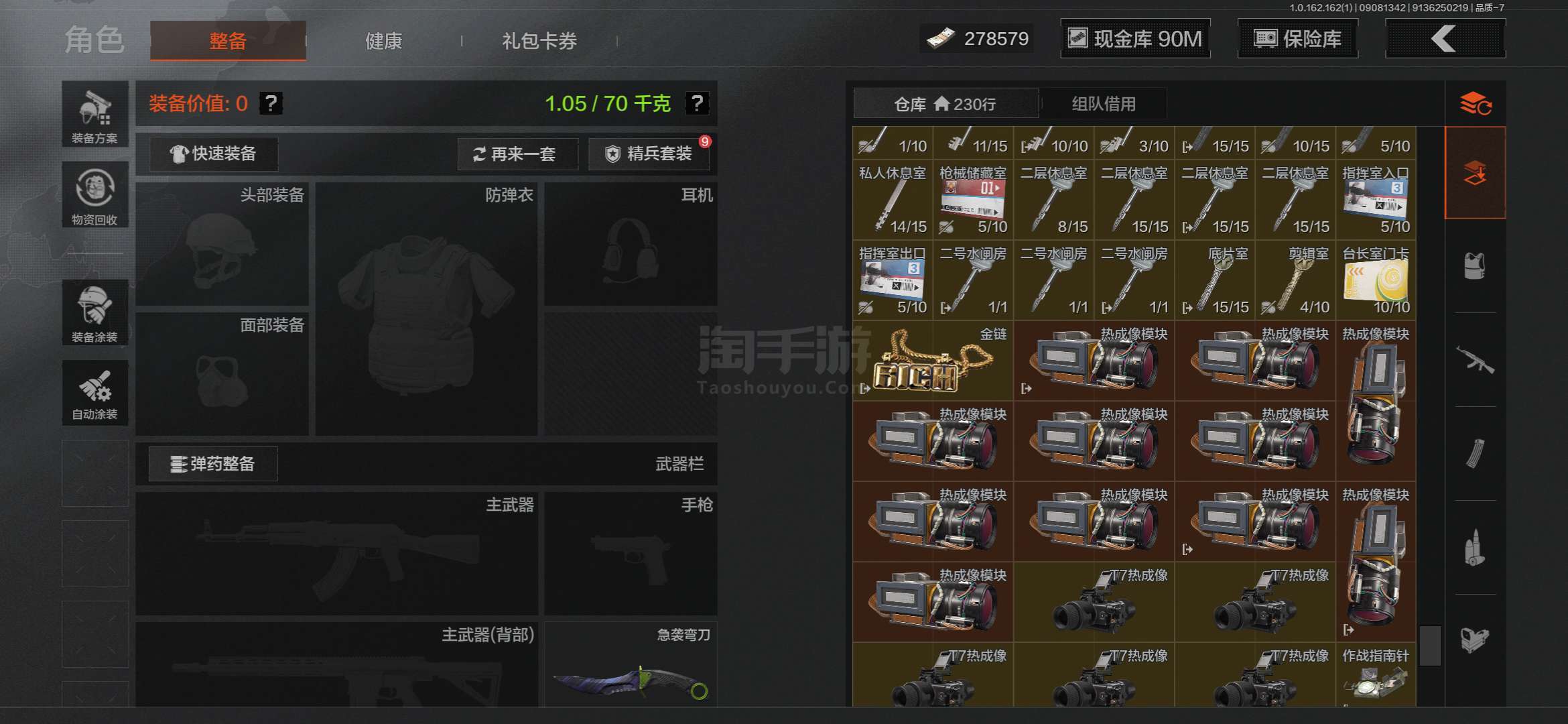 暗区极品号,两把刀皮裁决手杖剑和明刀绣春,有3套服装,两个金色挂饰,仓库十m有满改枪一堆金弹,可小刀