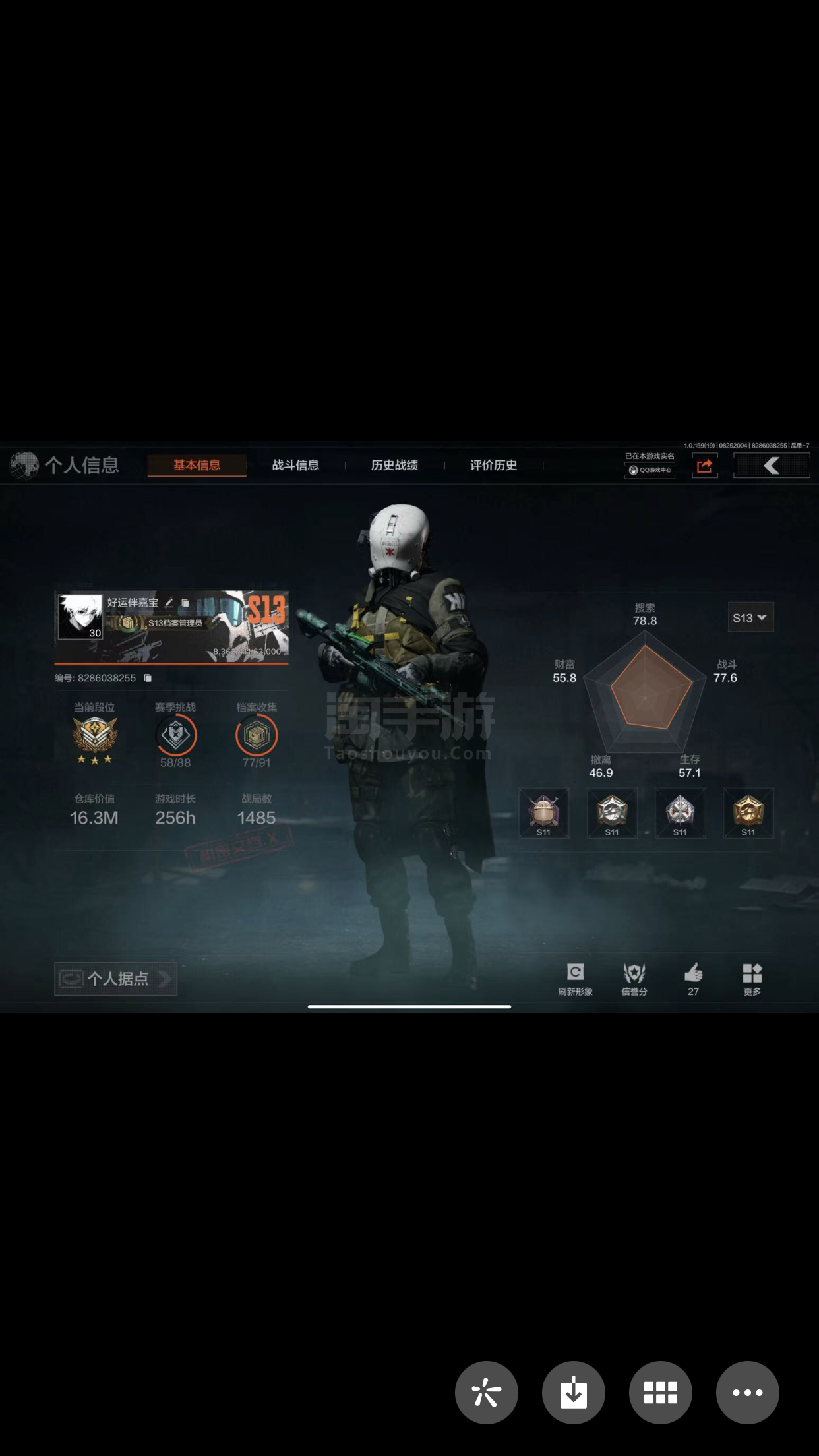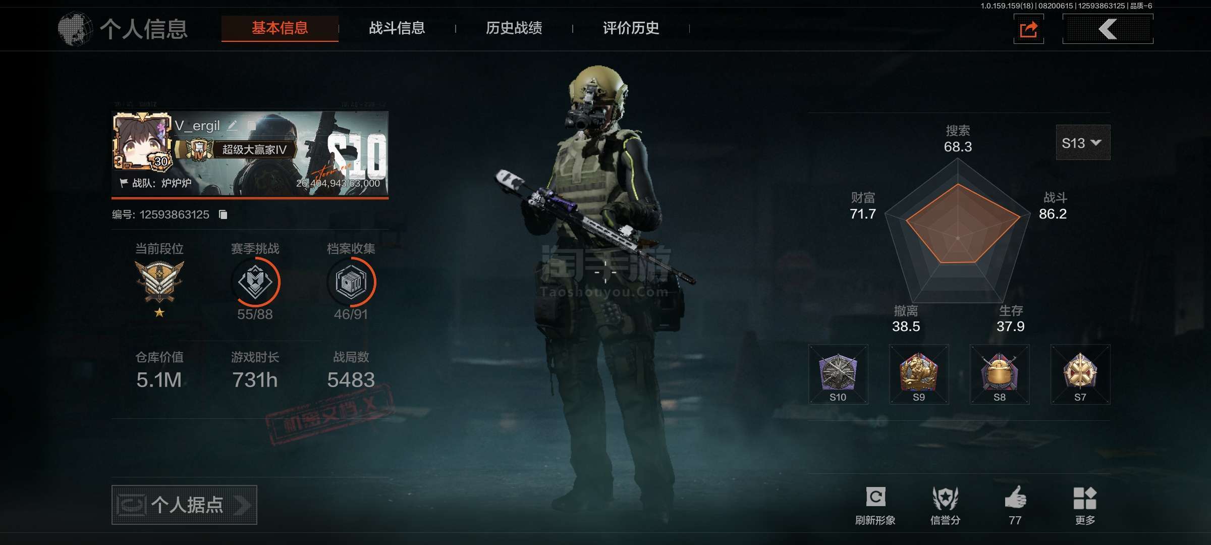 30级,历史最高段位:暗区传说,仓库价值:31.5M,柯恩币数量:1756K,点券数量:18,