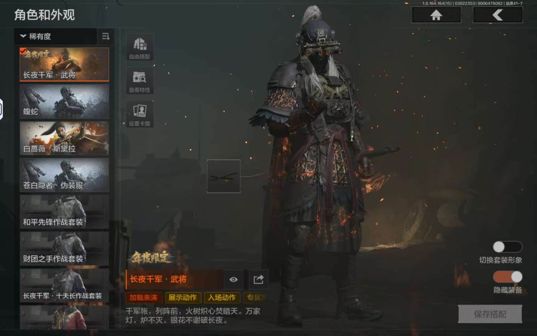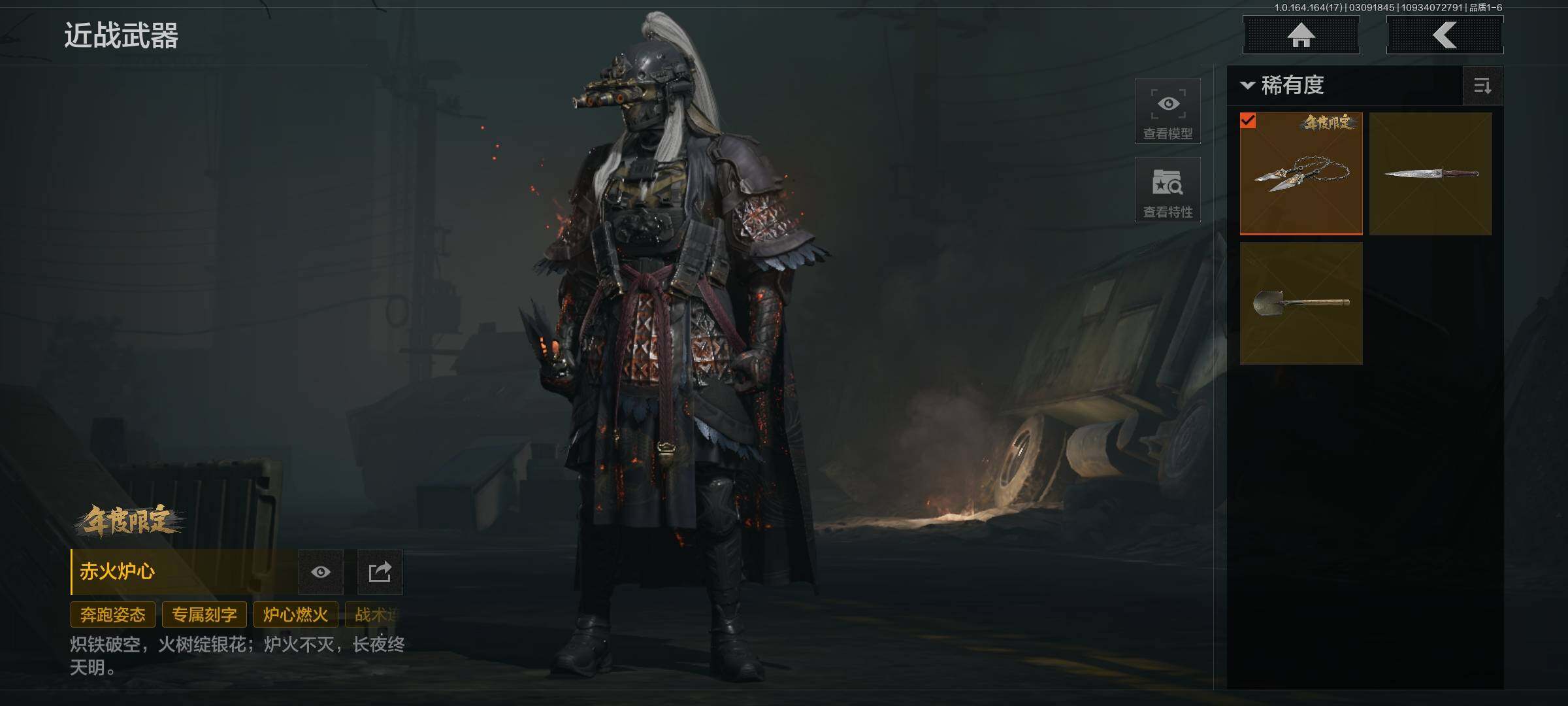等级:30/段位:专家/仓库价值(百万):92/柯恩币:85000000/赤火炉心/突击匕首/工兵铲/镀火熔金H416/百锻铁骑AEK/长夜千军武将