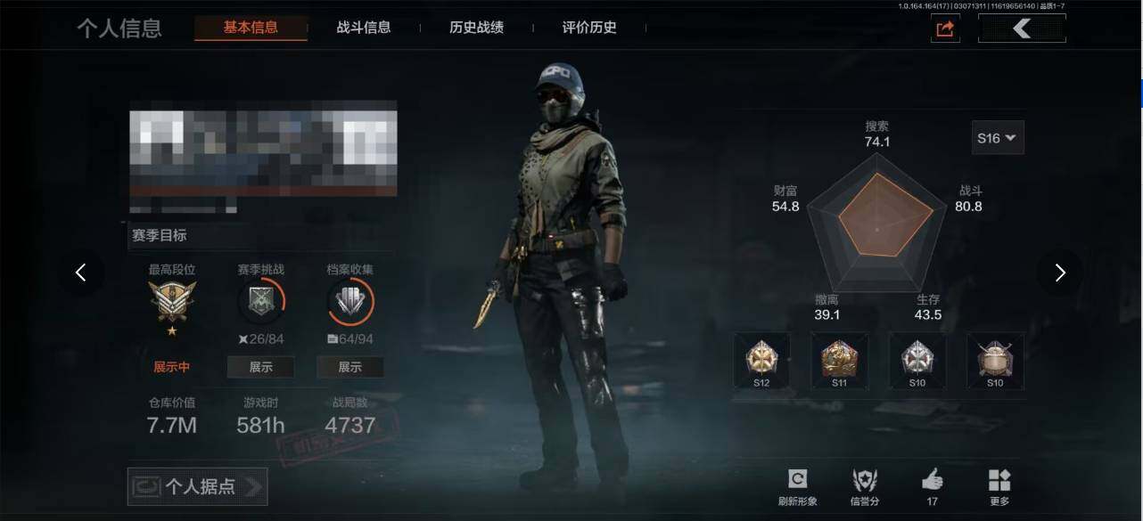 等级:30/段位:大师/仓库价值(百万):7.7/赢家匕首/工兵