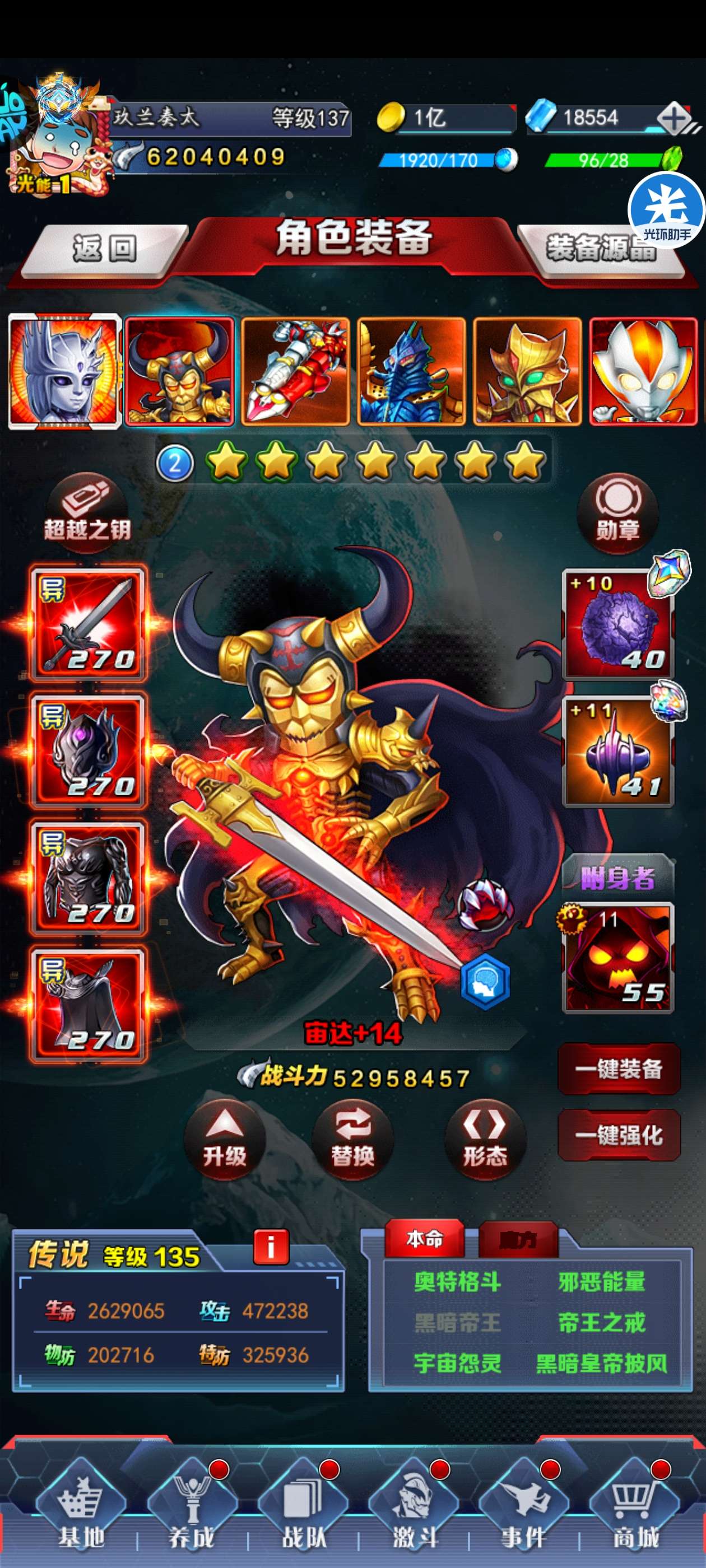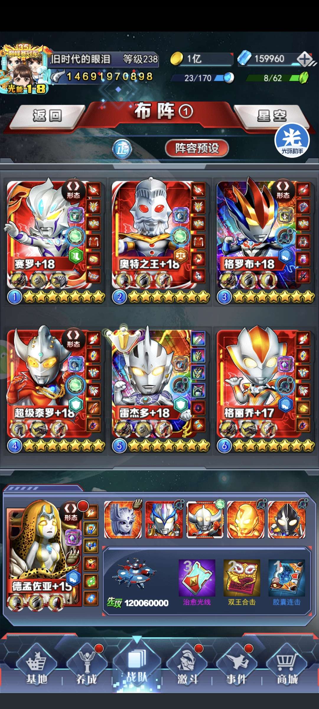 主推小金人+17,战力24亿,满本命,有专属红变,3个三代红,副推光赛,高修炼,竞技场