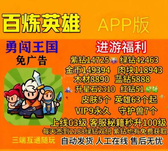 百炼英雄【全服通用】百炼英雄全服通用26W金币,2W+紫钻,8W+绿钻,木头肉块拉满李白圣骑士天使贞德卡卡落地vip