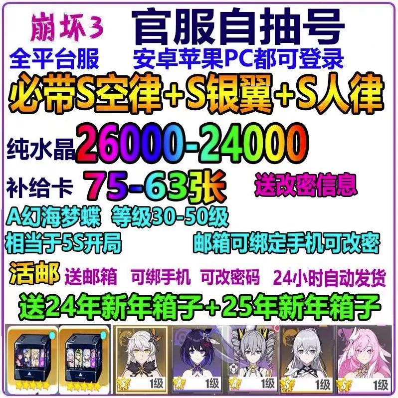 崩坏3rd【全服通用】【全平台服】24000水晶35补给卡+S空律S玉骑士S次生银翼+S自选自选箱+泉之精灵皮肤