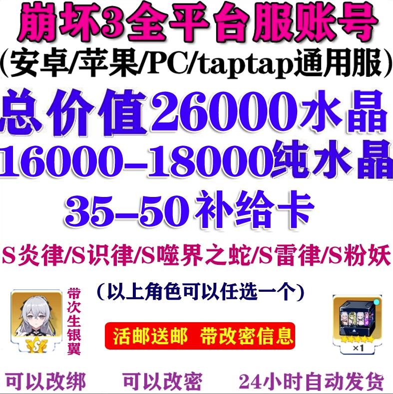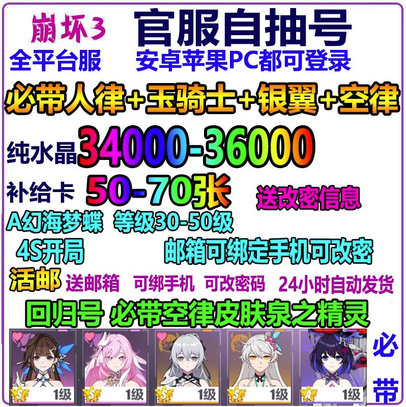 崩坏3rd【全服通用】【全平台服】26000水晶36补给卡+S月痕S银翼S空律+S次生+2个A角色~回归号