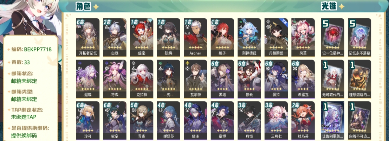 崩坏:星穹铁道【安卓官方】33黄,2命白厄,1命缇宝,瑕蝶,刻律,风堇,1命阮梅,1命Archer