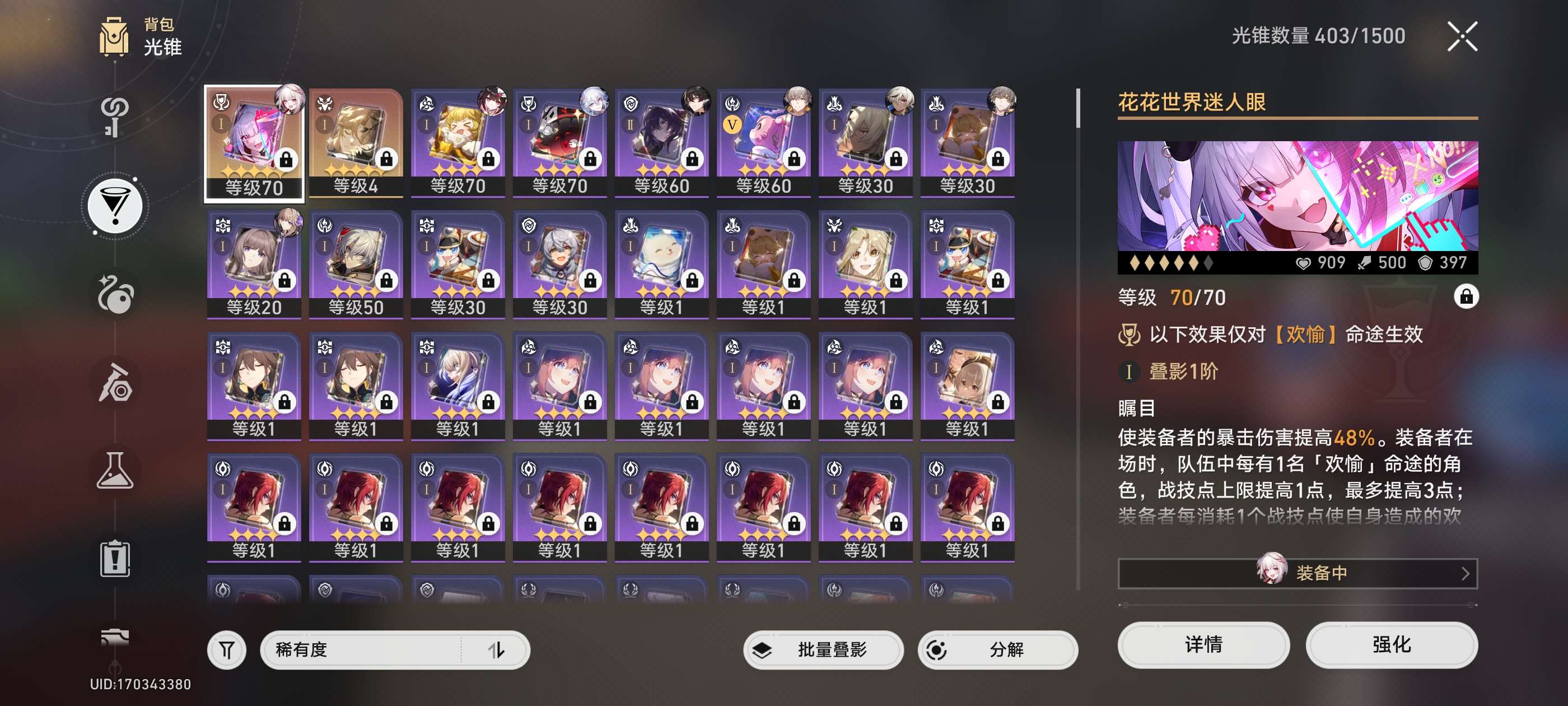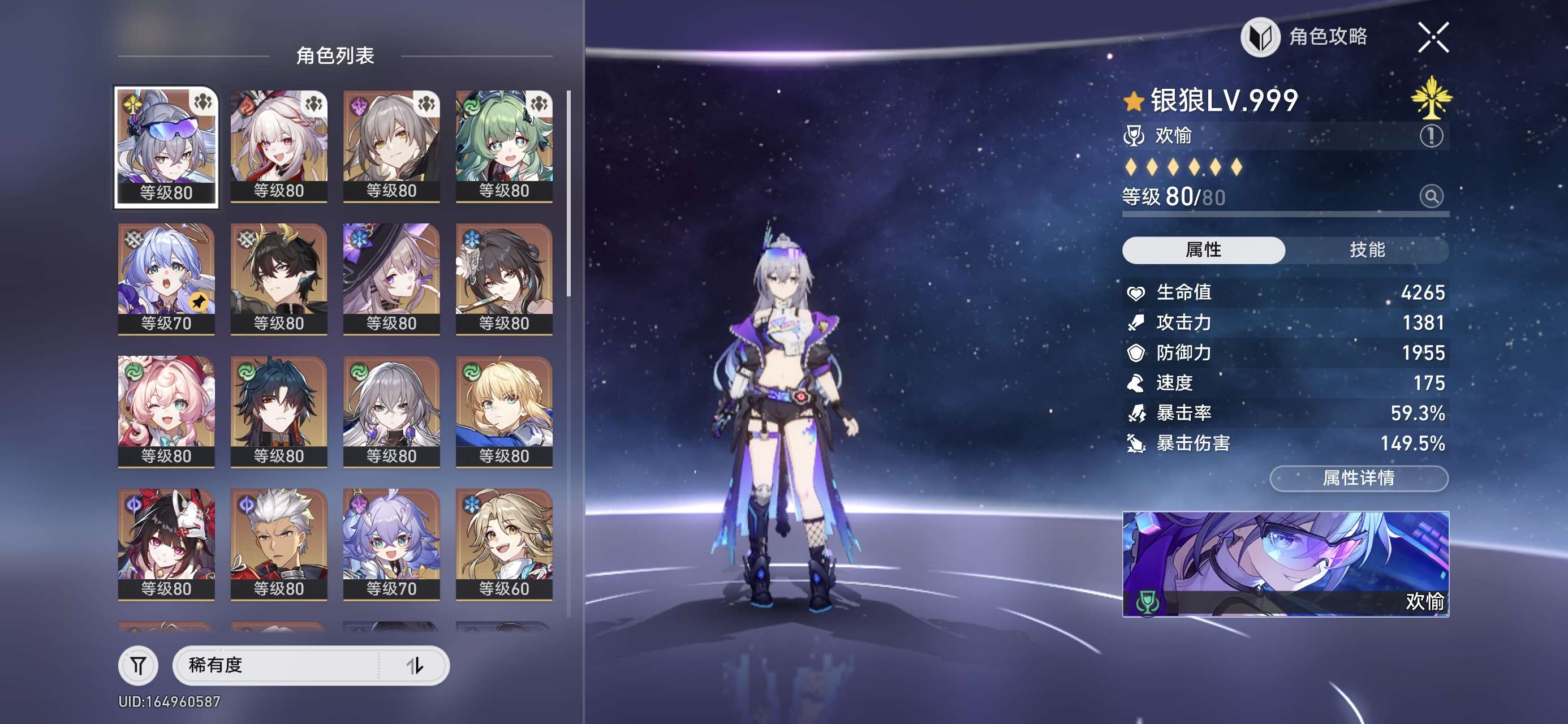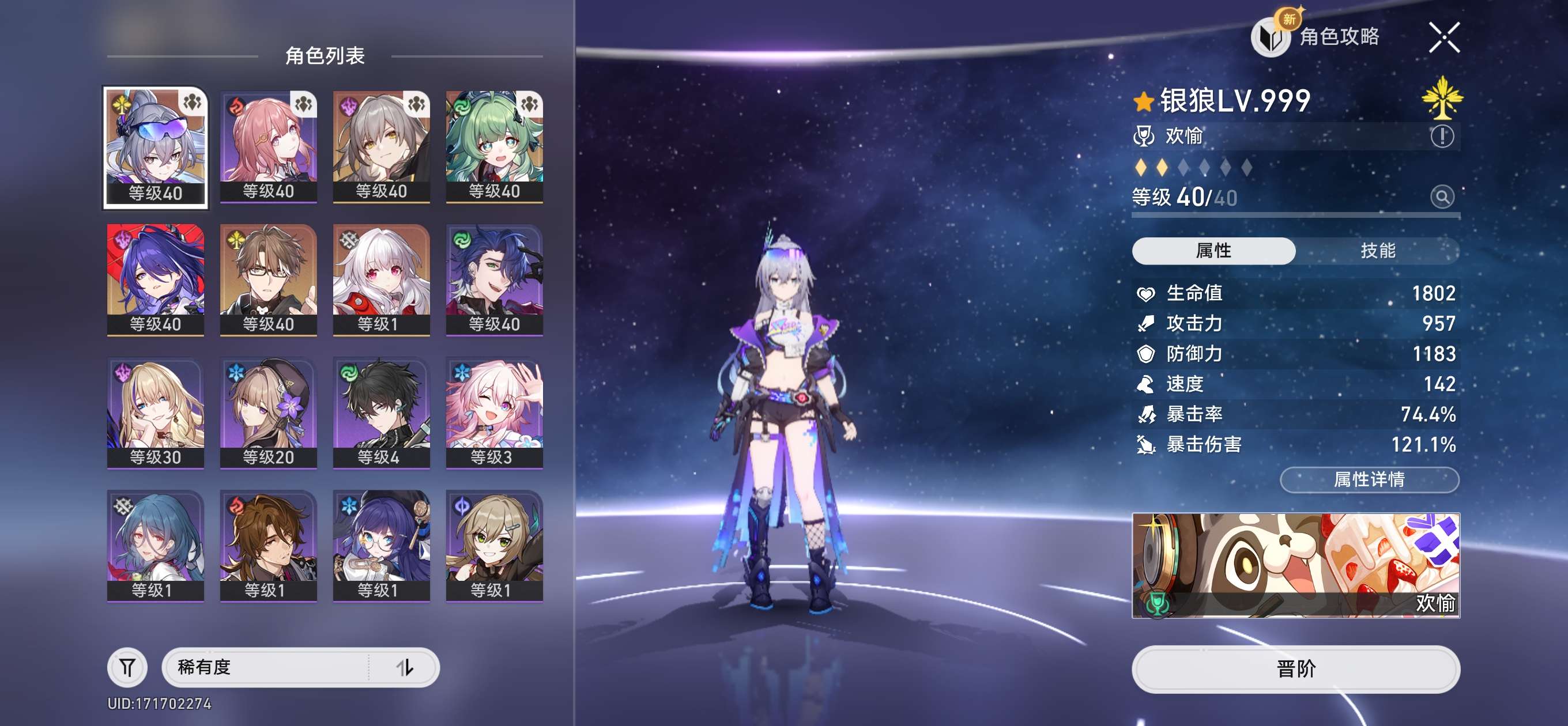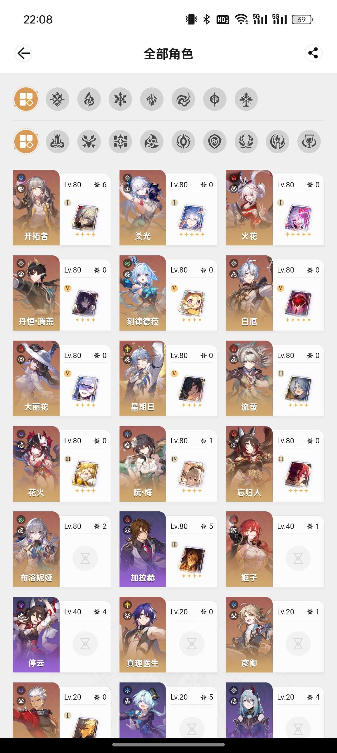 银狼LV999,火花+专武,爻光,花火,丹恒腾荒,罗刹,克拉拉,白露,开拓等级56级武器池已垫54抽