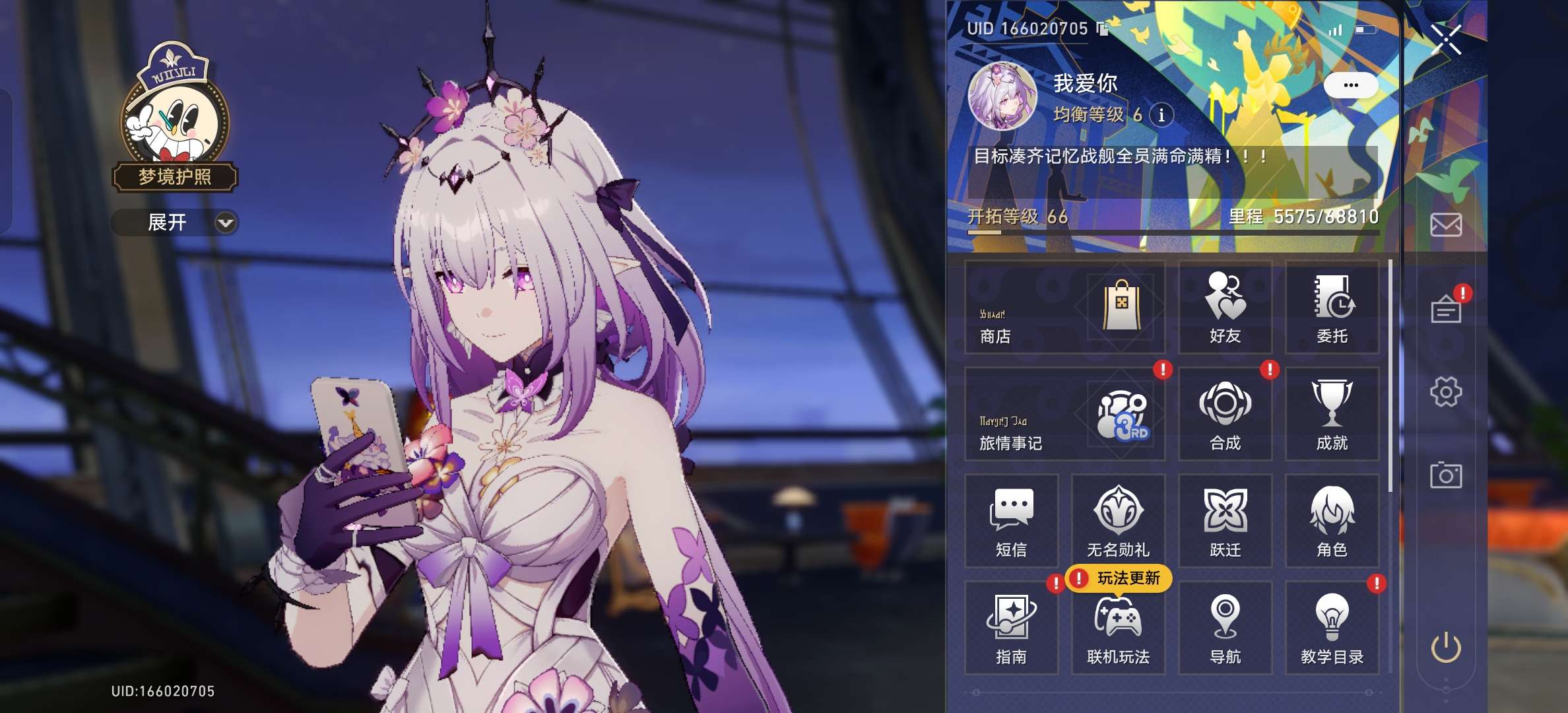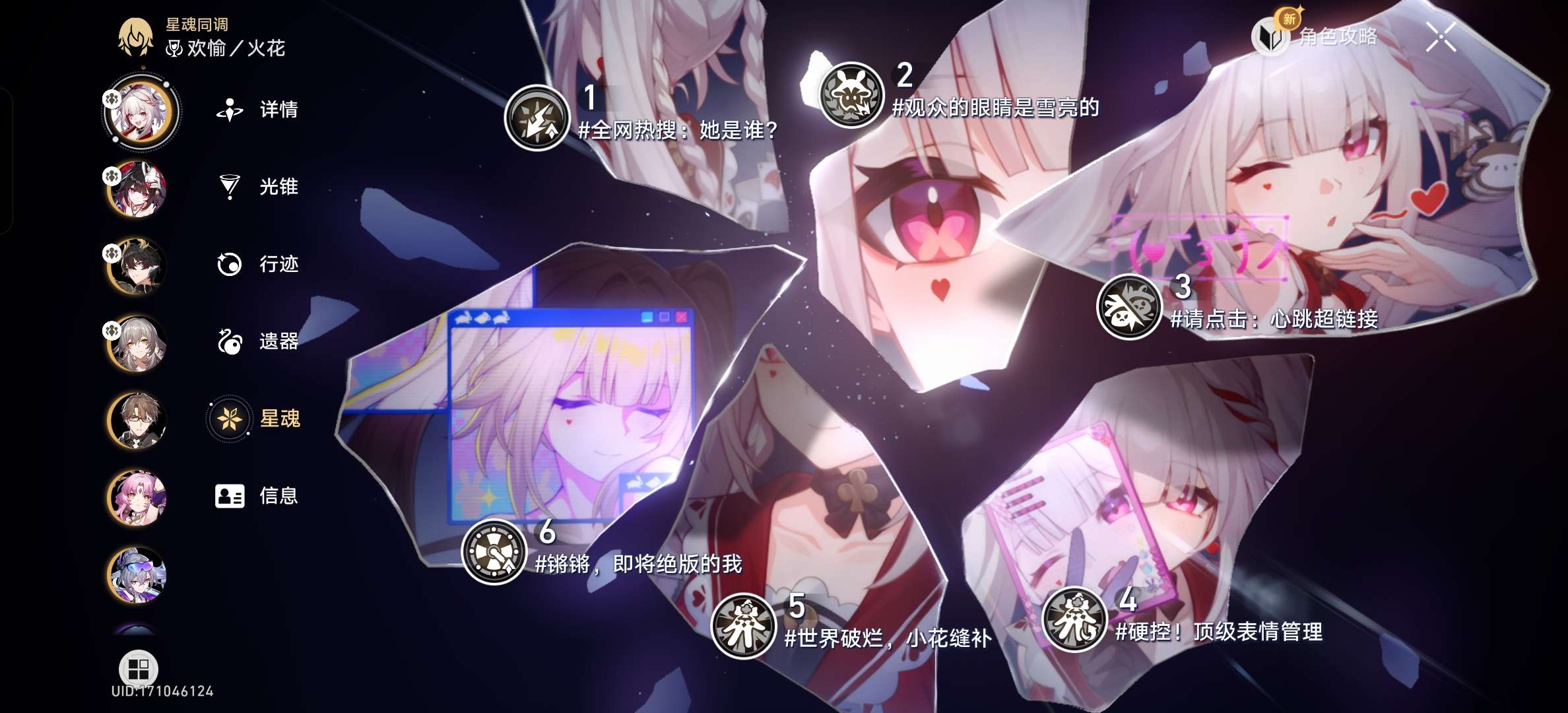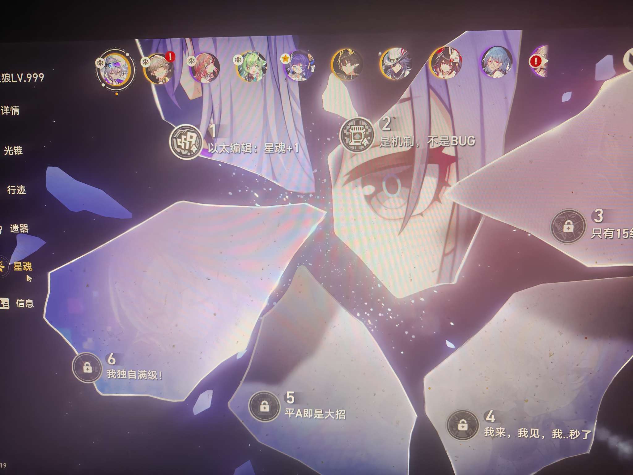 6+1火花0+1爻光,女主,开拓等级 66,黄数 27,11个五星角色,6个五星光锥,19个四星