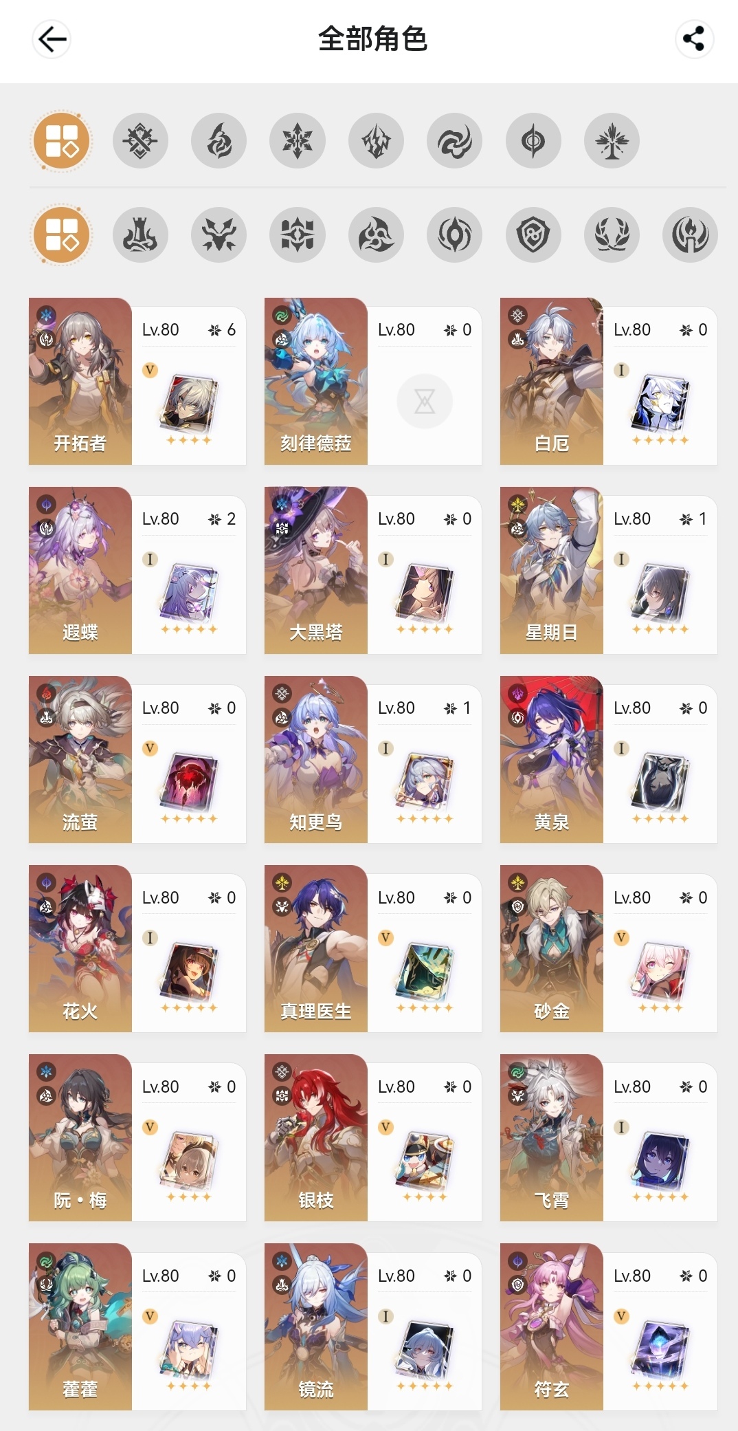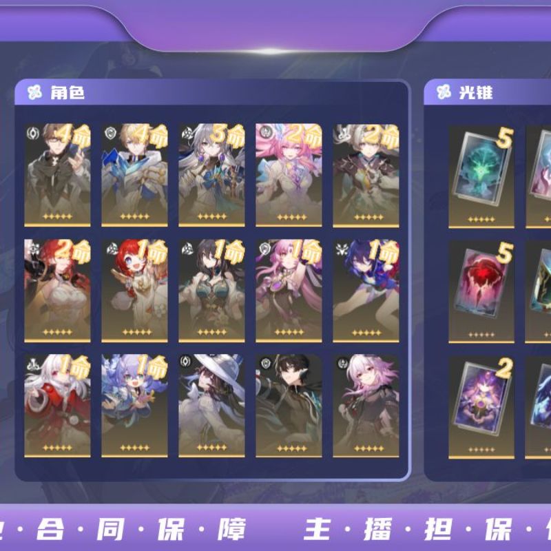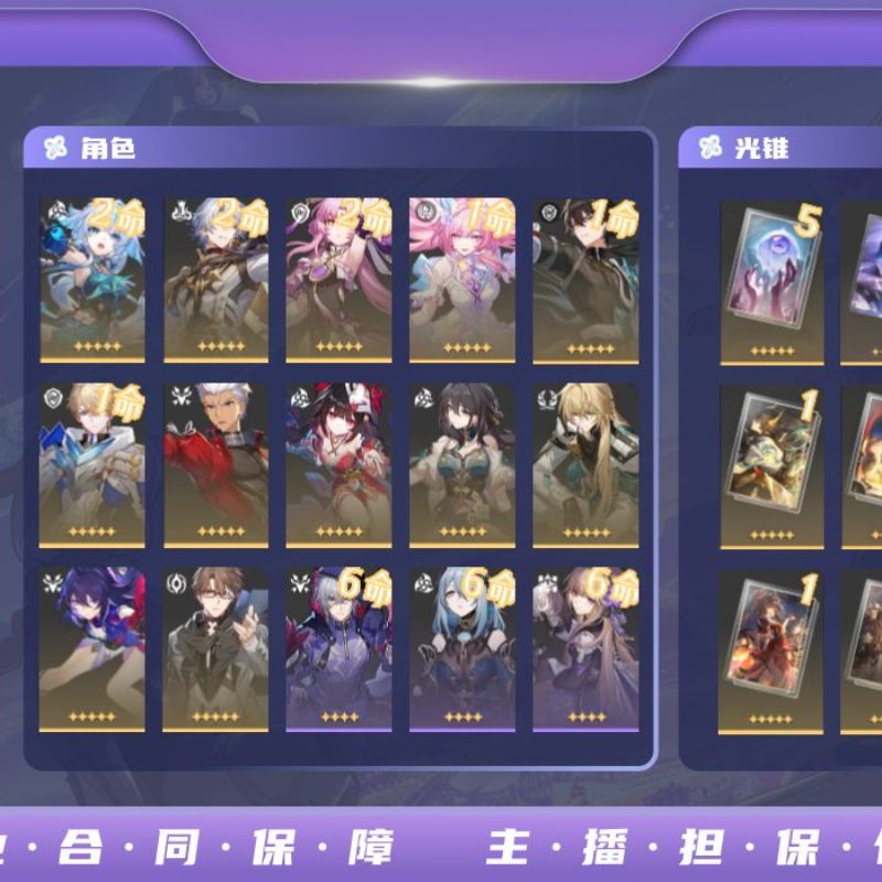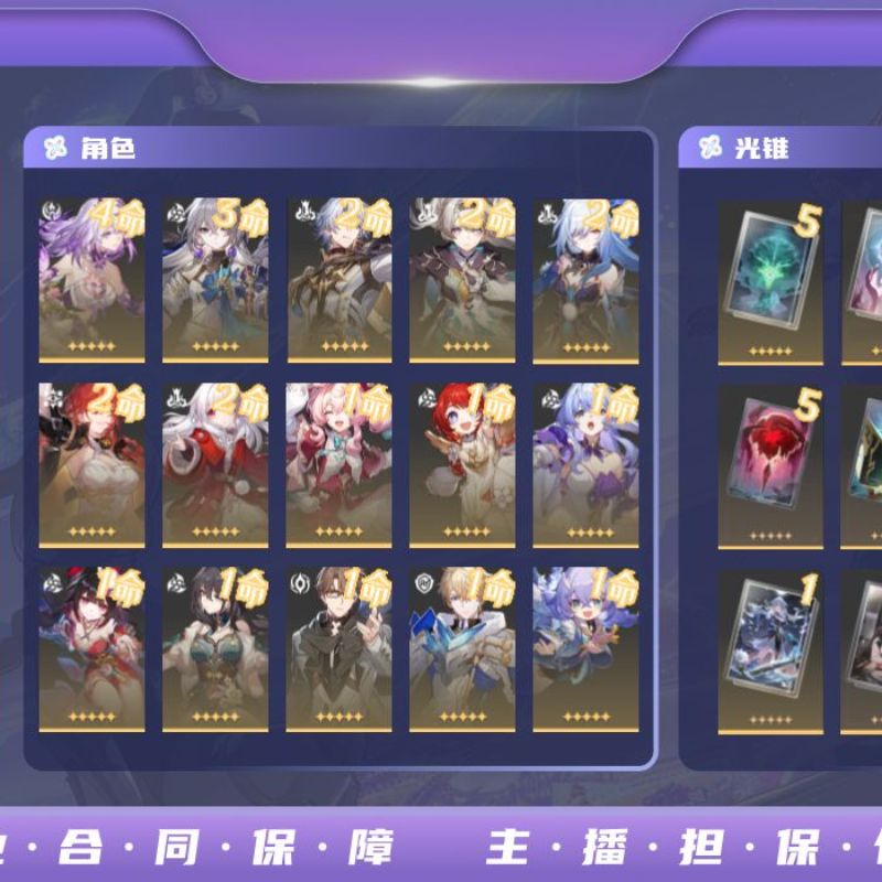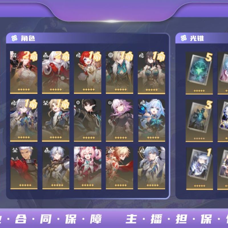 遐蝶2命带专武,知更鸟希儿1命带专武,白厄大黑塔黄泉镜流花火红A刃都带有专武,星期日1命,邮箱未绑定