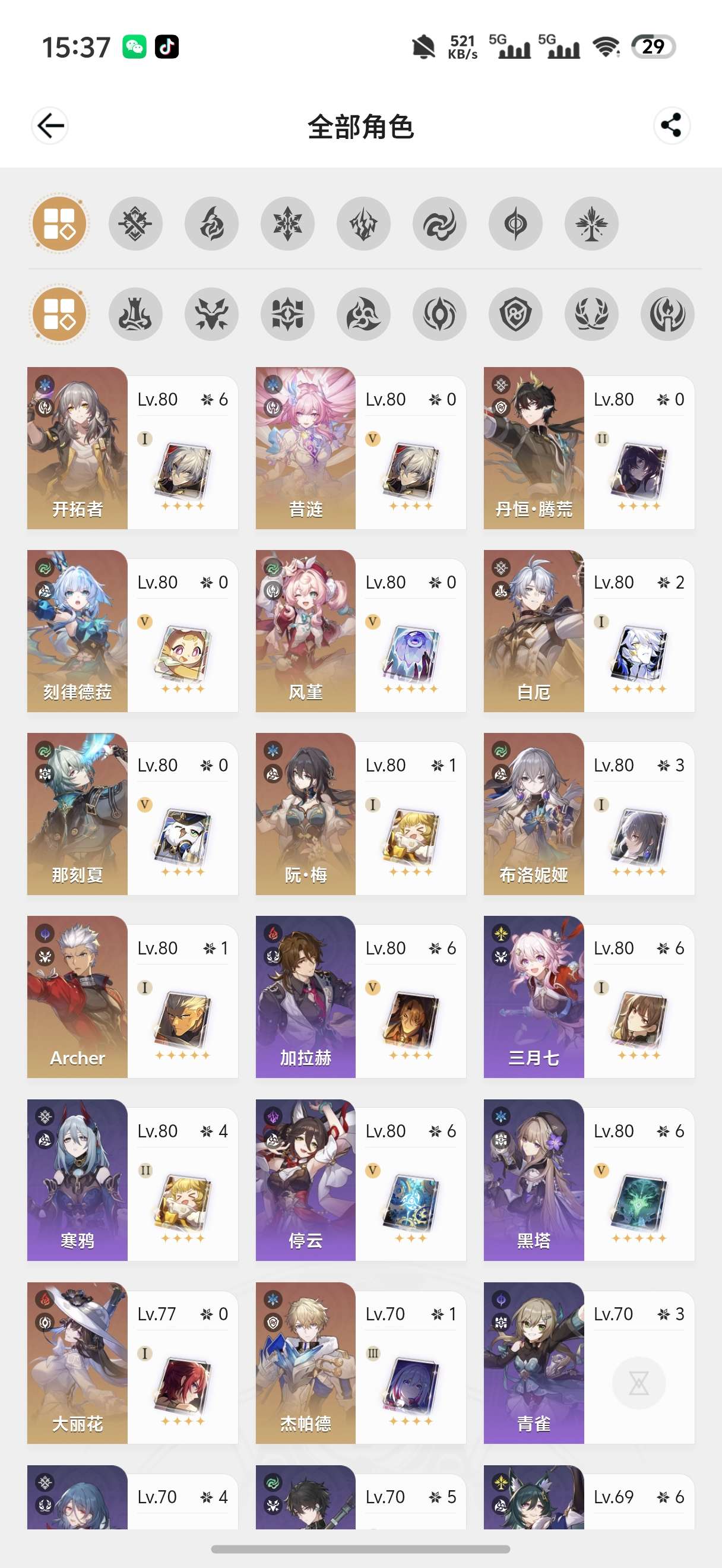 满命大黑塔二命缇宝一命风堇都带专武那刻夏布洛罗刹,带四十多抽