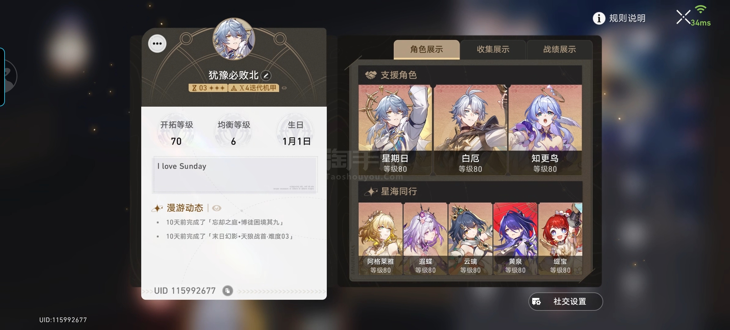 2+1白厄 2+1飞肖 1命缇宝 1命大黑塔 高配追击队 一共 54金 能练的c都练差不多了