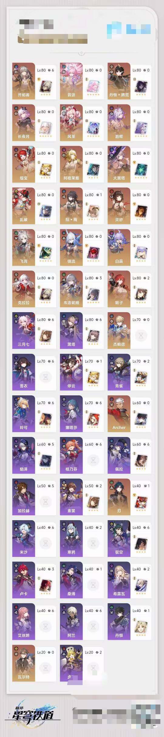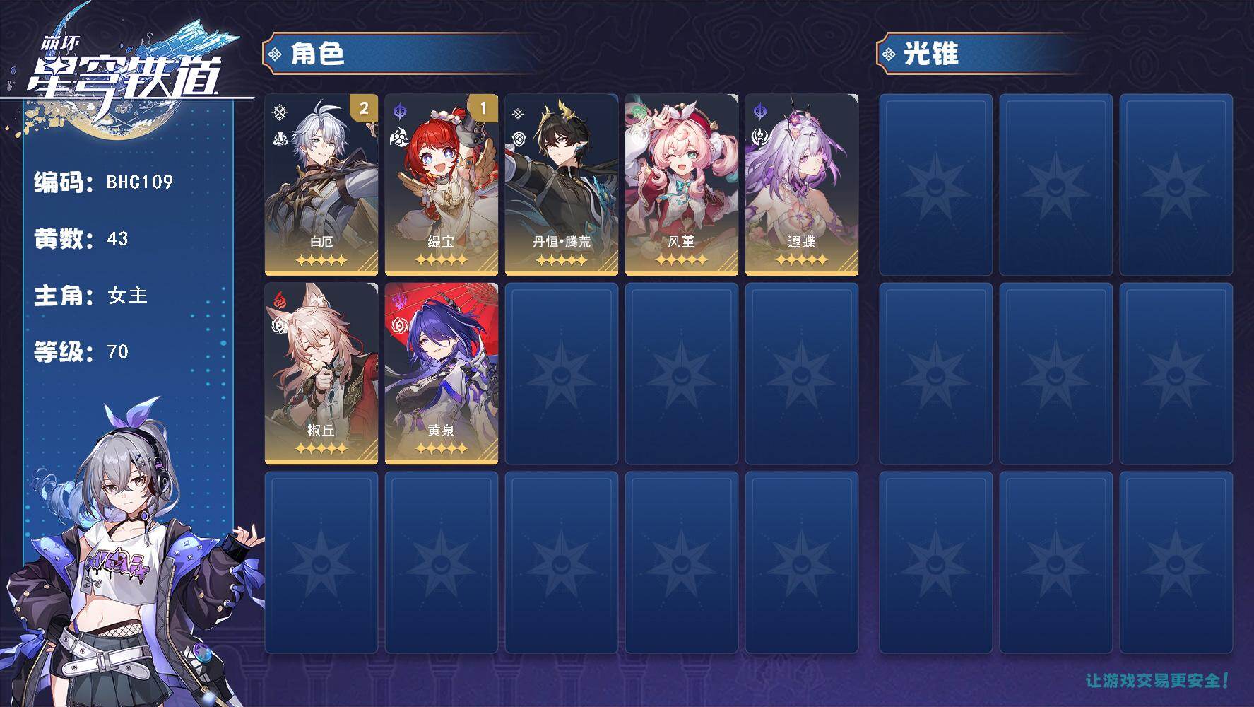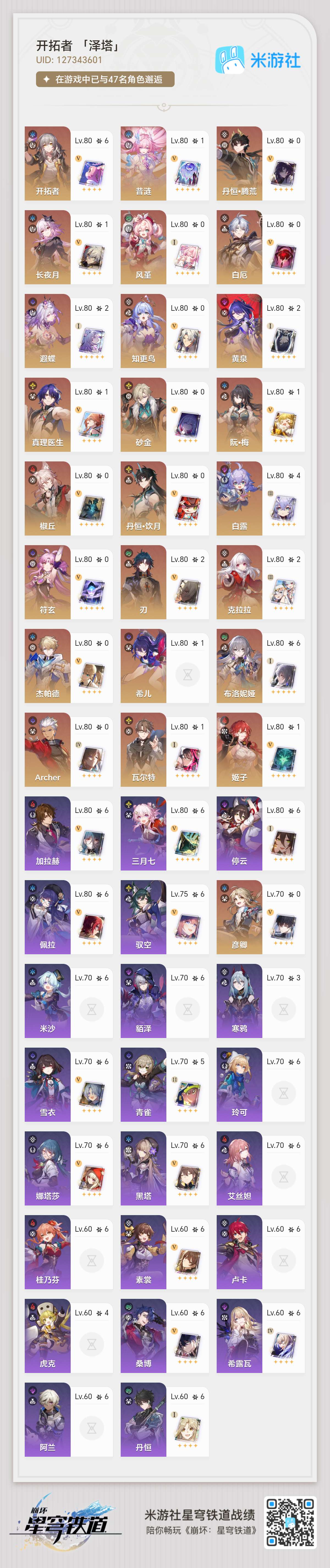等级:70/总黄数:43/女主/角色黄数:27/2命白厄/1命缇宝/0命丹恒•腾荒/0命风堇/0命遐蝶/0命黄泉/0命椒丘