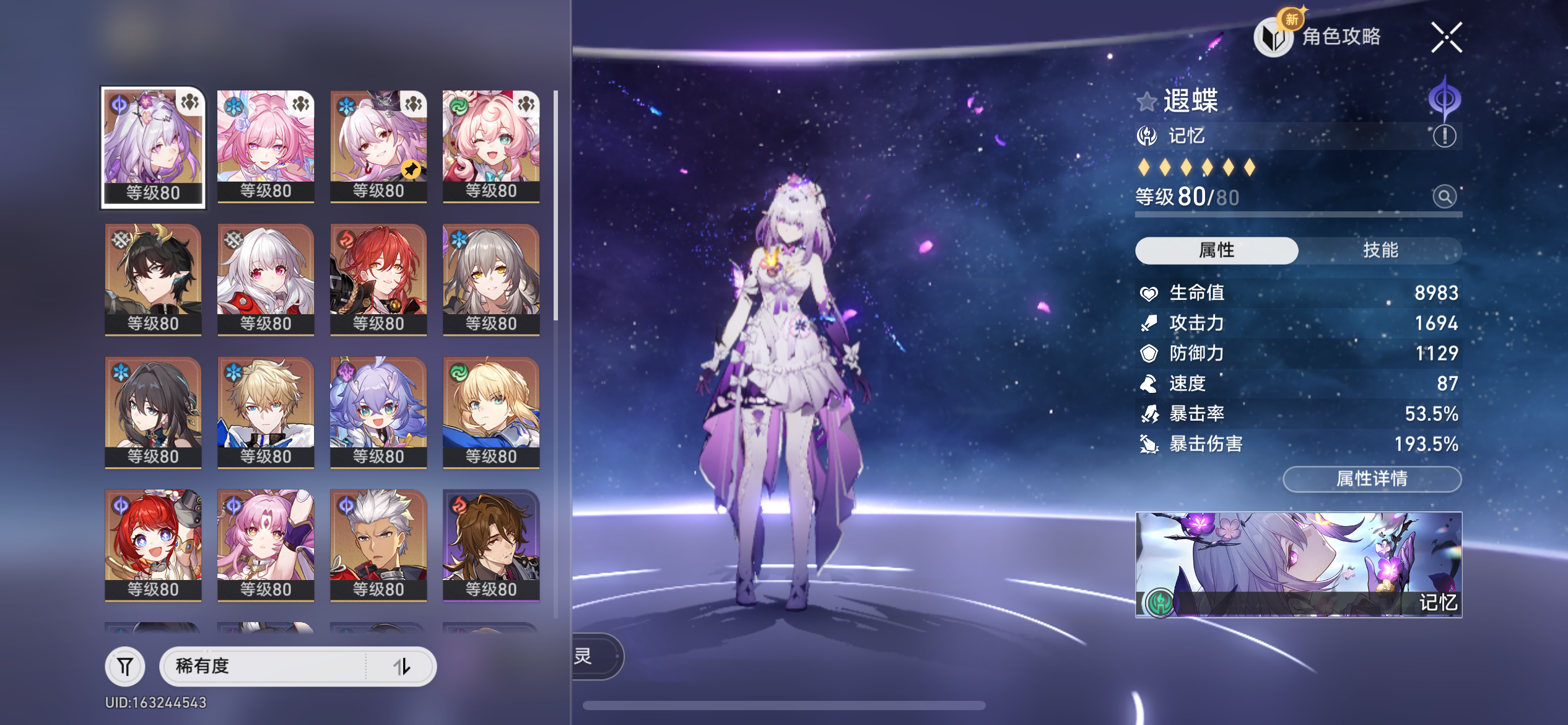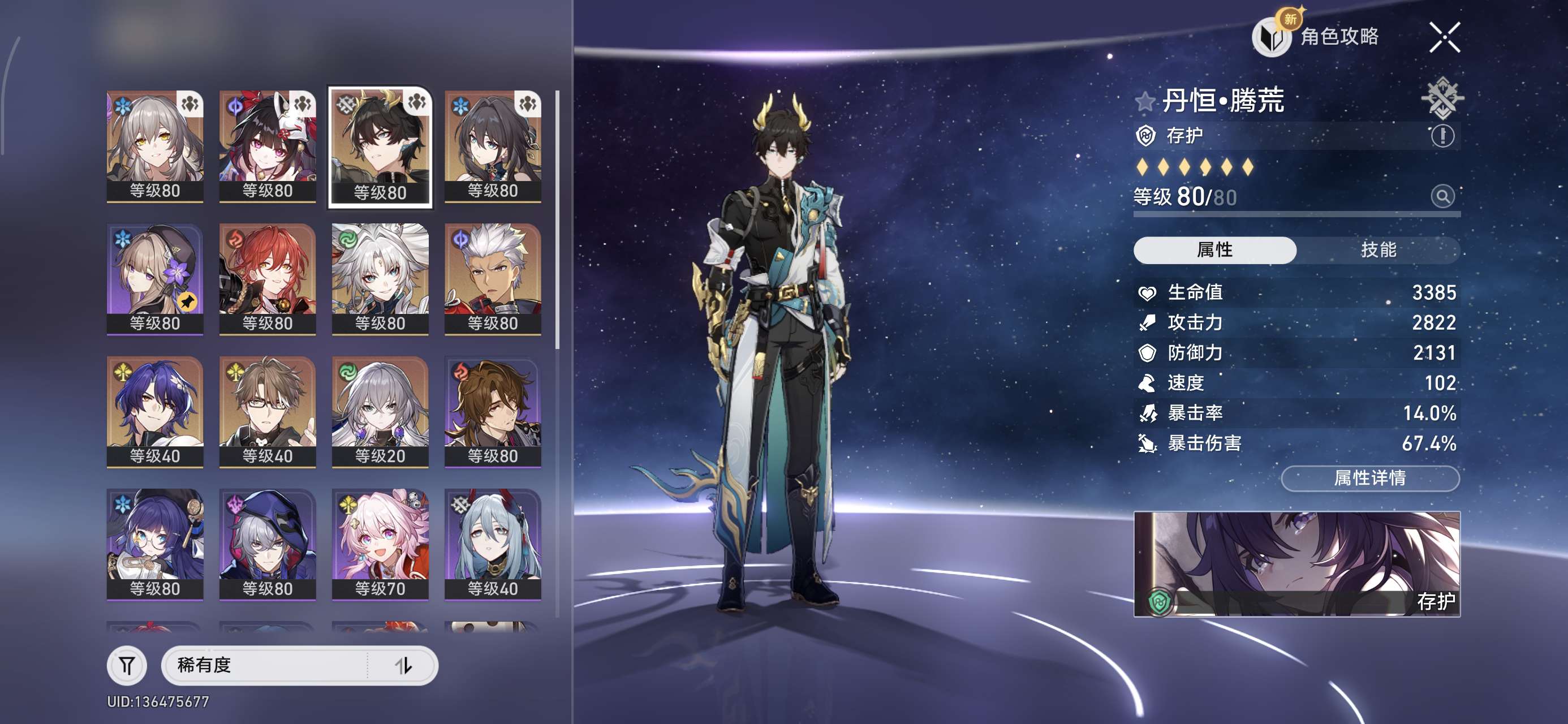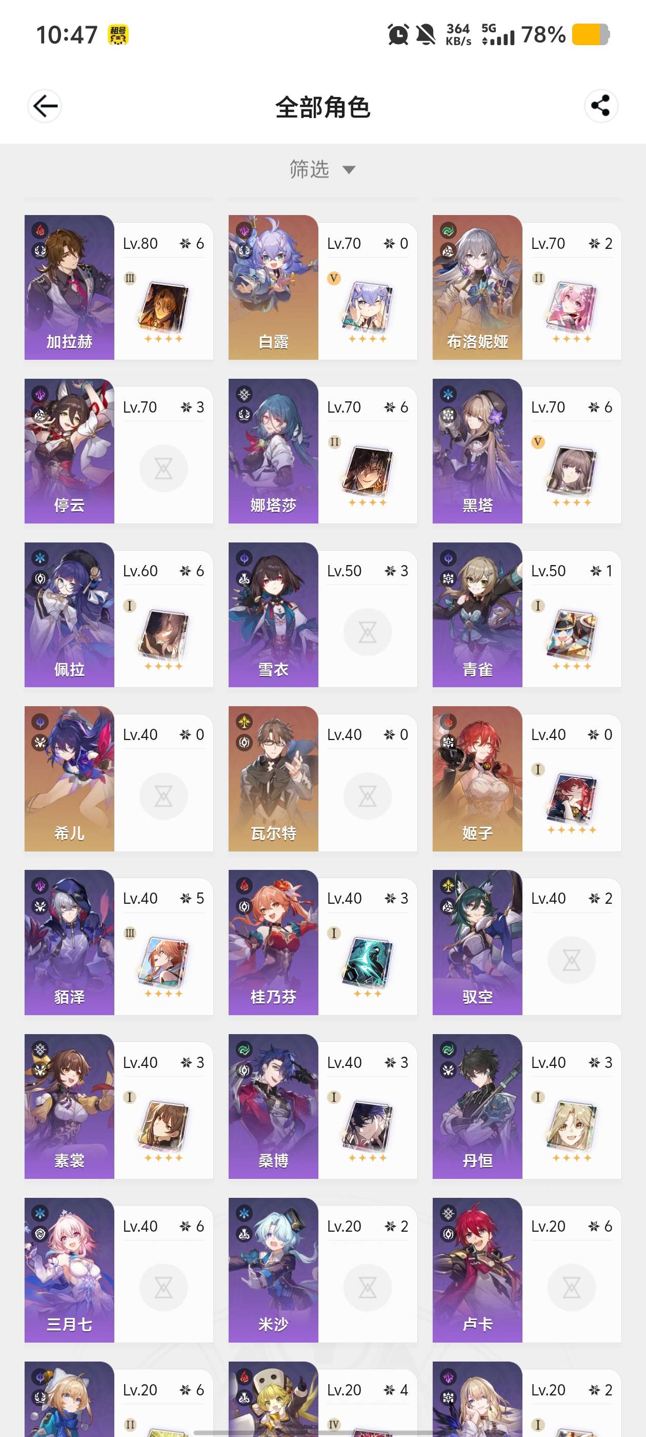 等级:70/总黄数:43/女主/角色黄数:27/2命白厄/1命缇宝/0命丹恒•腾荒/0命风堇/0命遐蝶/0命黄泉/0命椒丘