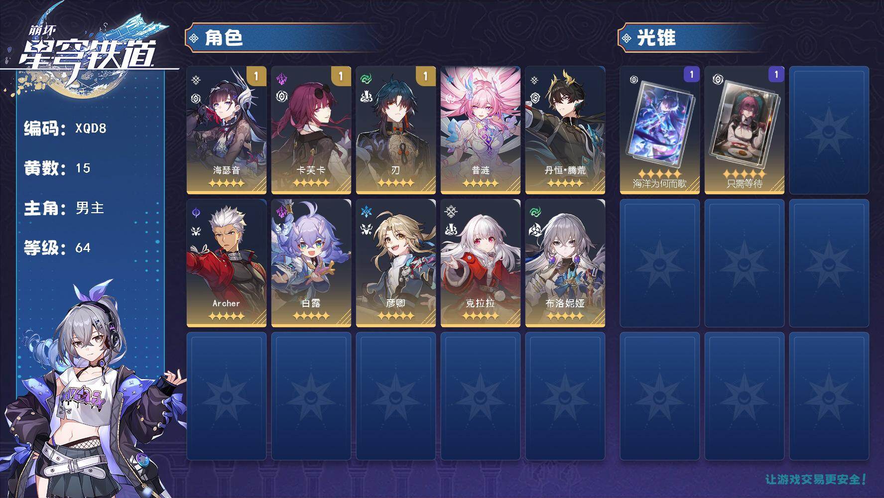 等级:60/总黄数:5/男主角色黄数:5/昔涟/丹恒•腾荒/姬子/Archer/杰帕德