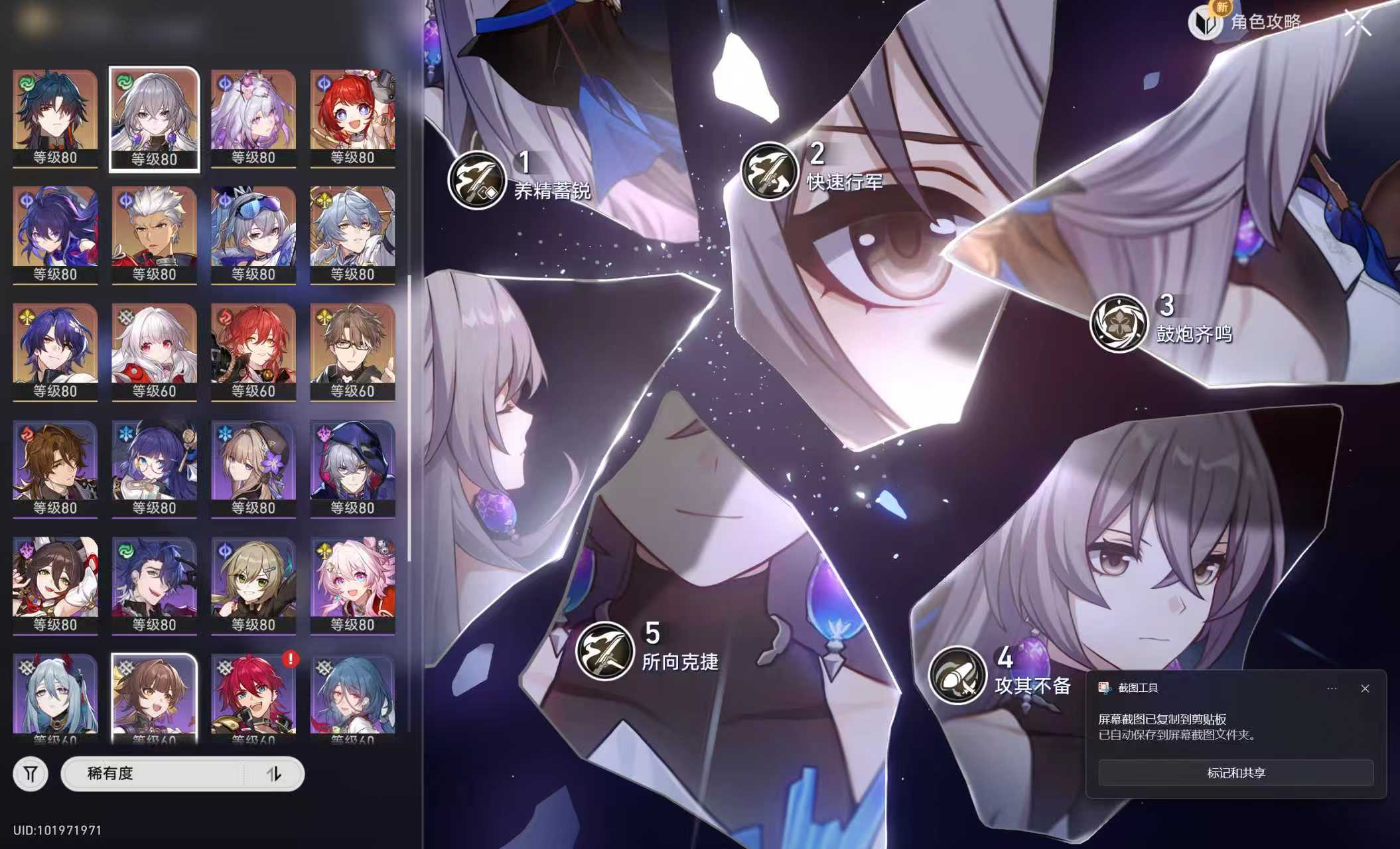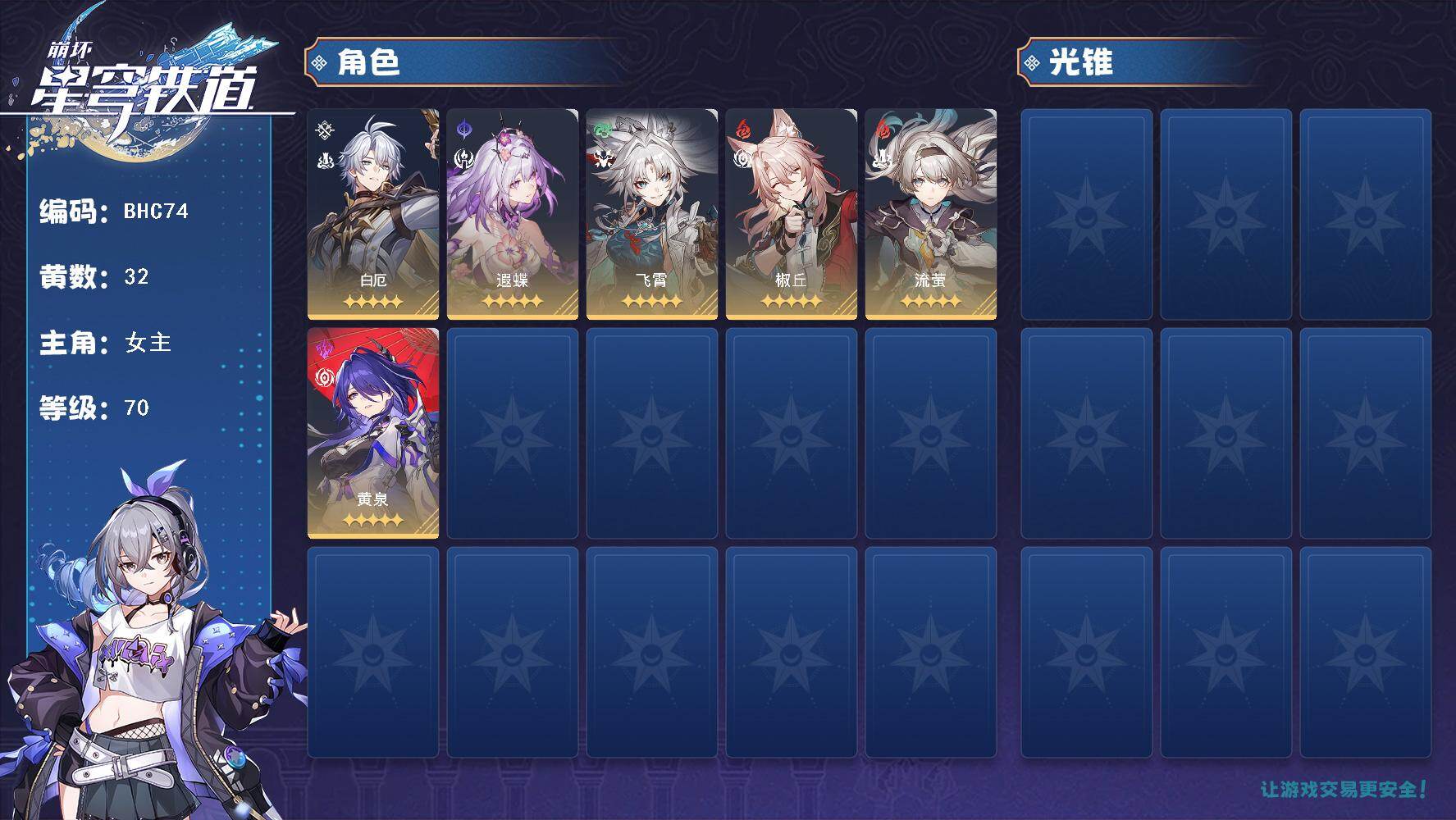 等级:70/总黄数:32/女主/角色黄数:26/0命白厄/0命遐蝶/0命流萤/0命黄泉/0命飞霄/0命椒丘