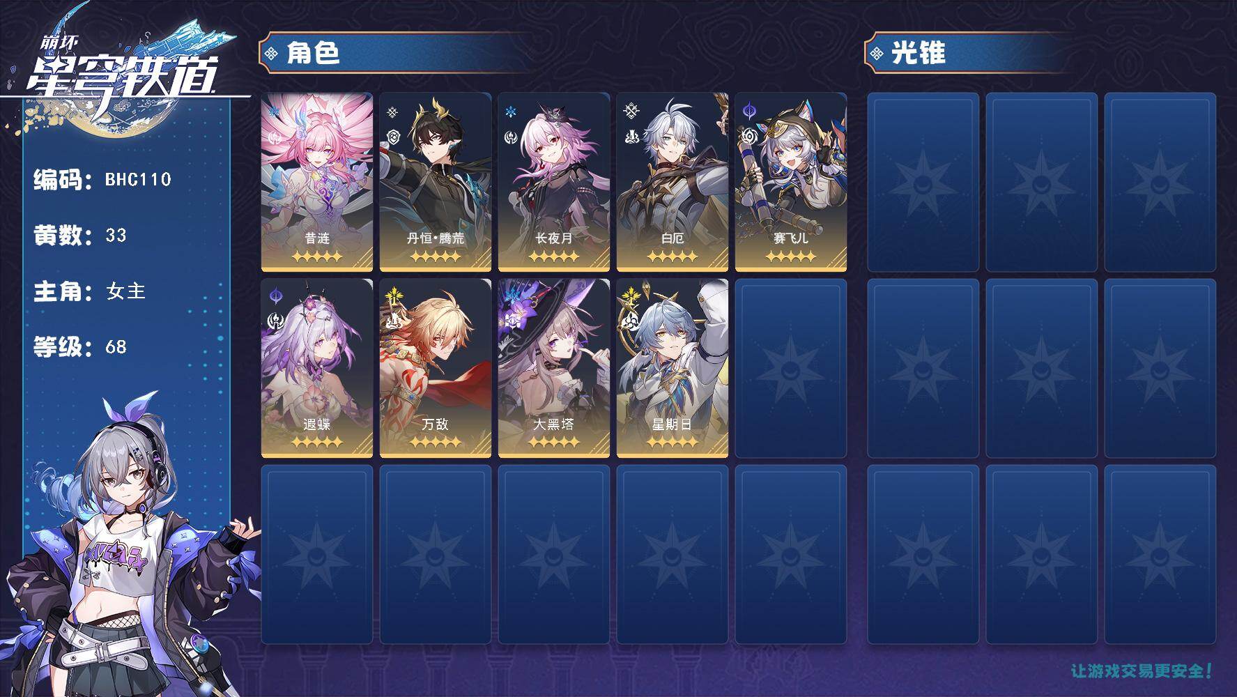 等级:68/总黄数:33/女主/角色黄数:31/0命昔涟/0命丹恒•腾荒/0命长夜月/0命白厄/0命遐蝶/0命赛飞儿/0命万敌/0命大黑塔/0命星期日